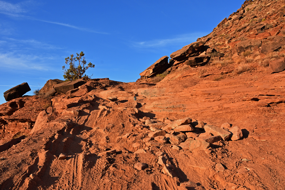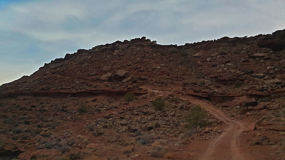 Jetzt, ganz kurz vor dem Ziel, stellen wir fest, dass es sich dabei um eine Felsrippe handelt, die auf einer sandigen, von Stufen und (von Vorfahrern gegrabenen) Löchern durchzogenen, schmalen Piste erklommen werden will.