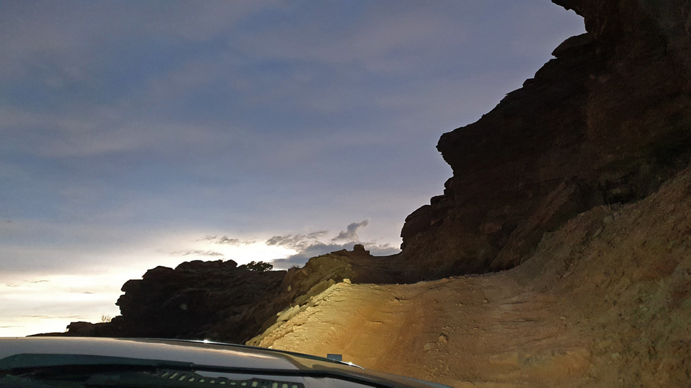 Aus den 5.5 h waren vor lauter Staunen und Fotografieren 7 Stunden geworden und es wird nun schnell dunkel. Ozy weiss, dass er genau eine Chance hat, hinaufzuklettern – rückwärts möchte er diesen seitlich steil abfallenden Anstieg nicht rollen müssen, um nochmals Anlauf zu holen. Also Untersetzung ‘rein und stetig über alle Steine und Stufen hochkraxeln, ohne, dass er viel sehen würde. Ich halte den Atem an und bete, dass das gut geht. Doch Ozy hat es natürlich wieder voll im Griff und sehr erleichtert kommen wir gut oben an. Braves Auto! Und braver Ozy!