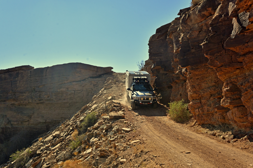 Sobald wir weiterfahren, wird uns auch klar, wieso: ab hier wird die «Erdstrasse» zur Piste. Der felsige, mit kleinen Rippen, Unebenheiten und der gelegentlichen Stufe durchzogene Boden erlaubt meistens nur noch Schrittempo…