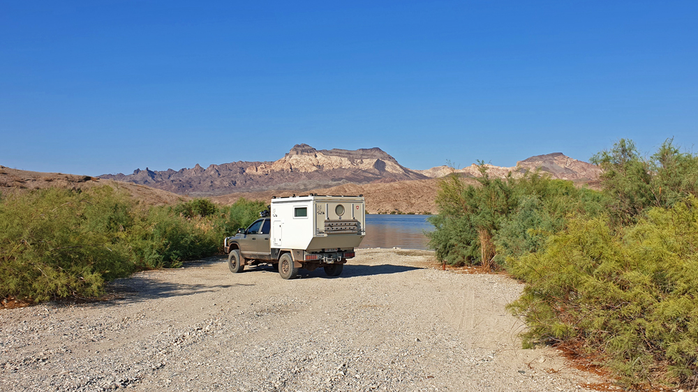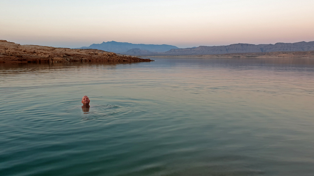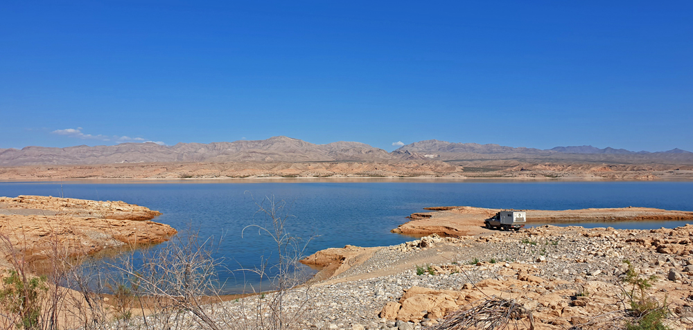 Ich bin für den Mount Charleston, doch Ozy hat die grossartige Idee, an den Lake Mead zu fahren. See = kühler, das leuchtet ein. Wir fahren also zum Stewarts Point, wo wir nach einer lausigen Piste einen hübschen Platz am See finden. Es ist einfach nur heiss! 48 °C, um genau zu sein!