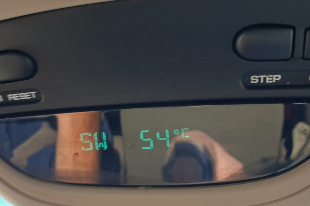 Wir finden dann heraus, dass die (zugegebenermassen kleine) Anlage – ganz auf europäische Bedürfnisse zugeschnitten – eigentlich nur für Temperaturen bis 40 Grad gedacht wäre. Bei Temperaturen bis gegen 50 Grad bei einem nach dem Stehen auf dem Parkplatz wohl fast gleich warmen Innenraum sowie nicht ganz perfekter Luft-Abführung hat sie kapituliert und wegen Überhitzung abgestellt (wir bräuchten bei solchen Temperaturen wohl eine Klimaanlage für die Klimaanlage…). Nun ist die Welt wieder in Ordnung!