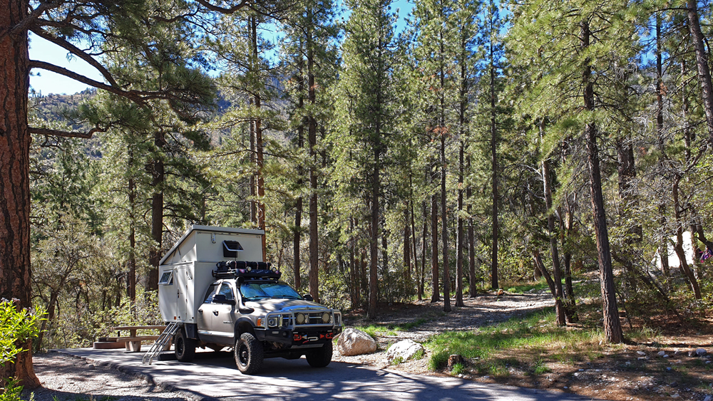 Und dann, endlich, ziehen wir uns für zwei Nächte auf den Mount Charleston zurück, wo es – auf gut 2100 m – nur noch 30 °C ist und vor allem auch in der Nacht auf unter 20 Grad abkühlt. Die Campgrounds sind voll, aber wir haben Glück und dürfen zwei Tage in der Kyle Canyon Picnic Area übernachten.