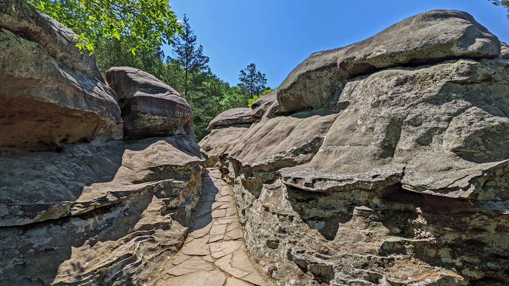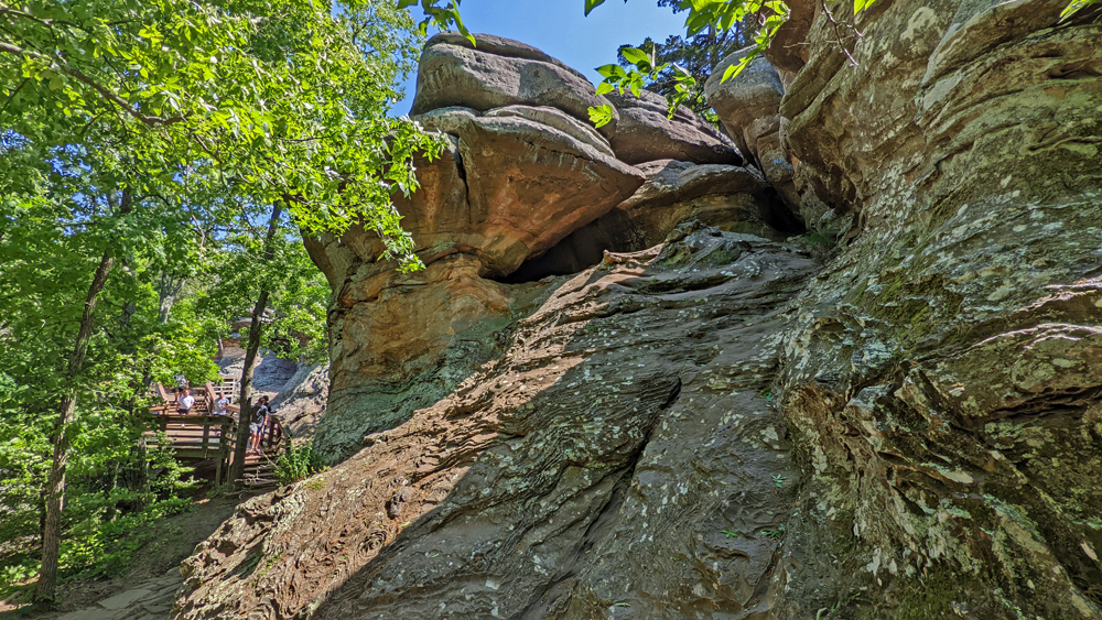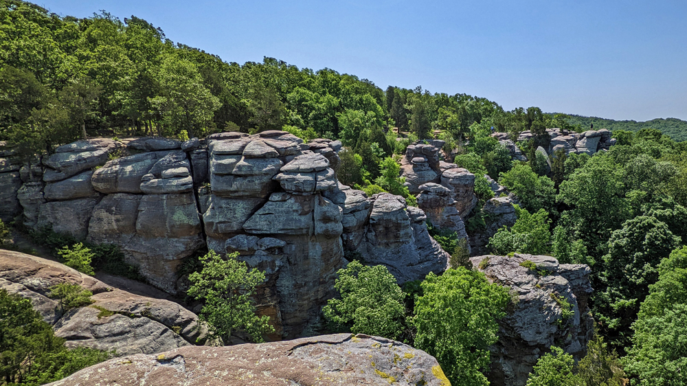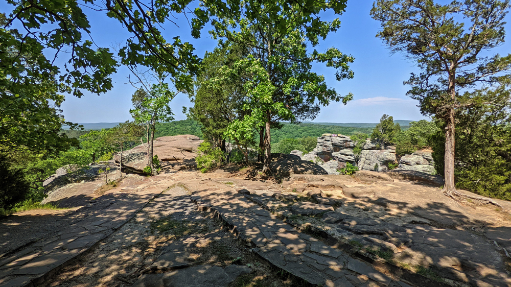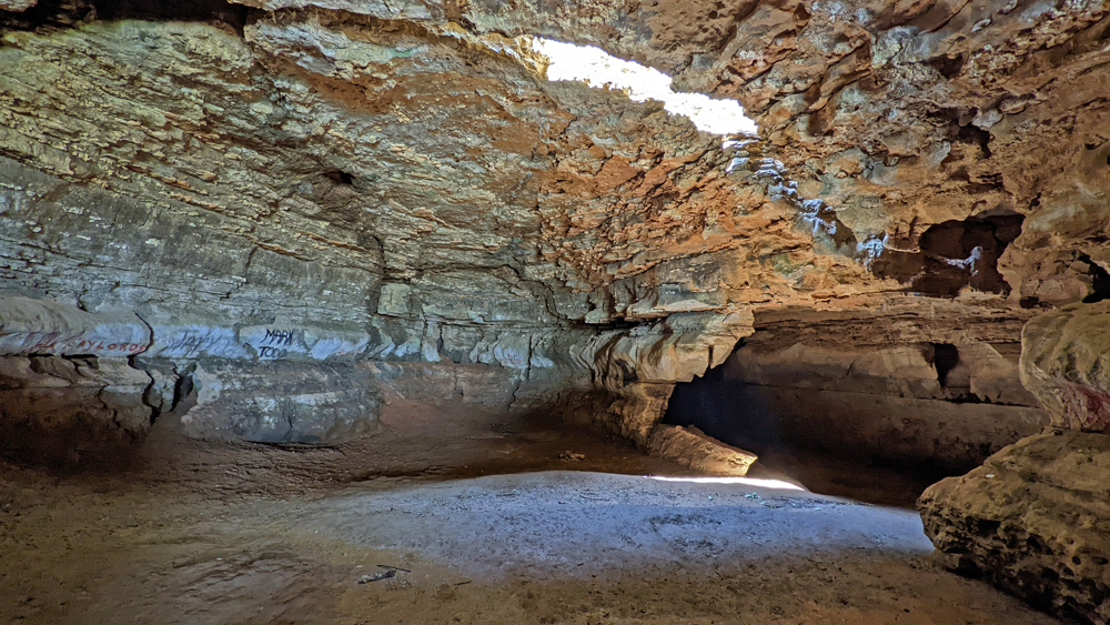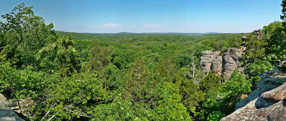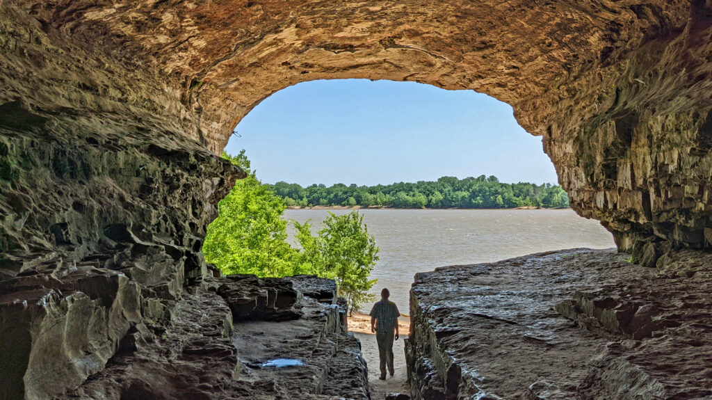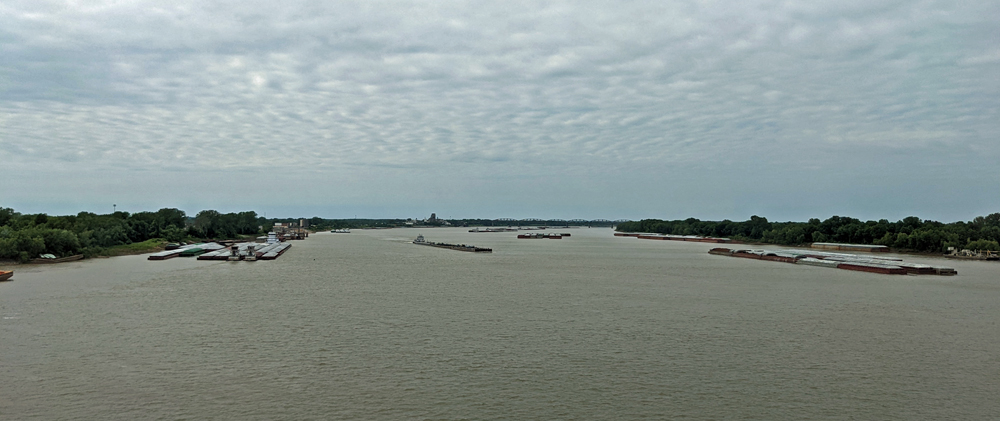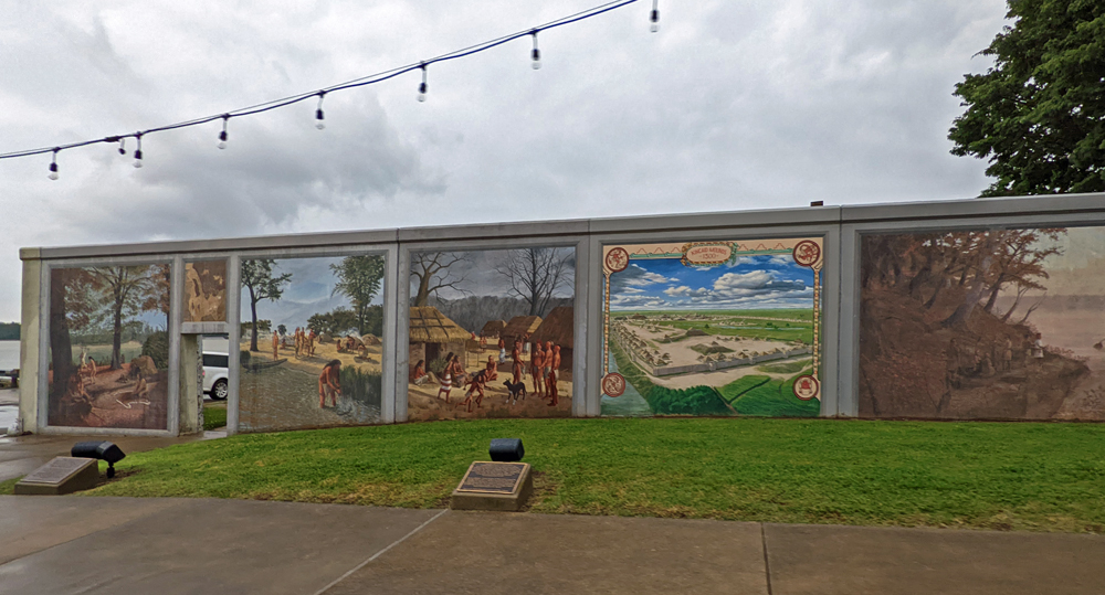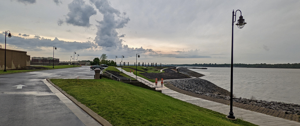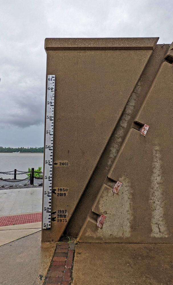 Immerhin können wir schöne Ausflüge in die Umgebung machen, u.a. zu den hübschen Garden of the Gods Recreation Area, zum Rim Rock National Recreation Trail sowie zur Cave-in-Rock (inkl. «Klappfähre» über den Missouri) und unseren 10. Hochzeitstag im eher hippen Restaurant «The Freighthouse» in Paducah vorfeiern. Paducah, KY beeindruckt uns wegen der schönen murals (Wandbilder), die auf die Innenseite der gewaltigen Flutmauer gemalt sind, die die Stadt vor dem Missouri schützen. Der Fluss ist zwar riesig, aber wir können uns kaum vorstellen, wie er aus seinem weit unten liegenden Flussbett so weit aufsteigen kann, dass die Stadt bedrohen ist. Aber er entwässert ja auch den ganzen Nordosten und so kommt es im Frühling manchmal zu gewaltigem Hochwasser, wie die verschiedenen Flutmarken an den Toren belegen.