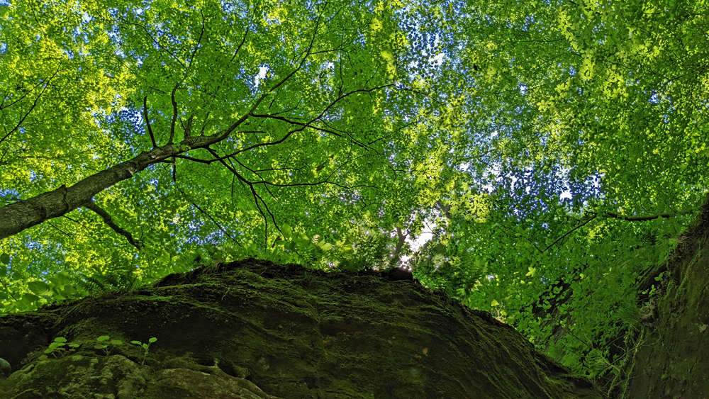 Schliesslich wagen wir uns dann aber doch in die Nähe und folgen der Strasse in einem grossen Bogen zum Visitor Center. Von hier aus kann man auf einem 2 km langen Fusspfad um den 264 m hohen Zylinder herumgehen und bekommt – wenn es mal ein Loch in den Bäumen gibt – immer wieder einen anderen Blickwinkel. Von weitem sieht er einfach riesig und rund aus, wenn man rund herum geht, kann man kaum glauben, wie unterschiedlich Form und Struktur je nach Ansichtsseite sind. Mal erscheint er hoch und schmal, mal eher breit und gedrungen, mal scheinen die scharfkantigen Magmasäulen in den Himmel zu wachsen, an einem anderen Ort sind sie stark verwittert oder ausgebrochen. Der ganze Fuss ist mit polygonalen Bruchstücken übersäht, doch ist wohl in historischen Zeiten noch kein Abbruch beobachtet worden (sehr beruhigend, wenn man da drunter steht…).