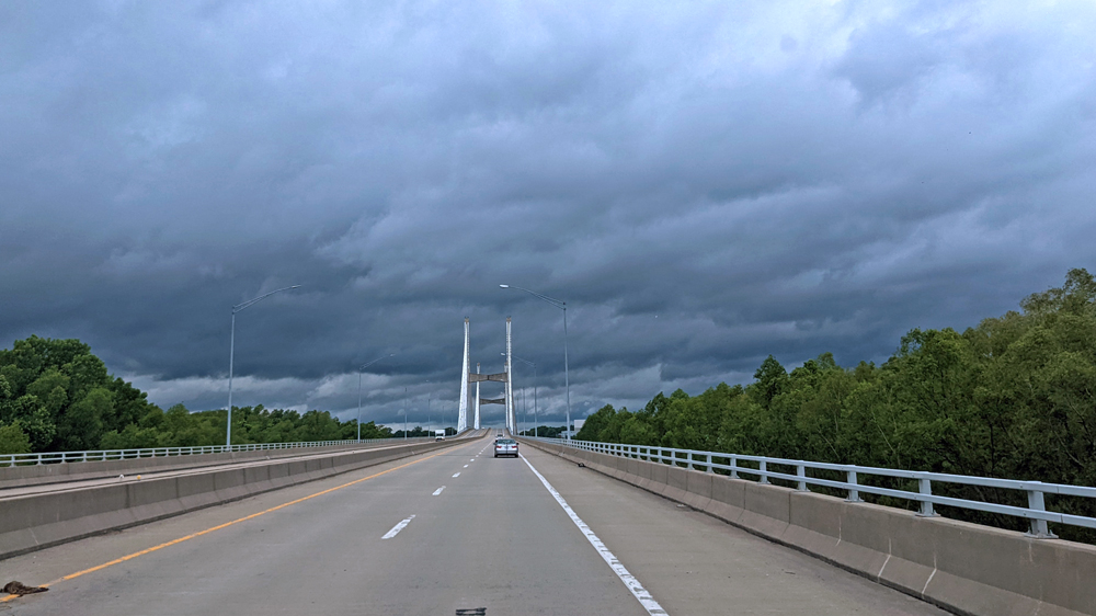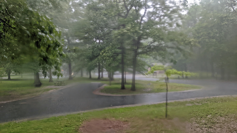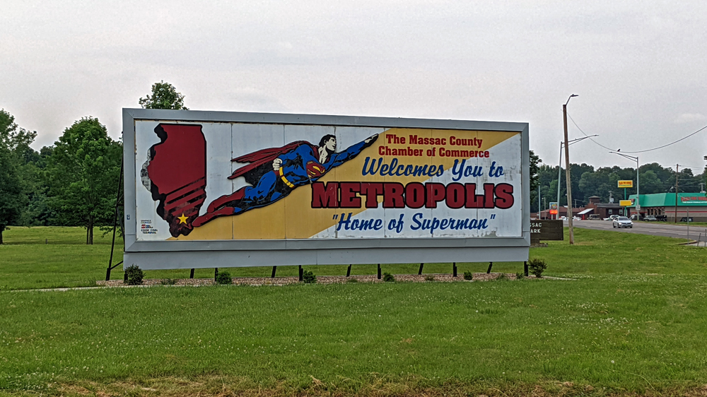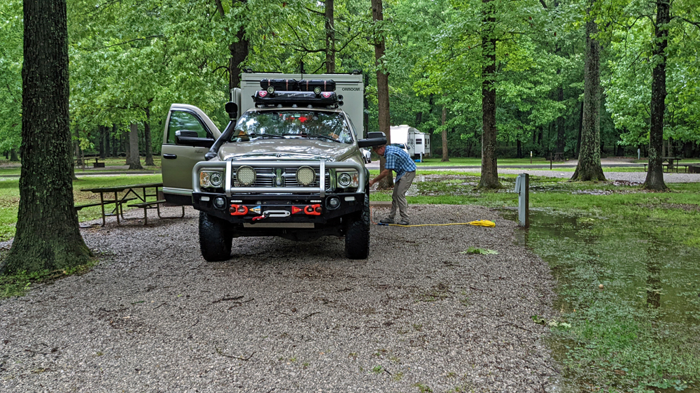 Den ersten, eigentlich nicht so geplanten, längeren Stopp legen wir in Metropolis, IL ein. Nicht wegen Superman, sondern weil beim letzten Wasser-Auffüllen unser Schlauch kaputt gegangen ist. Da es sich um ein spezielleres Teil handelt (sehr leicht, flexibel und vor allem auch platzsparend), musste Ozy einen neuen bestellen. Wir quartieren uns einige Tage im schönen Fort Massac State Park ein, bis der bestellte Schlauch beim Tractor Supply Store im benachbarten Paducah, KY ankommt. Es ist über 30 Grad warm und schwül und wir haben fast jeden Tag (oder Nacht) einen oder mehrere heftige Gewitter und auch Tornado Watches, was dazu führt, dass wir auf unserer Site geradezu auf einer Insel stehen und sich die Situation an der Moskito-Front auch nicht gerade verbessert…