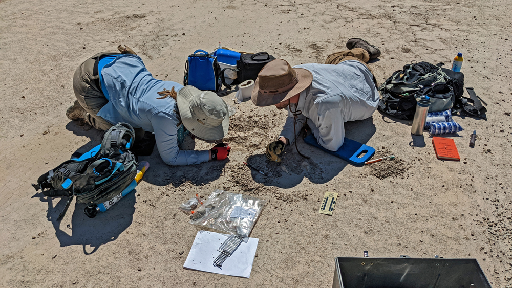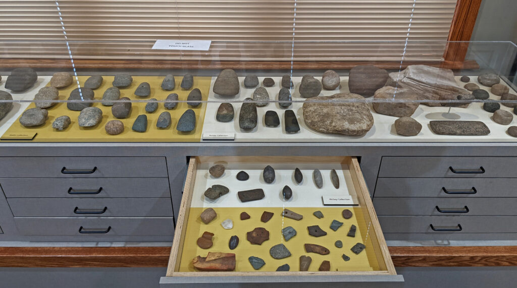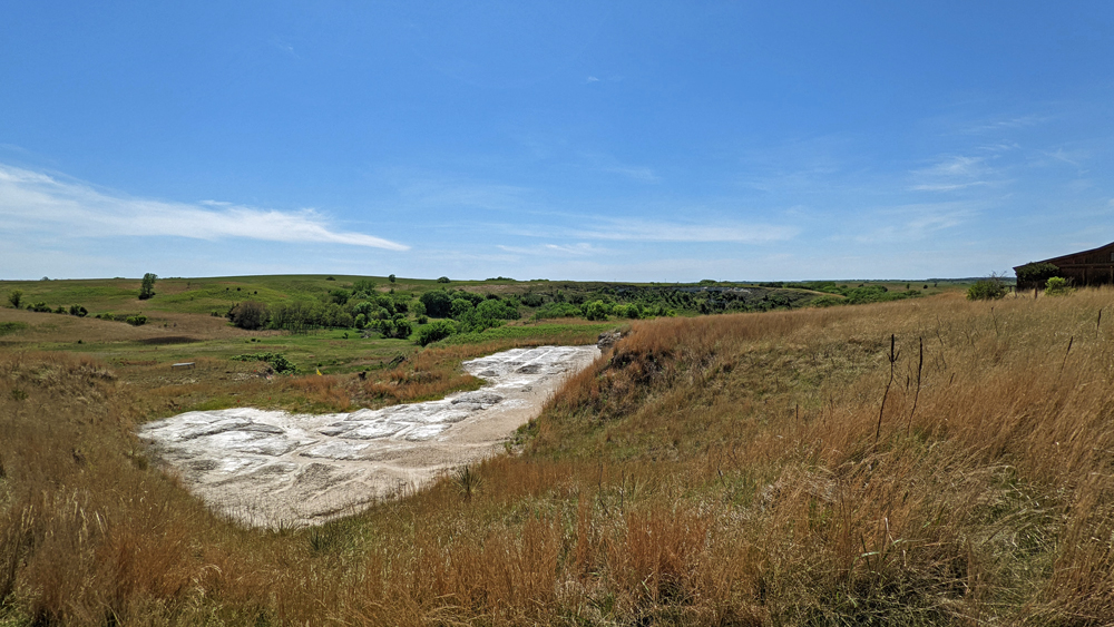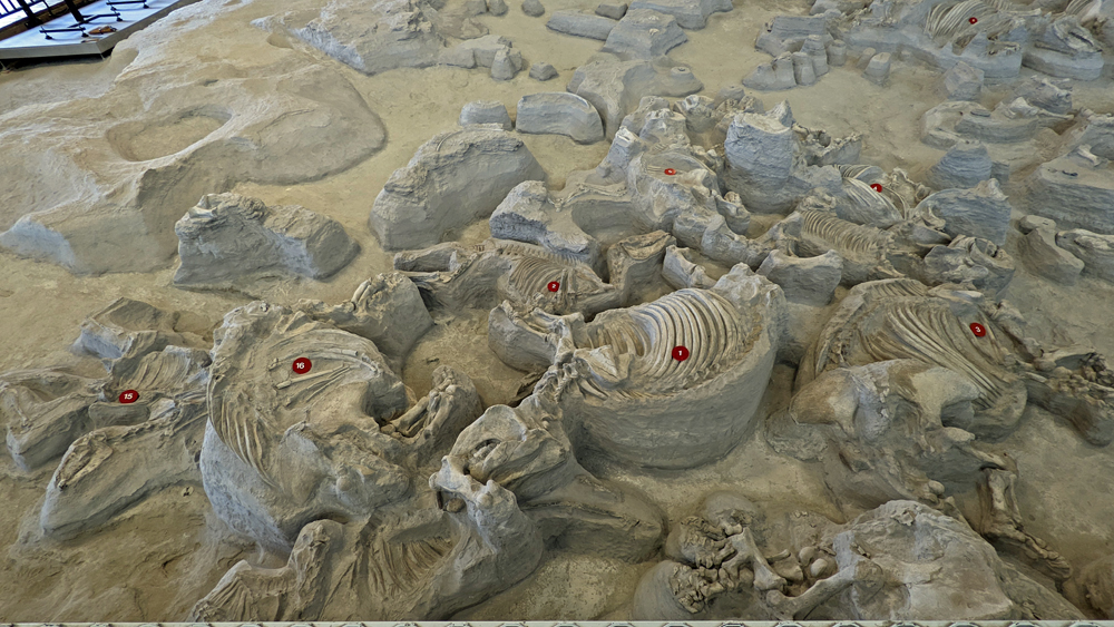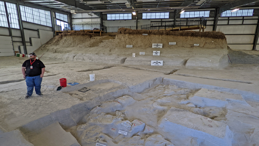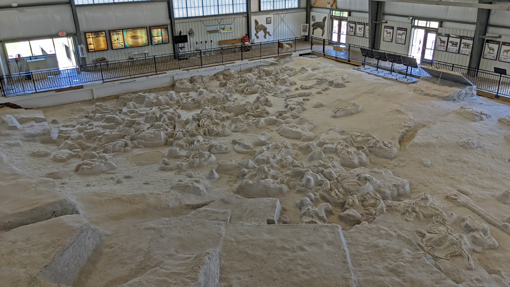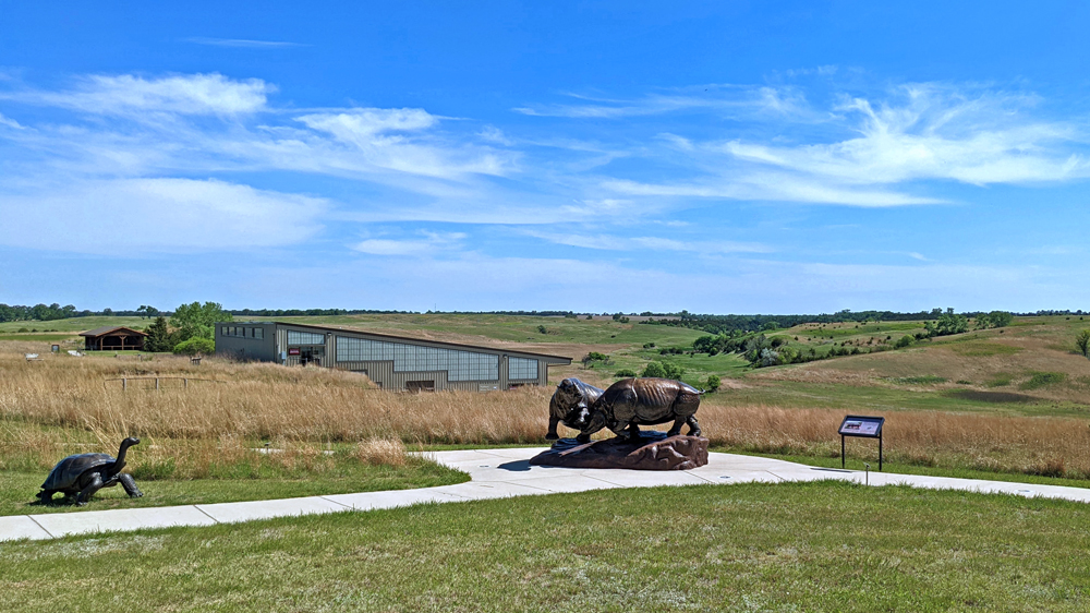 Trotz Temperaturen von bis zu 34 °C machen wir auf meinen dringlichen Wunsch einen Ausflug zu den Ashfall Fossil Beds, einem absolut faszinierenden Fossilien-Fundort mit traumhafter Erhaltung. Er ist aus zwei Gründen speziell: einerseits sind die Knochen nicht versteinert, sondern in Vulkanasche eingebettet (wodurch die Ausgrabungen zu einer enorm staubigen, archäologischen Aufgabe werden), andererseits handelt es sich um eine aussergewöhnliche Momentaufnahme: Vor rund 11.8 Millionen Jahren, im Miozän, war über dem rund 1’700 km / 1’100 mi entfernten Yellowstone Hotspot ein Supervulkan ausgebrochen (Bruneau-Jarbridge Caldera im heutigen Südwest-Idaho), deren mikroglashaltige Asche sich nach Osten über ein riesiges Gebiet verteilte. Die meisten Tiere überlebten zwar den Ascheregen selbst, starben aber am eingeatmeten Mikroglas in ihren Lungen. Zuerst die kleineren Spezies wie Vögel, dann die kleineren Grasfresser (Equiden und Cameliden), nach etwa sechs Wochen die letzten Nashörner (Teleoceras). An dieser Stelle befand sich ein Wasserloch, wo sich die sterbenden Tiere sammelten und schliesslich von der verwehten Asche eingebettet wurden. Die Skelette haben sich fast ungestört erhalten, teils noch mit ihren Spuren im Schlamm, der letzten Mahlzeit im Maul und ihren Babies bei sich. Aufgrund der Alters- und Geschlechtsverteilung lassen sich sogar Aussagen über die Sozialstruktur verschiedener Spezies machen. Es ist gleichzeitig traurig und total faszinierend!