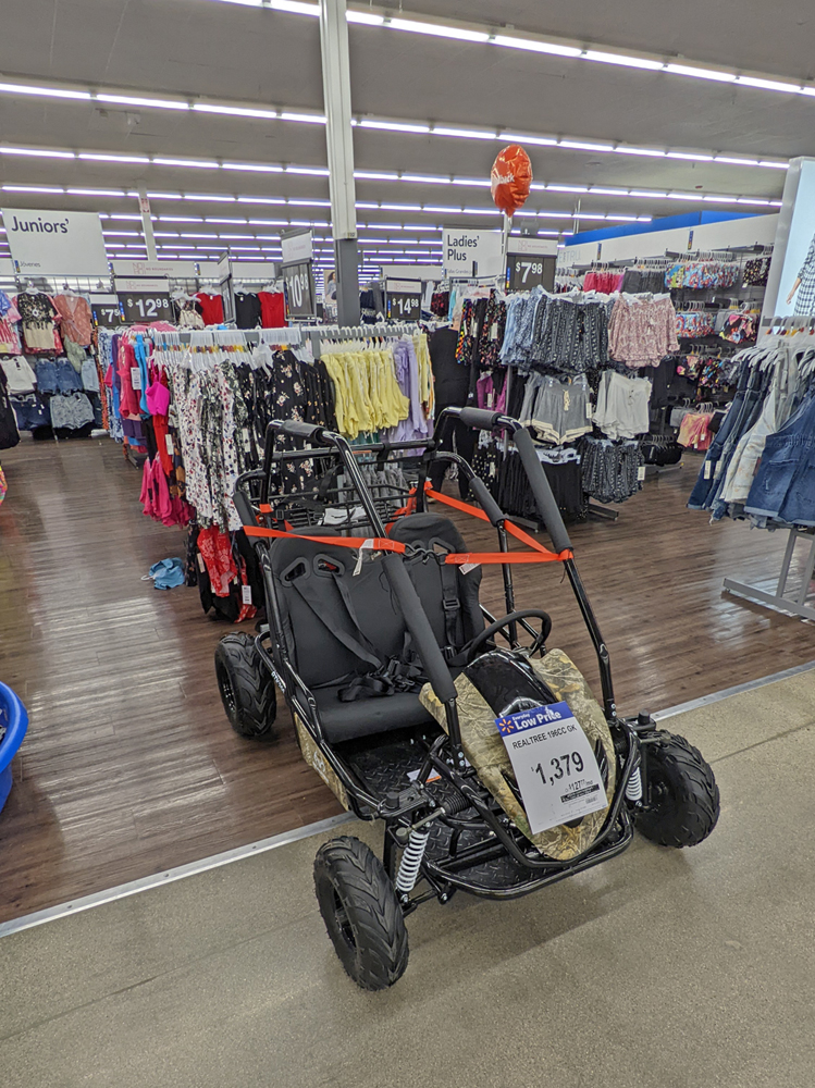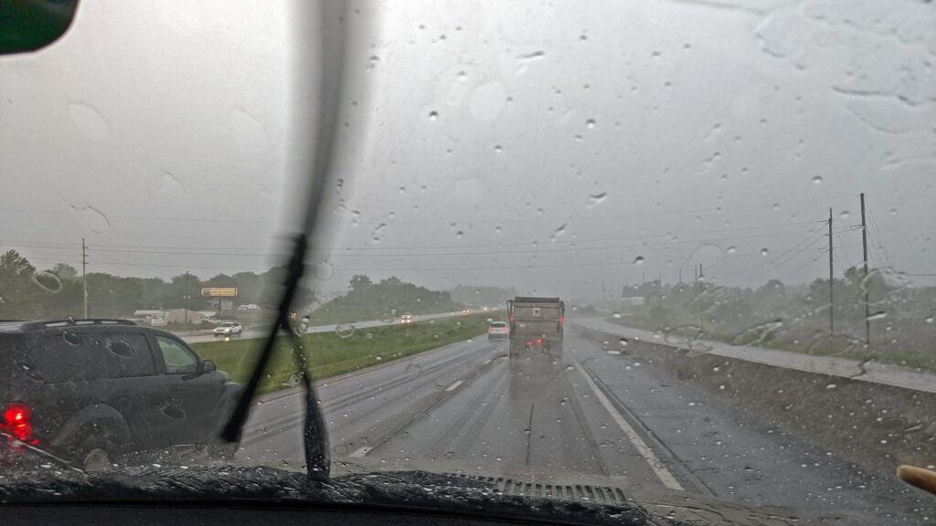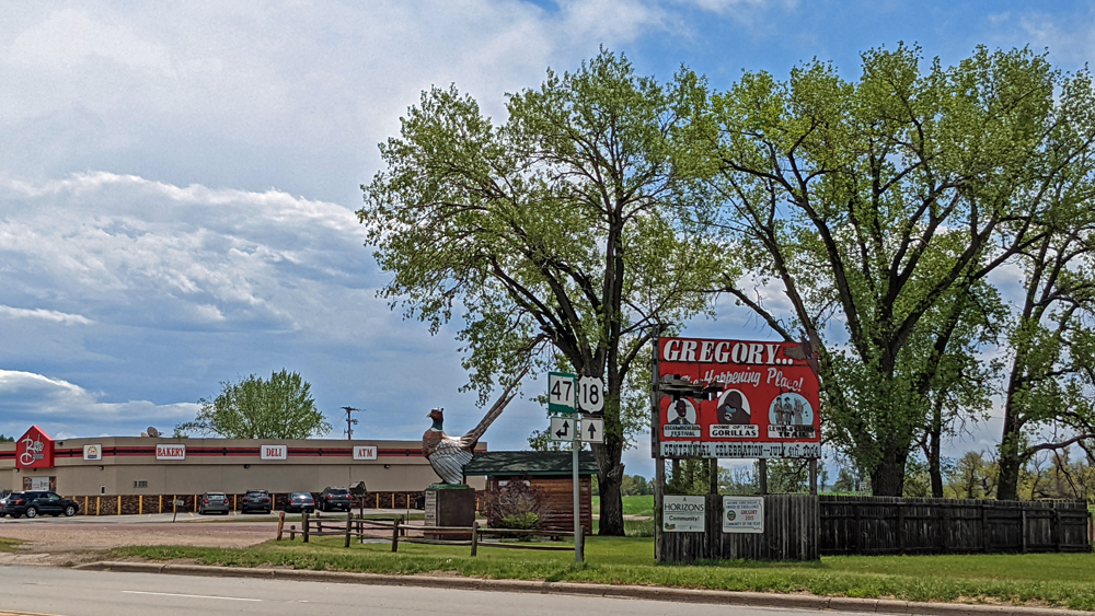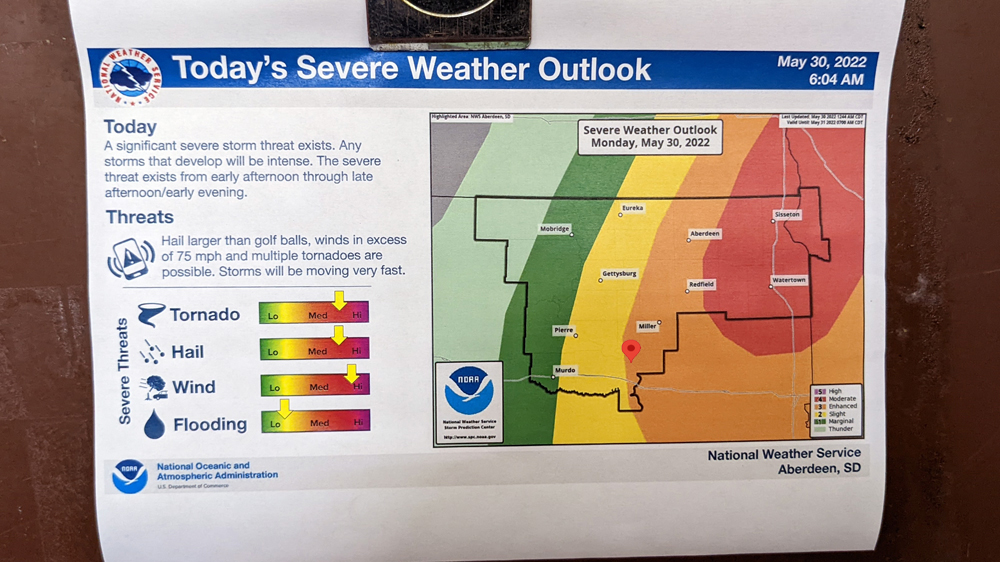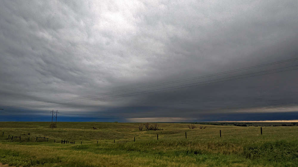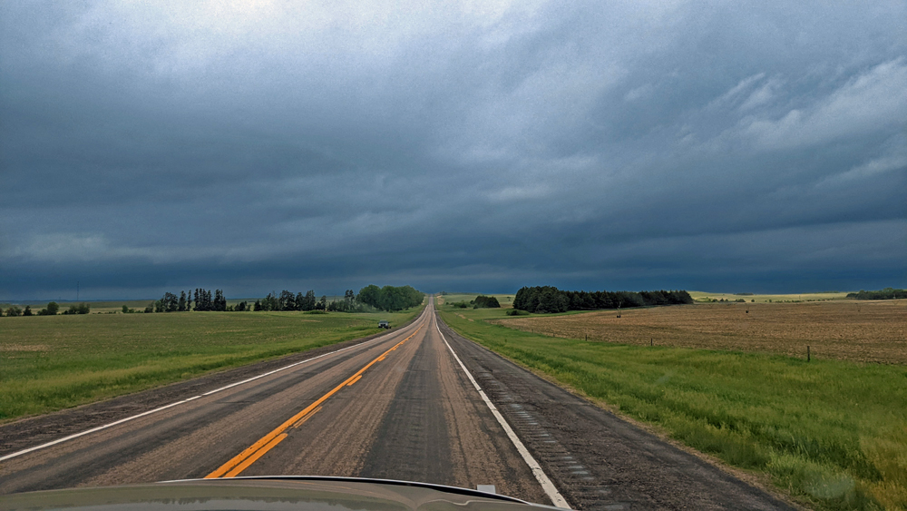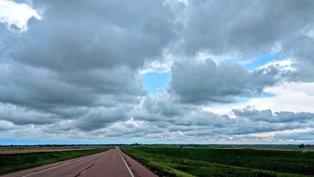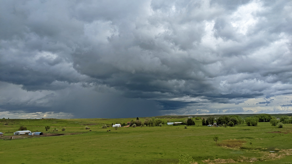Nach fünf Tagen in den Black Hills bekommen wir eine Wetterwarnung aufs Handy (severe thunderstorm watch) und als wir weiterfahren, sieht es aus wie kurz vor der Sintflut – rundum schwarze Wolken, Regensäulen und Blitze. Wir haben aber Glück und erst in Rapid City erwischt uns so richtiges Hagelwetter. Wir müssen sowieso noch einkaufen gehen und warten das Schlimmste im Walmart ab.