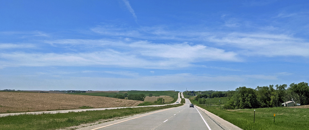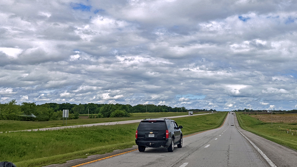 Am nächsten Tag verlassen wir diesen so schönen, aber leider doch nicht so gastlichen Ort und fahren wieder auf die nahe Interstate. Die Fahrt geht flott voran und bald sind wir in Iowa. Plötzlich wird Ozy unruhig. Er blickt in den Rückspiegel, bremst blitzartig ab und fährt auf den Pannenstreifen: Der hintere Reifen auf der Beifahrerseite qualmt heftig!