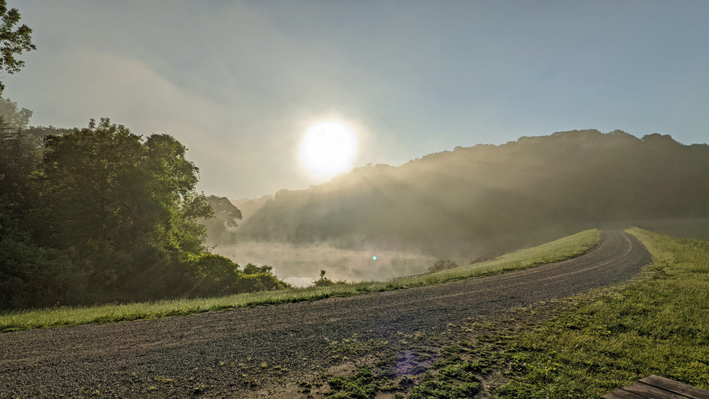 Wir umfahren St. Louis dieses Mal (irgendwann kommen wir sicher wieder – ich habe ja noch das Projekt «Lewis & Clark-Trail»…). Es gewittert und regnet in Strömen, was beim dichten Verkehr nicht so wirklich lustig ist. Wir sind froh, als wir auf Nebenstrassen abbiegen können und bald erreichen wir die schön gelegene Skyway Ranch, wo wir Kathleen und Kurt mit ihrem Van Juny treffen. Die Besitzer des Anwesens, Gretchen und Kurt, haben hier ein Eventzentrum eingerichtet und wir können uns zum Schwatzen in die grosse Halle setzen. Ein weiteres Standbein der beiden ist die Zucht von Pudeln und Rehpinschern und wir verbringen einen sehr schönen Abend zusammen in grösserer Gesellschaft. Ich erstehe von Gretchen noch einen wunderbaren, selbstgemachten Ziegen-Feta mit Kräutern (Ziegen haben sie unter anderem auch noch) und nach Verabschiedung von Kathleen und Kurt trennen sich unsere Wege schon wieder.