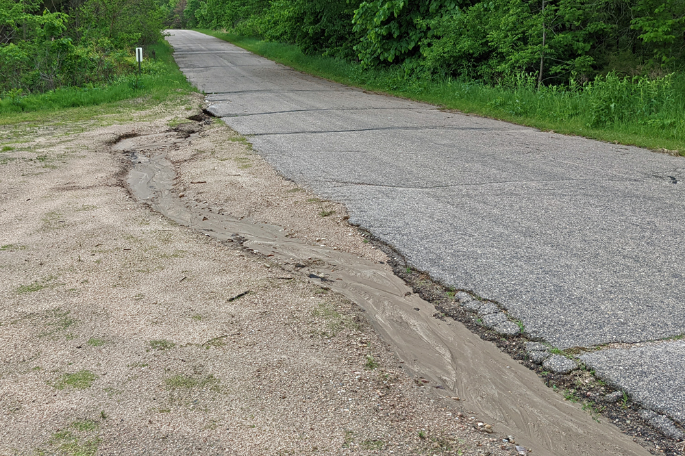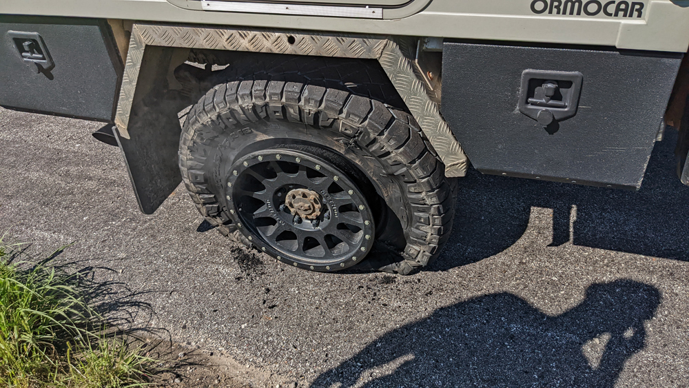 Eine erste Untersuchung des kaputten Pneus liefert keinen Hinweis auf die Ursache. Oh well, er ist ja eh nicht mehr zu retten. Die ganze Reparatur – Ersatzrad runterkurbeln, gegen das kaputte Rad austauschen, kaputtes Rad hochkurbeln und Ersatzpneu aufpumpen – erledigt Ozy souverän in 40 Minuten. Die I-29 ist nicht übermässig befahren und alle PKWs und LKWs weichen diszipliniert auf die Überholspur aus, so dass das Arbeiten stark erleichtert wird.