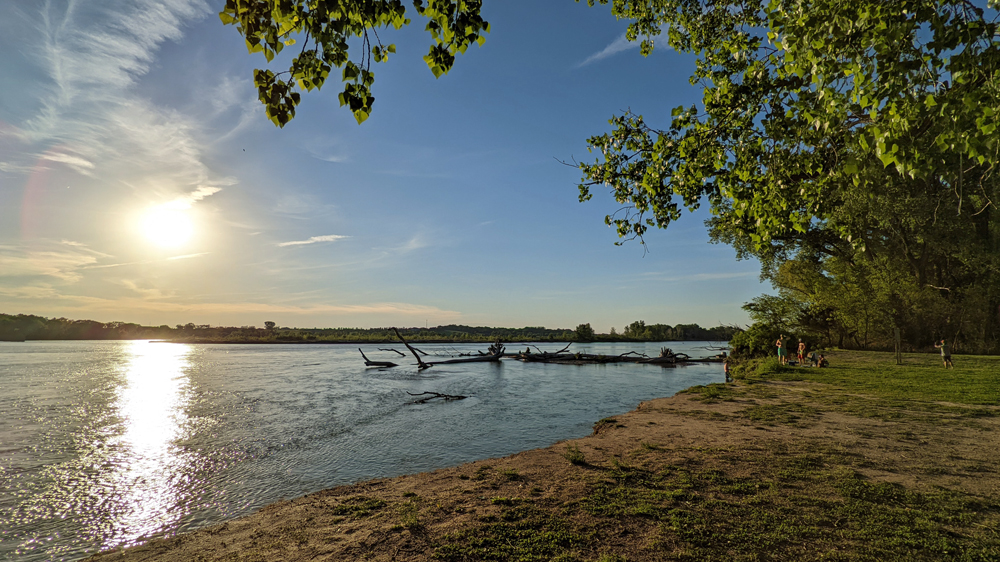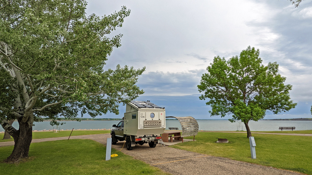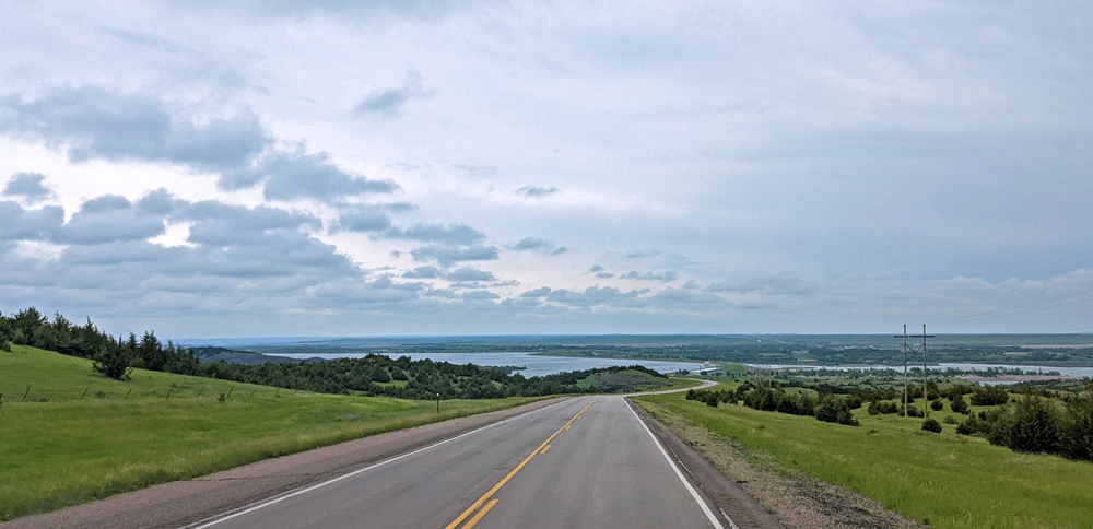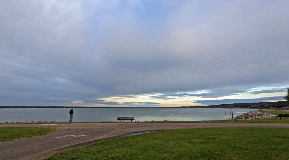 Am Montag fahren wir inmitten beeindruckender Gewitter- und Wolkenstimmungen. Das Land ist immer noch enorm weit; die grossen, rollenden Ebenen werden nur hie und da von einem Flusstal unterbrochen. Wir halten am Left Tailrace Campground, der auf einer Halbinsel im Missouri, direkt am Fuss des Big Bend Dam in South Dakota liegt. Die freundliche Dame im Office gibt uns einen schönen Platz fast direkt an der Spitze der Halbinsel und wir beschliessen, aufgrund der Wettervorhersage nochmals einen Tag Pause einzulegen.