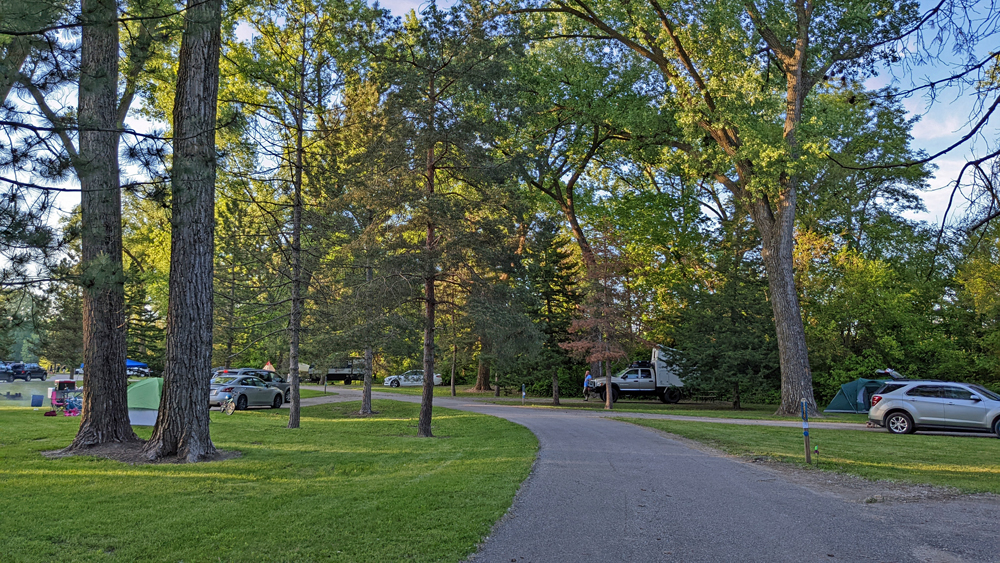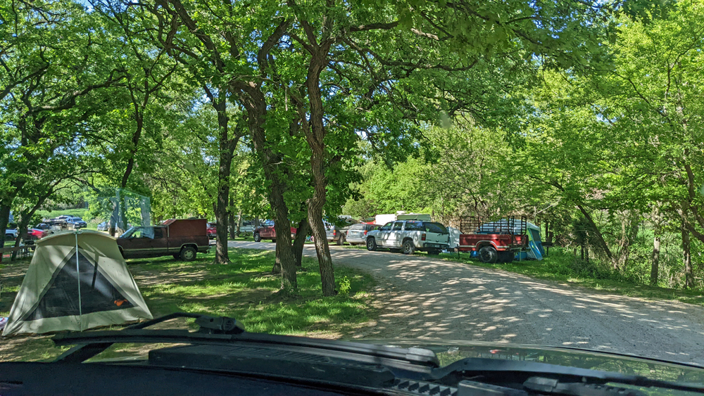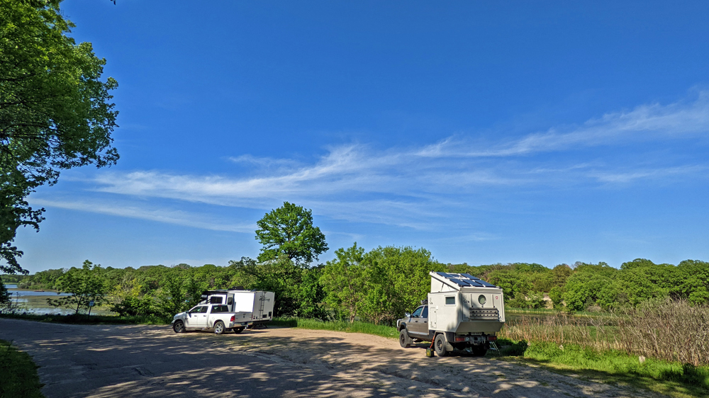 Inzwischen sind wir von der Hitze und den vielen interessanten Informationen recht erschöpft. Es ist auch schon nach vier Uhr und wir wollen uns nur noch irgendwo hinstellen und Feierabend machen. Zum Glück liegt die Grove Lake State WMA ganz in der Nähe.