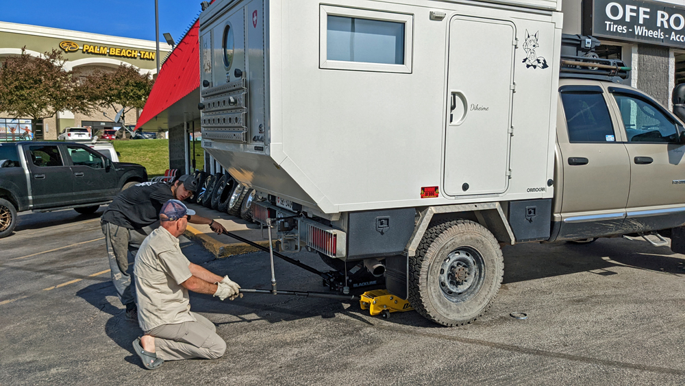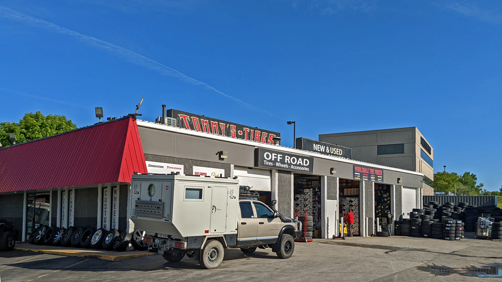 Der nächste Schritt ist das Recherchieren. Wo finden wir schnell Ersatz für unsere grossen, pistentauglichen Reifen? Wir entscheiden uns aufgrund des vielversprechenden Namens für Tommy’s Tires & Custom Wheels (West) in Omaha, NB und werden nicht enttäuscht: sie haben zwar nicht unsere Wunschreifen, können aber noch heute Abend einen brauchbaren Ersatz organisieren und die vier neuen Pneus morgen früh gleich installieren! Glück gehabt!