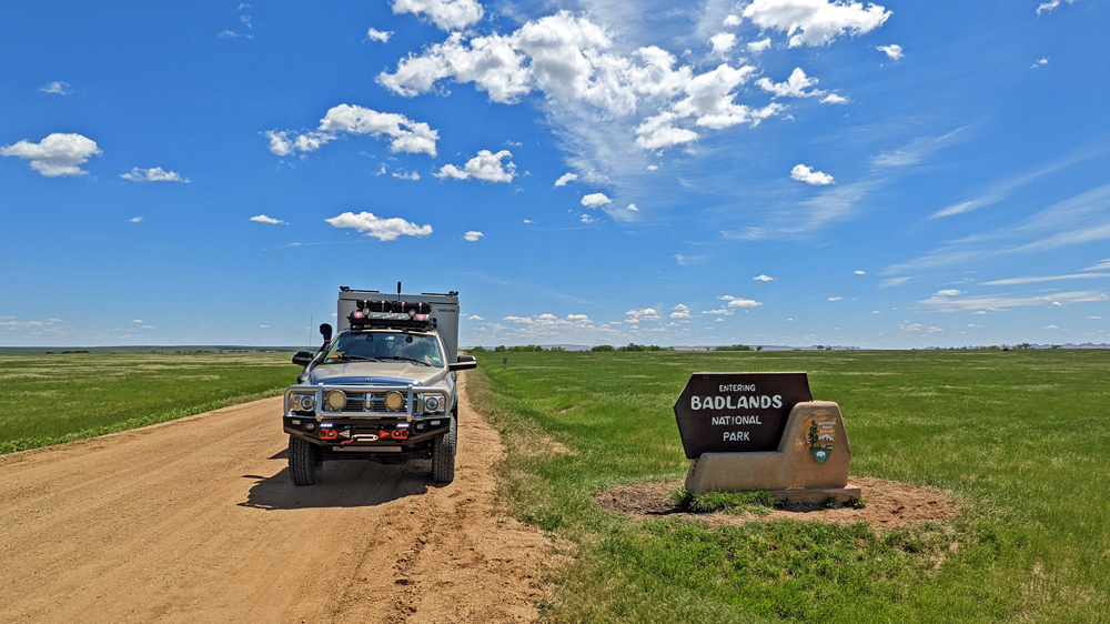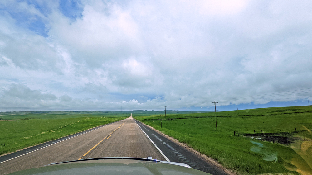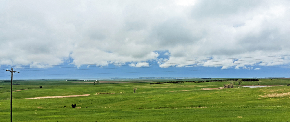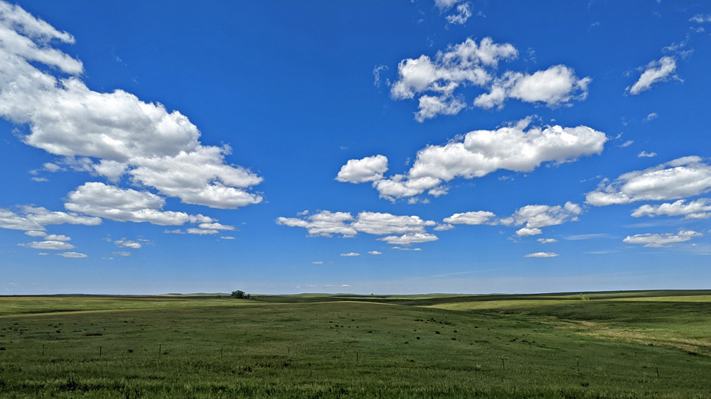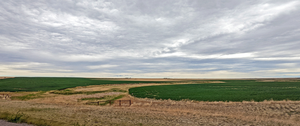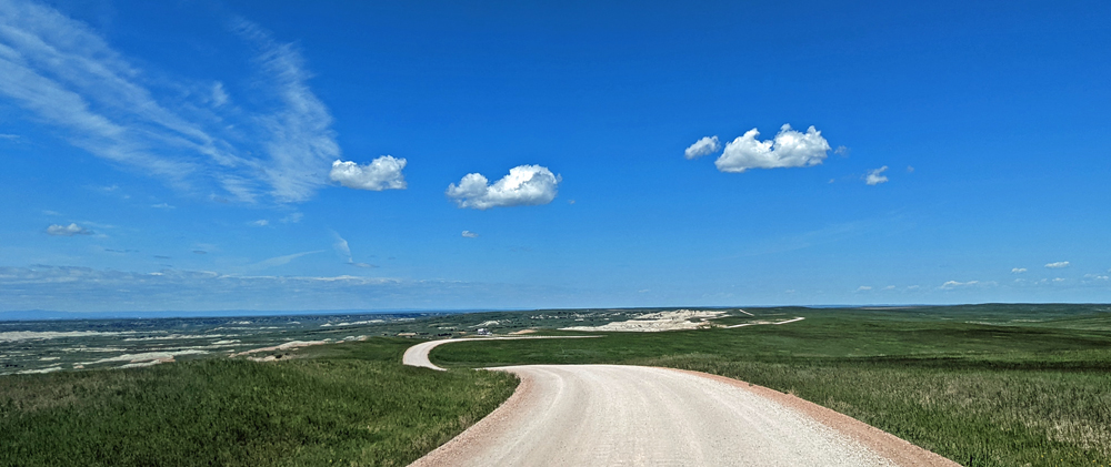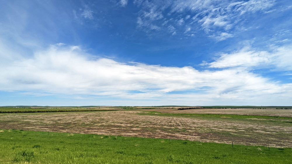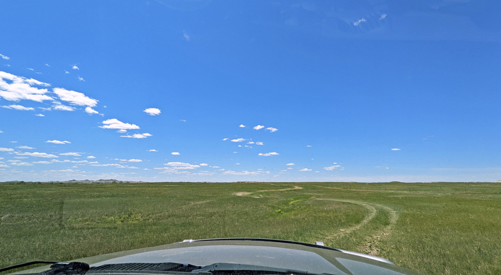 Ozy hat einen «tollen iOverlander-Platz abseits der Strasse» gefunden, den wir uns ansehen wollen. Wir fahren also von der Interstate und im Zickzack über Landwirtschaftsstrassen, vorbei an verdutzten Farmern, die immerhin freundlich winken. Am Schluss landen wir auf einem kaum sichtbaren Feldweg, der sich am Rande vom BLM-Land den Zäunen entlang schlängelt. Von den anfänglich noch sichtbaren Badland-Formationen ist auch nichts mehr übriggeblieben, weshalb wir beschliessen, umzukehren. Vermutlich waren die Koordinaten des Eintrags falsch… Eigentlich ist es sowieso noch zu früh, um schon Pause zu machen, weshalb wir beschliessen, heute schon in den Badlands NP zu fahren. Also alles wieder zurück!