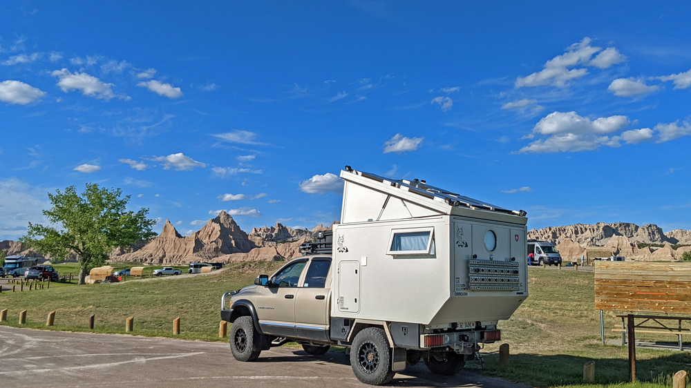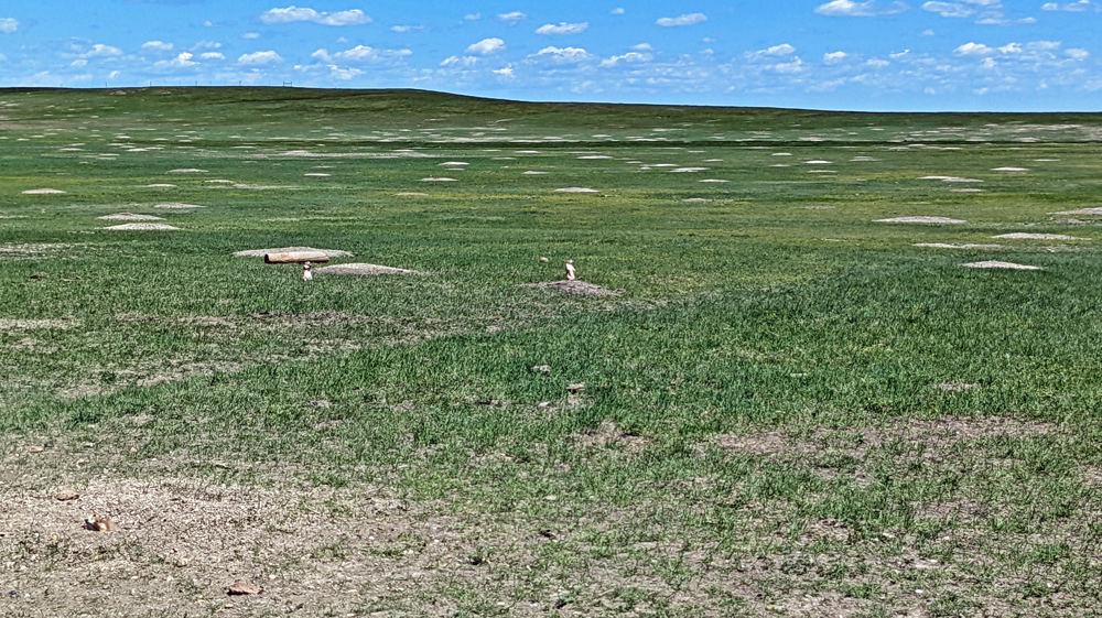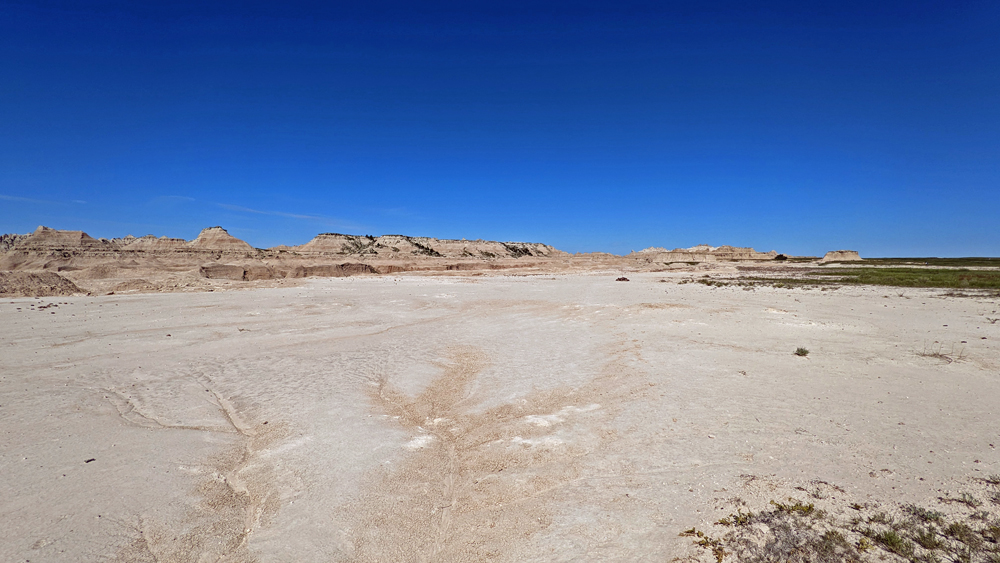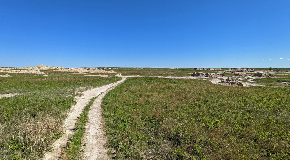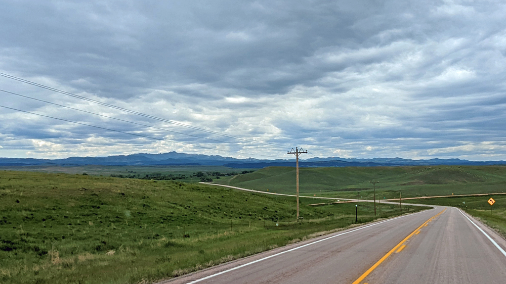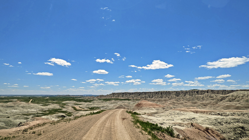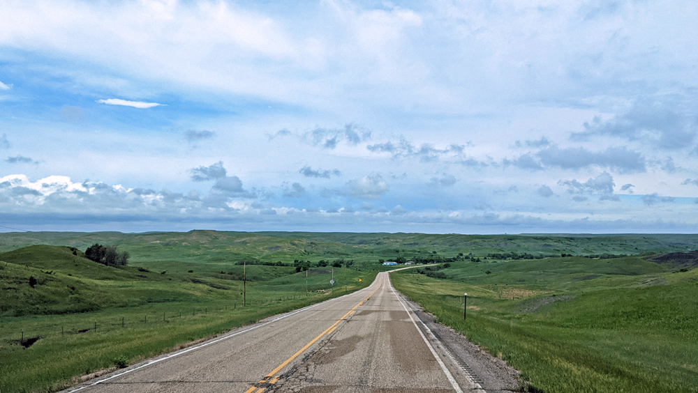 Ozy hat einen «tollen iOverlander-Platz abseits der Strasse» gefunden, den wir uns ansehen wollen. Wir fahren also von der Interstate und im Zickzack über Landwirtschaftsstrassen, vorbei an verdutzten Farmern, die immerhin freundlich winken. Am Schluss landen wir auf einem kaum sichtbaren Feldweg, der sich am Rande vom BLM-Land den Zäunen entlang schlängelt. Von den anfänglich noch sichtbaren Badland-Formationen ist auch nichts mehr übriggeblieben, weshalb wir beschliessen, umzukehren. Vermutlich waren die Koordinaten des Eintrags falsch… Eigentlich ist es sowieso noch zu früh, um schon Pause zu machen, weshalb wir beschliessen, heute schon in den Badlands NP zu fahren. Also alles wieder zurück!
