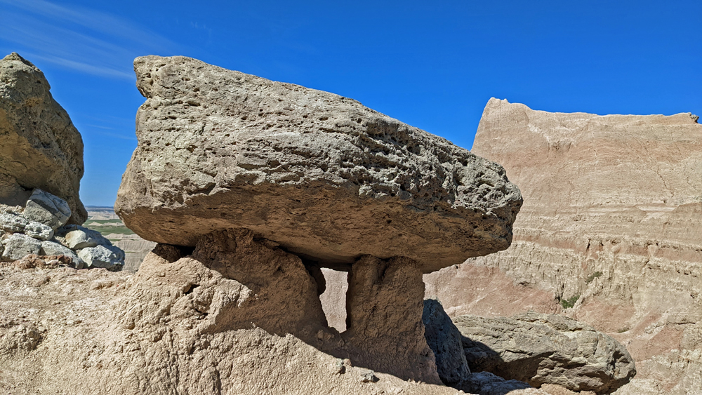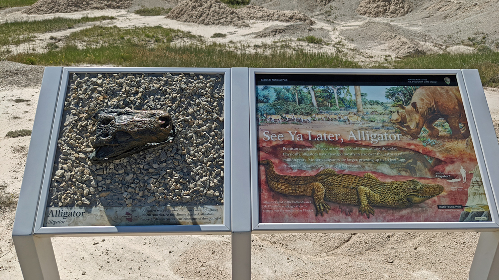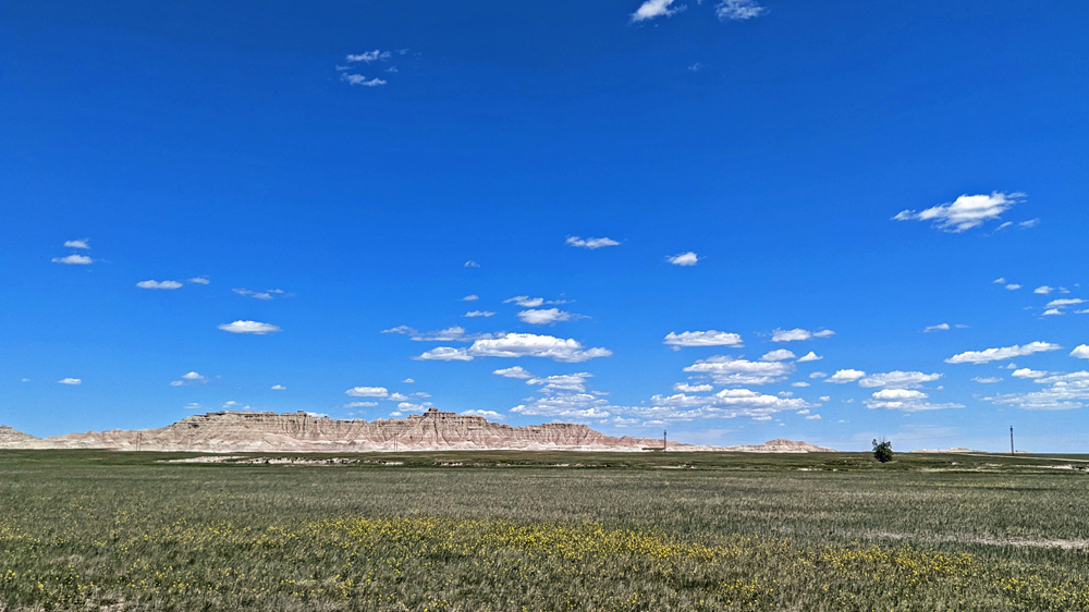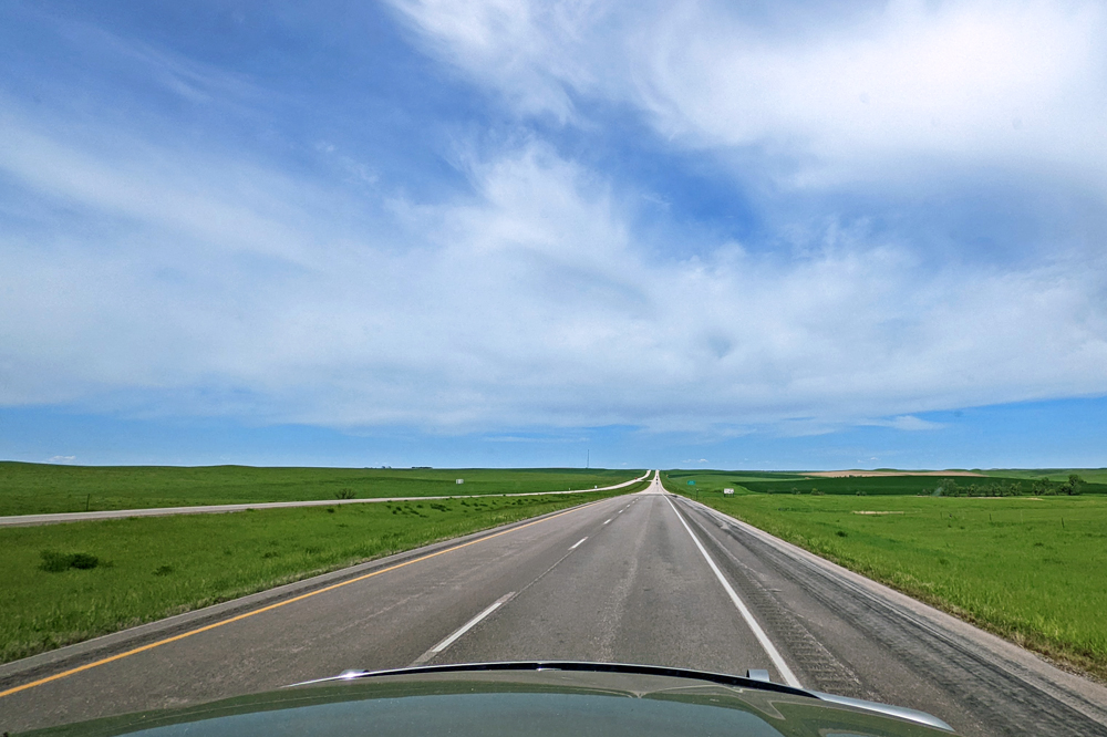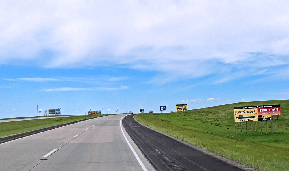 Am 1. Juni geht es auf der I-90 durch South Dakota nach Westen, Richtung Badlands. Südlich von Pierre kreuzen wir unsere Spur vom letzten Jahr (Lake Itasca nach Las Vegas). Wir sind gut eineinhalb Monate früher dran und im Gegensatz zu letztem Sommer ist alles leuchtend grün und mit blühenden Blumen durchsetzt. Die Gegend ist äusserst spärlich besiedelt, aber gewisse (Touri-)Hotspots werden durch Schilder teils schon mehr als 100 km vorher angekündigt.