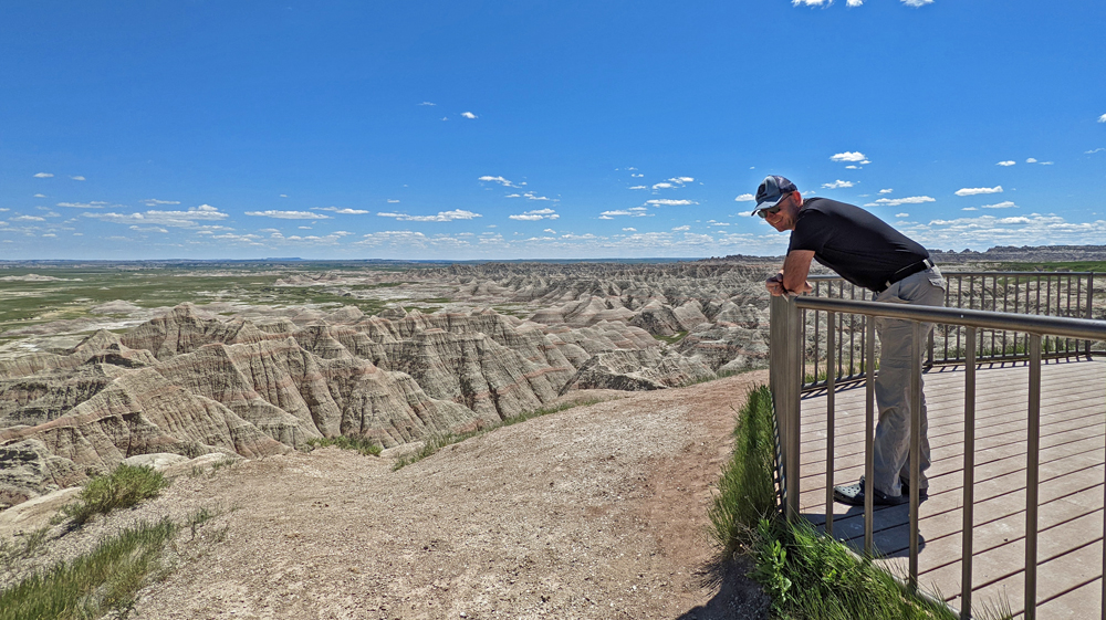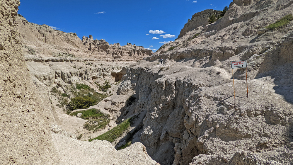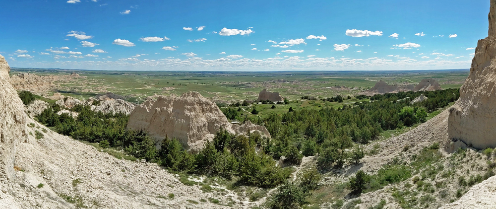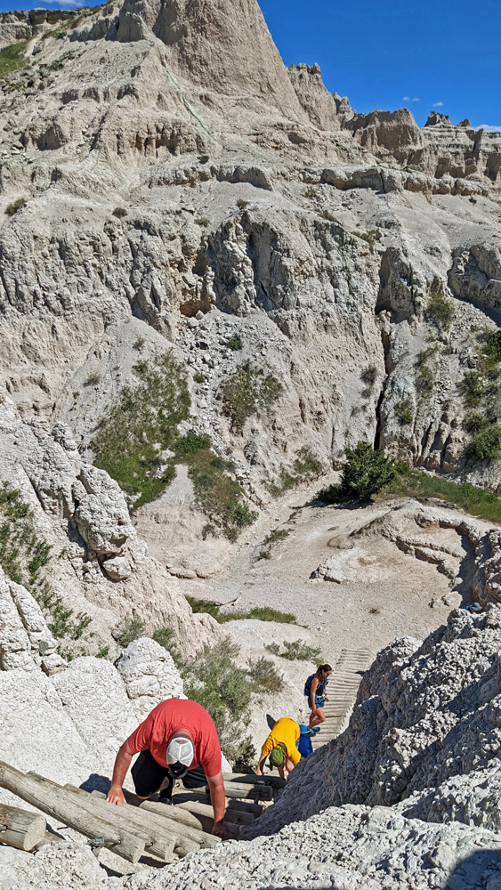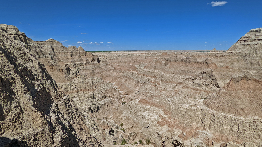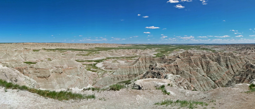 Am Eingang zum Badlands National Park hat es zwar eine kleinere Schlange, aber insgesamt sind die Menschenmassen durchaus noch überschaubar (es ist ja auch ein bisschen abgelegen…). Obwohl es recht heiss ist, laufe ich ein gleich drei Trails in die Formationen hinein. Vom gut ausgebauten Door Trail, der an einer Aussichtsplattform endet, kann man noch weiter in die Formationen hineingehen. Dieser Teil ist mit nummerierten Pfosten gekennzeichnet und das ist auch gut so, denn sonst würde man sich unweigerlich verlaufen. Fussspuren zeichnen sich auf dem festgebackenen Silt nicht ab und das Auge kann sich an den vielen, irgendwie immer ähnlich aussehenden Erosionsformen nicht festhalten. Vom Ende des Notch Trail aus wird man mit einem tollen Blick auf das grüne White River Valley belohnt. Die Aussicht verdient man sich allerdings mit einer hölzernen «Mega-Strickleiter» und einem sehr schmalen, direkt am «Abgrund» entlangführenden Pfad…