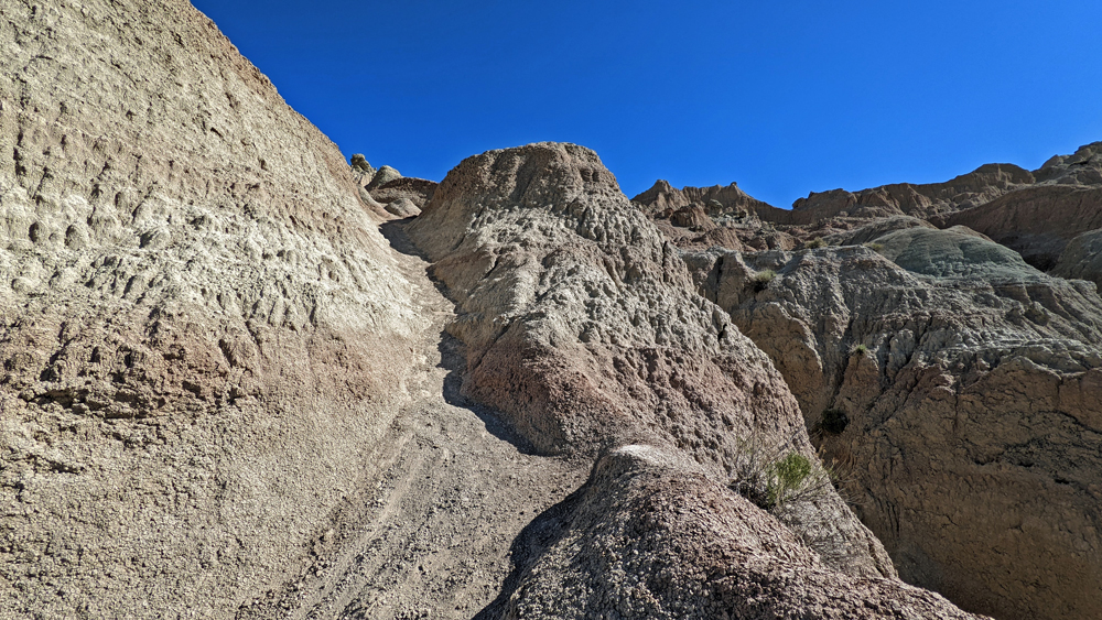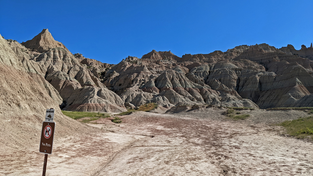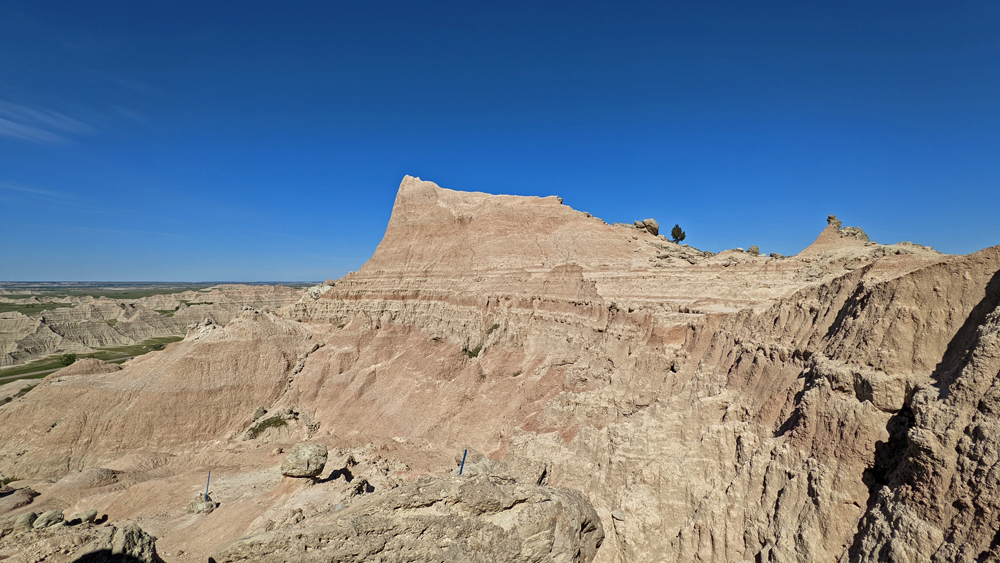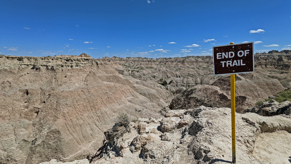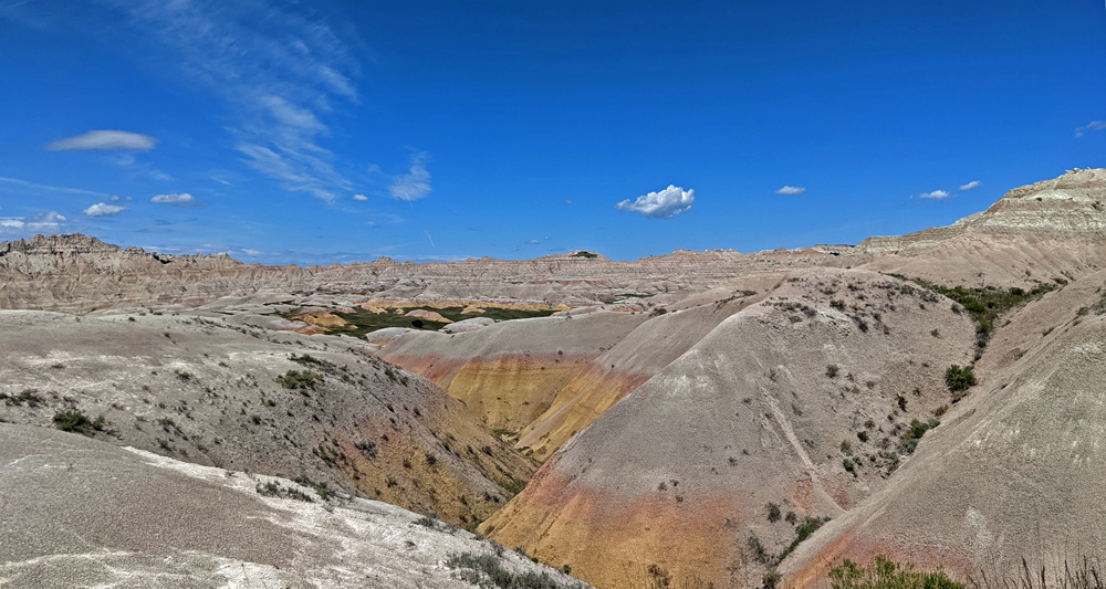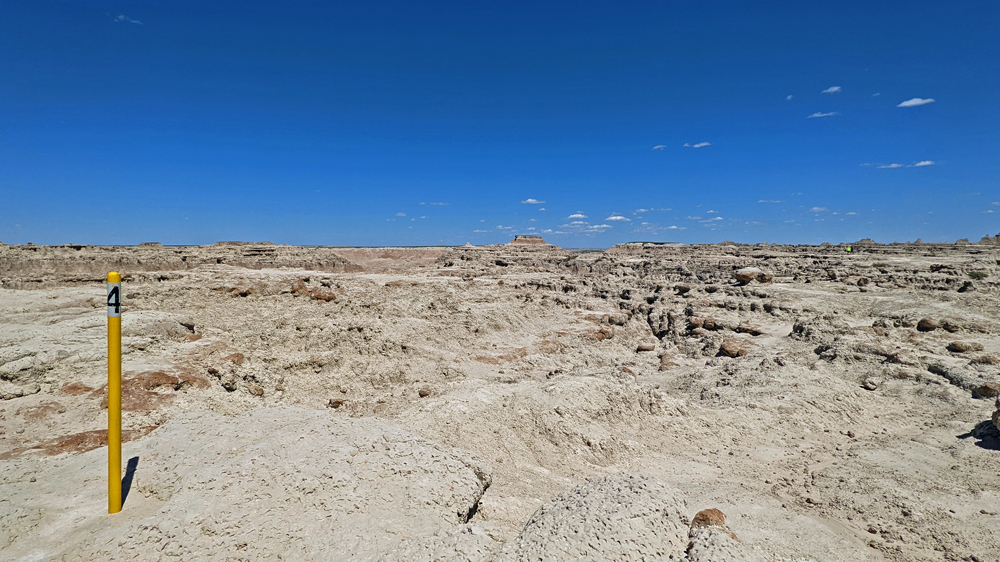 Am Eingang zum Badlands National Park hat es zwar eine kleinere Schlange, aber insgesamt sind die Menschenmassen durchaus noch überschaubar (es ist ja auch ein bisschen abgelegen…). Obwohl es recht heiss ist, laufe ich ein gleich drei Trails in die Formationen hinein. Vom gut ausgebauten Door Trail, der an einer Aussichtsplattform endet, kann man noch weiter in die Formationen hineingehen. Dieser Teil ist mit nummerierten Pfosten gekennzeichnet und das ist auch gut so, denn sonst würde man sich unweigerlich verlaufen. Fussspuren zeichnen sich auf dem festgebackenen Silt nicht ab und das Auge kann sich an den vielen, irgendwie immer ähnlich aussehenden Erosionsformen nicht festhalten. Vom Ende des Notch Trail aus wird man mit einem tollen Blick auf das grüne White River Valley belohnt. Die Aussicht verdient man sich allerdings mit einer hölzernen «Mega-Strickleiter» und einem sehr schmalen, direkt am «Abgrund» entlangführenden Pfad…