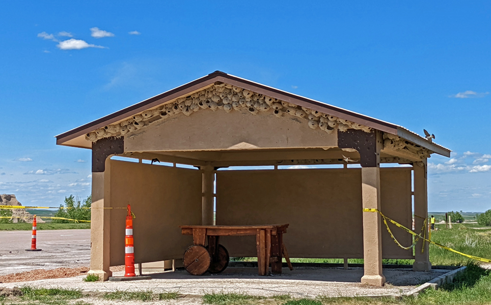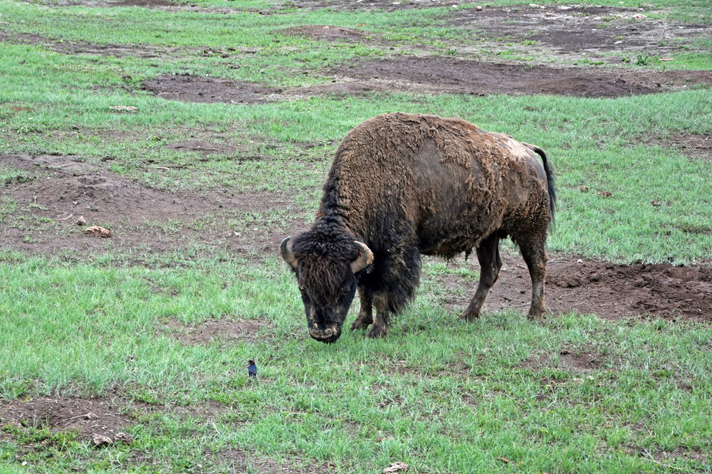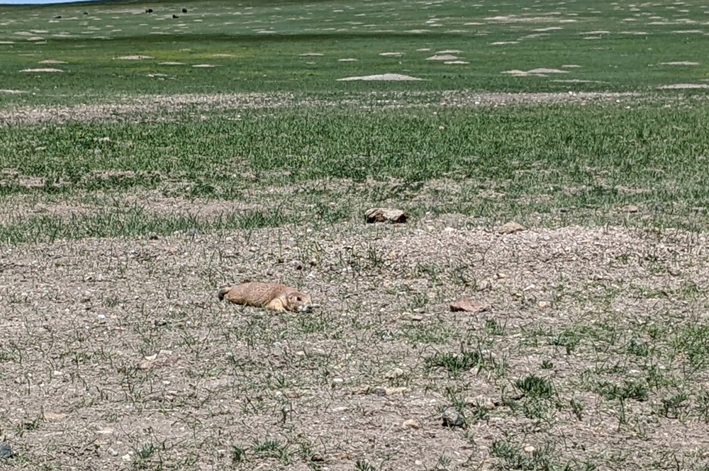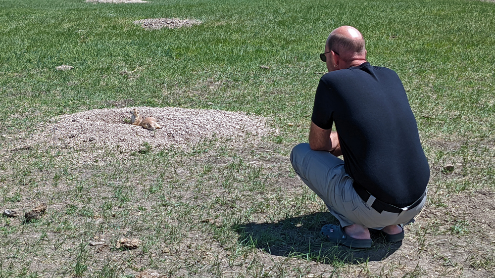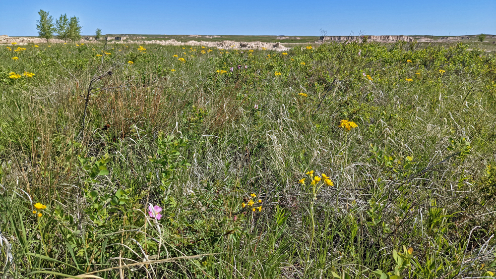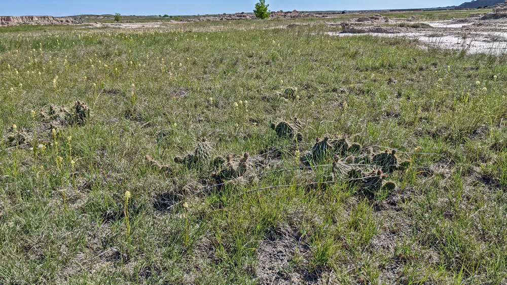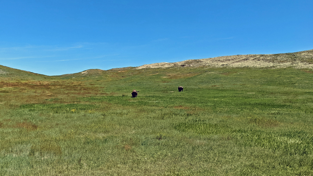 Nach einer Dusche, die wir uns hier auch verdienen müssen (es ist nur eine, weit entfernte Münzdusche offen), bringt mich Ozy zum Anfang des Saddle Pass Trail. Es geht steil über den Badlands Wall hinauf (teils ohne genügende Wegmarkierung…) und ich bin sehr froh, dass ich diesen rutschigen, krümeligen Pfad nicht wieder hinunter muss, sondern über die mit Blumen und fiesen kleinen Prickly Pear Cacti gespickte Prärie zur Hauptstrasse zurückwandern kann, wo mich Ozy aufpickt. Der kleine, aber feine Fossil Exhibit Trail muss natürlich auch noch sein und wir können gleich zwei Paläontologen zugucken, die hier im Sommer als Volunteers arbeiten. Während die meisten Touristen den Park nach Rund 30 km Richtung I-90 wieder verlassen, fahren wir via Sage Creek Rim Road und die BIA-Roads 27 und 2 sowie die Red Shirt Table Road durch Teile des Parks und die Pine Ridge Reservation weiter Richtung Black Hills. Dabei sehen wir zahlreiche Prairie Dog Towns sowie die ersten Bisons seit langer Zeit (wilde und gezüchtete).