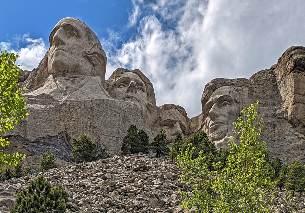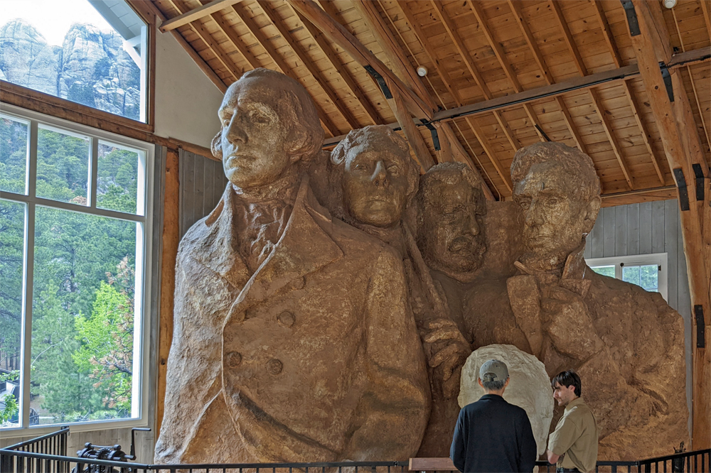 Der Eintritt zum Mt. Rushmore ist frei, doch kostet das Parken 10 $ (das Ticket ist ein Jahr gültig!). Die ganze Anlage ist überaus bemerkenswert. Von der Flaggenallee bis zur Besucherterrasse. Darunter befindet sich ein Museum mit interessanter Dokumentation: von der Entstehungsgeschichte und der technischen Durchführung (entstanden zwischen 1927 und 1941), über den Bildhauer Gutzon Borglum bis zur never ending story der Konservierung. Wir lassen es uns nicht nehmen, den Presidential Trail zu laufen, der uns bis an den Fuss der Geröllhalde führt, von wo aus man den Herren sozusagen in die Nasenlöcher gucken kann und erst richtig erlebt, wie riesig die Köpfe sind (jeder ist über 18 m hoch, die Augen jeweils 3.3 m breit). Die Präsidenten wurden vom Bildhauer aufgrund ihrer grossen Verdienste für die USA ausgewählt: Washington für den Kampf um die Unabhängigkeit und die Geburt der USA, Jefferson für die Unabhängigkeitserklärung und die Louisiana Purchase, Roosevelt für die Rolle, die er für die wirtschaftliche und soziale Entwicklung gespielt hat (Panamakanal, trust buster) sowie für seine Bemühungen um den Erhalt von Natur und Geschichte (Verdoppelung der Nationalparks, Antiquities Act) und Lincoln für die Beendigung des Bürgerkrieges, die Wiederherstellung der Union sowie den Kampf gegen die Sklaverei.