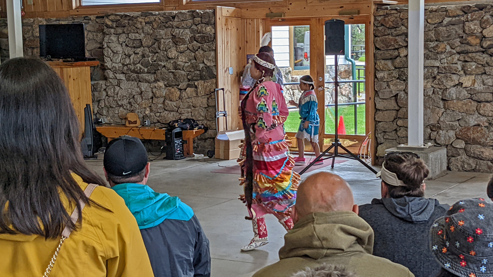 Wir besuchen eine interessante Tanzvorführung, bei der ein kleines Mädchen einen Hoop Dance und seine ältere Schwester den Jingle Dance (Glöckchen-Heiltanz) darbieten, während ihre Mutter die Hintergründe erklärt.