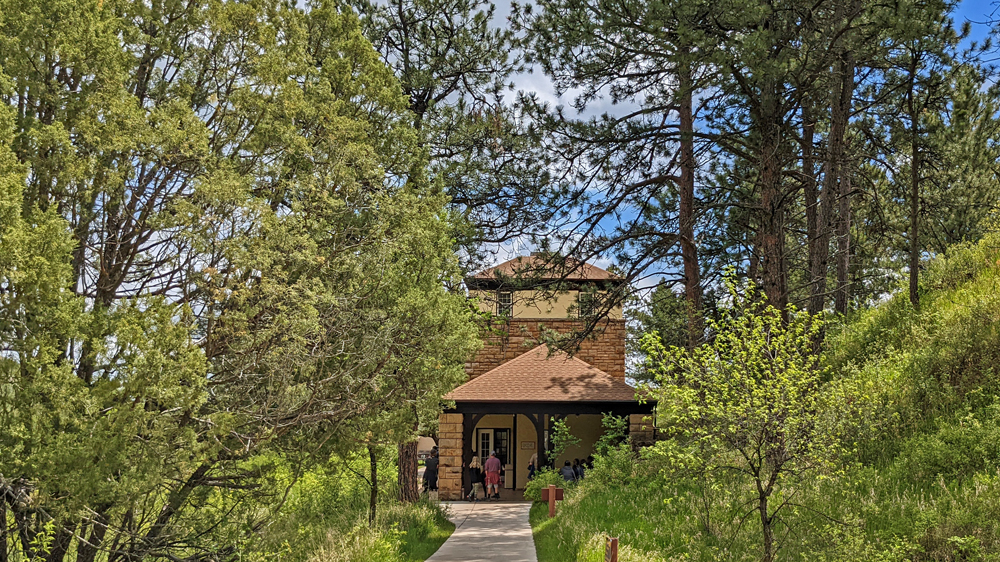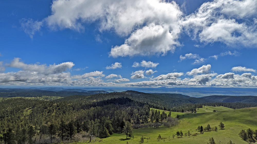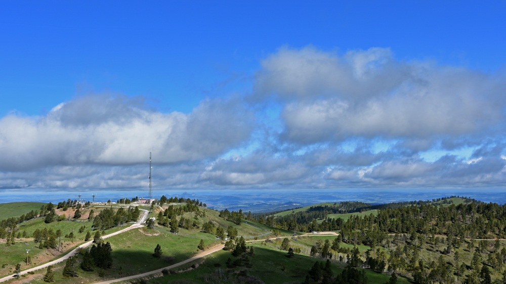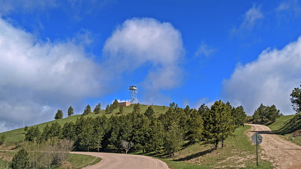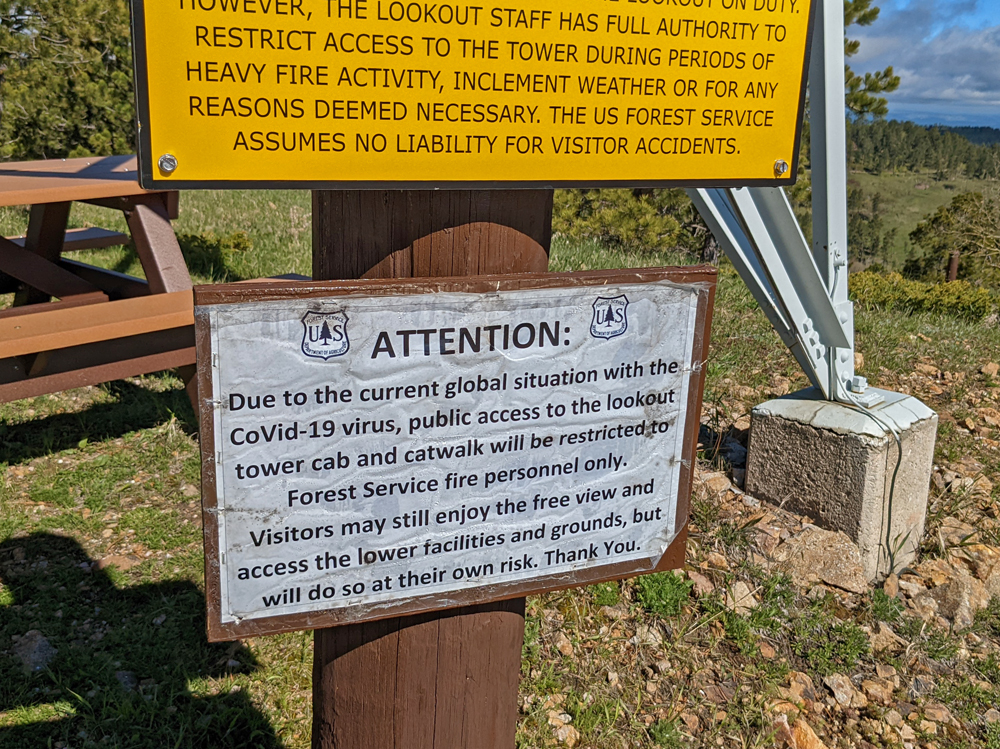 Am nächsten Morgen ist alles wie frisch gewaschen und die Sonne strahlt zwischen den dahinziehenden Wolkenfetzen vom Himmel! Perfekt, um dem nahegelegenen Warren Peak Fire Lookout Tower einen Besuch abzustatten. Die Aussicht ist grandios – auch wenn man nicht bis ganz hinaufkann. Wegen Covid (no comment…). Der BLick schweift über die bewaldeten Black Hills, eine ehemaligen USAF-Radar Station aus dem Kalten Krieg (Sundance Radar Station, die Einzige, die mit nuklearer Energie betrieben wurde) sowie fast den Devil’s Tower. Fast, weil man den nur von der obersten, gesperrten Plattform sehen kann… Also nichts wie hin!