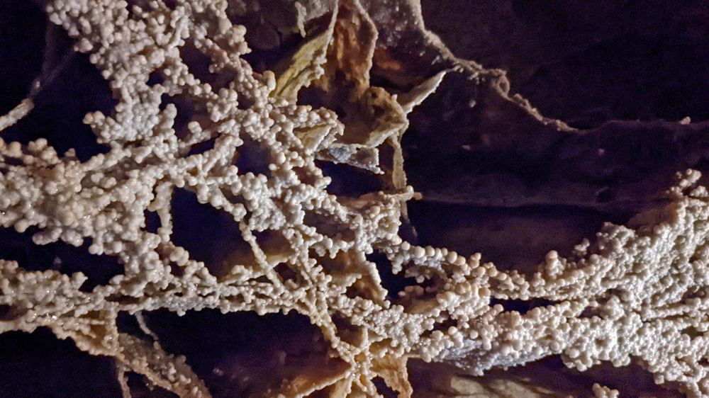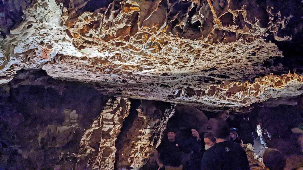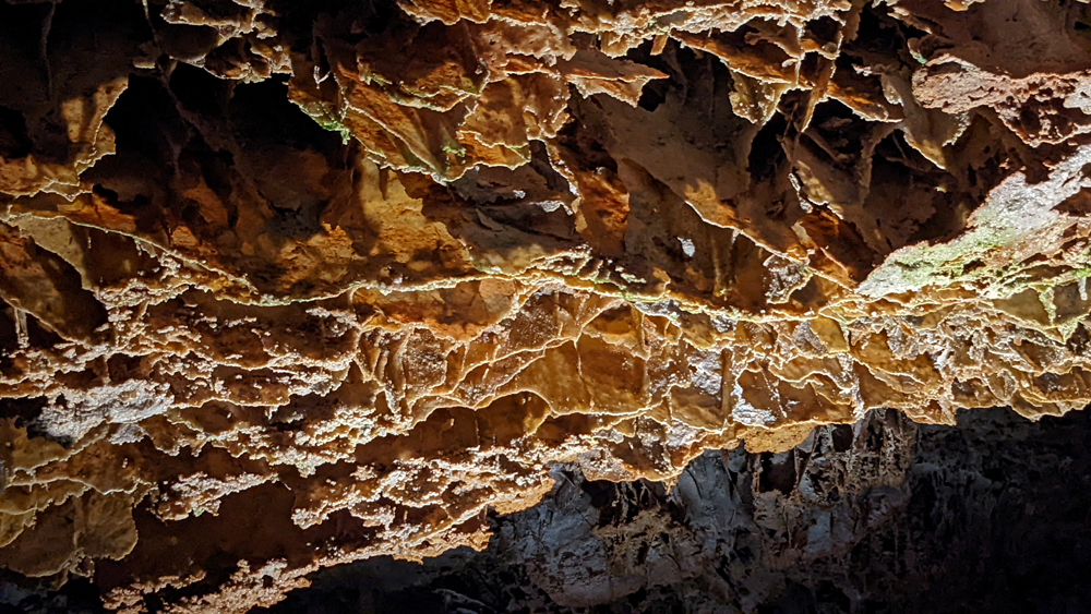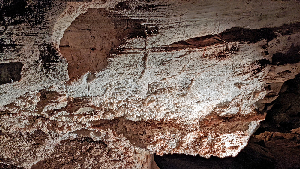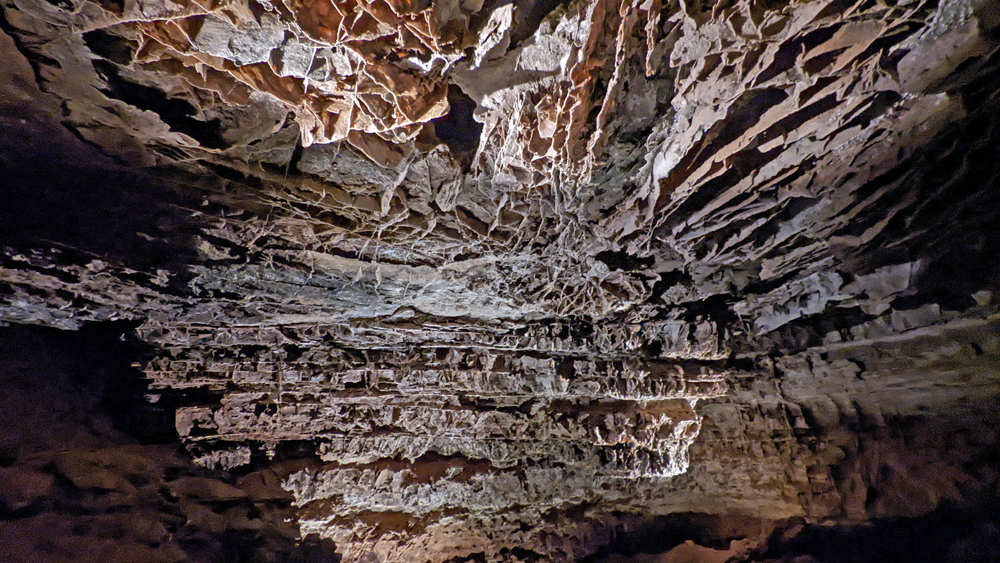 Man darf nur mit Führung ins – angeblich – komplexeste Maze Cave System. Mit der ausgewählten Fairgrounds Tour werden wir per Lift in die Tiefe und wieder hinauf befördert und bekommen dazwischen einen Teil von zwei der drei Levels zu sehen. Die Wind Cave erinnert uns von den Passagen und Gängen her an die Kalksteinhöhlen Missouris (Mark Twain) und Kentuckys (Mammoth Cave). Speziell für diese Höhle ist das sogenannte boxwork (hier gibt es so viel oder mehr als in allen anderen Höhlen der Welt zusammengenommen): dünne Kalzit-Finnen, die in ehemaligen Spalten entstanden und durch die Erosion freigelegt worden sind. Mit ihrer polygonalen Anordnung und teils noch geschlossenen Zellen erinnern die Formationen tatsächlich an eine Aneinanderreihung von verschieden grossen Schachteln bzw. an die Füllung von Wellkarton. Mega cool! Daneben gibt es noch Cave Popcorn, Kalzit-Kristalle und ein bisschen Frostwork zu bestaunen.