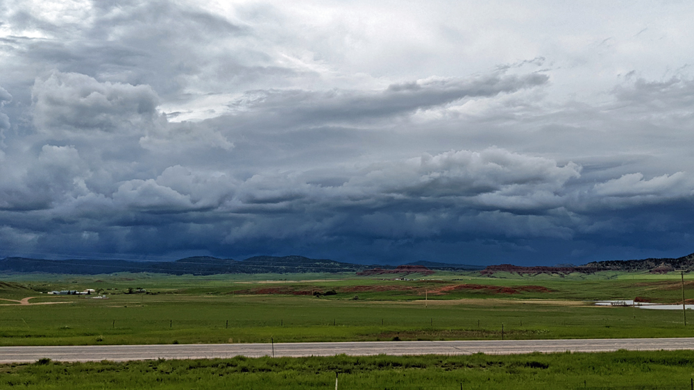 Bald gelangen wir nach Wyoming, wo es nicht viel anders aussieht: über allen Höhenzügen dräuen dicke, schwarze Wolken. Es ist mitten am Nachmittag richtig dunkel und die Temperaturen sind inzwischen auf 6 Grad gefallen!
