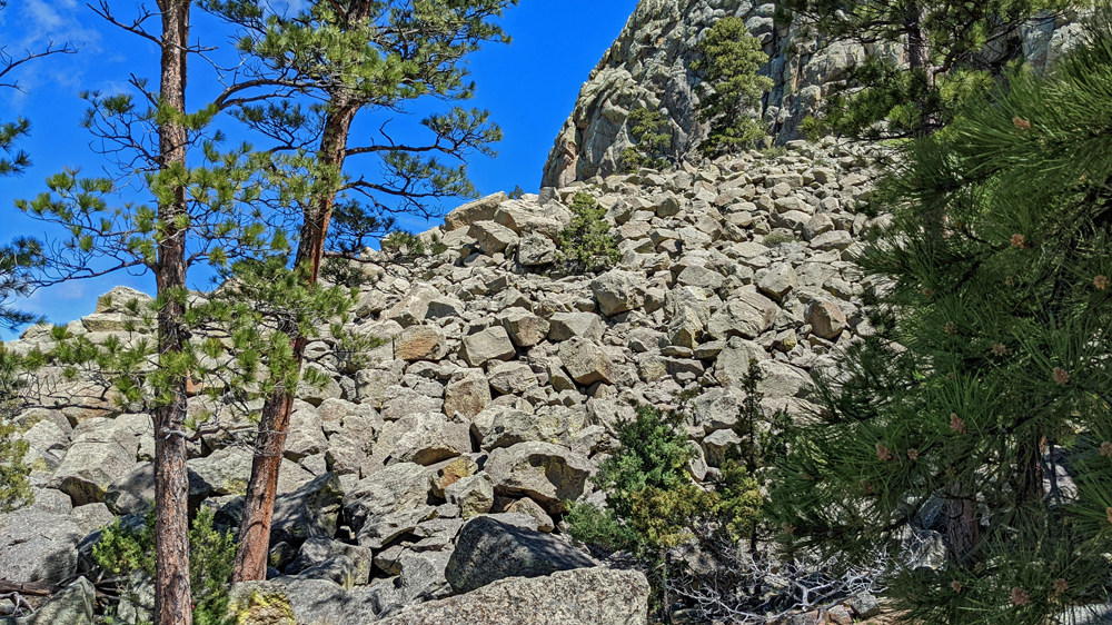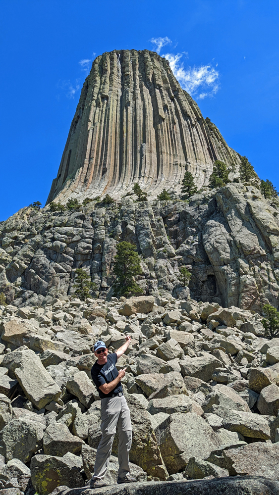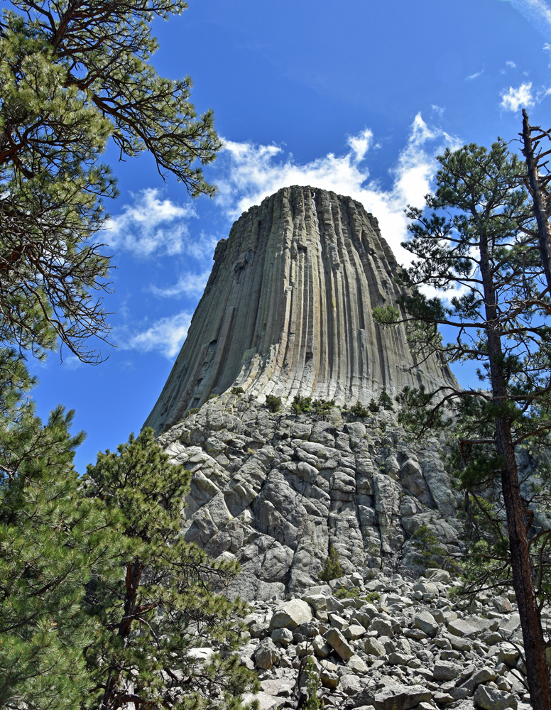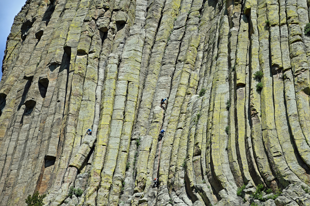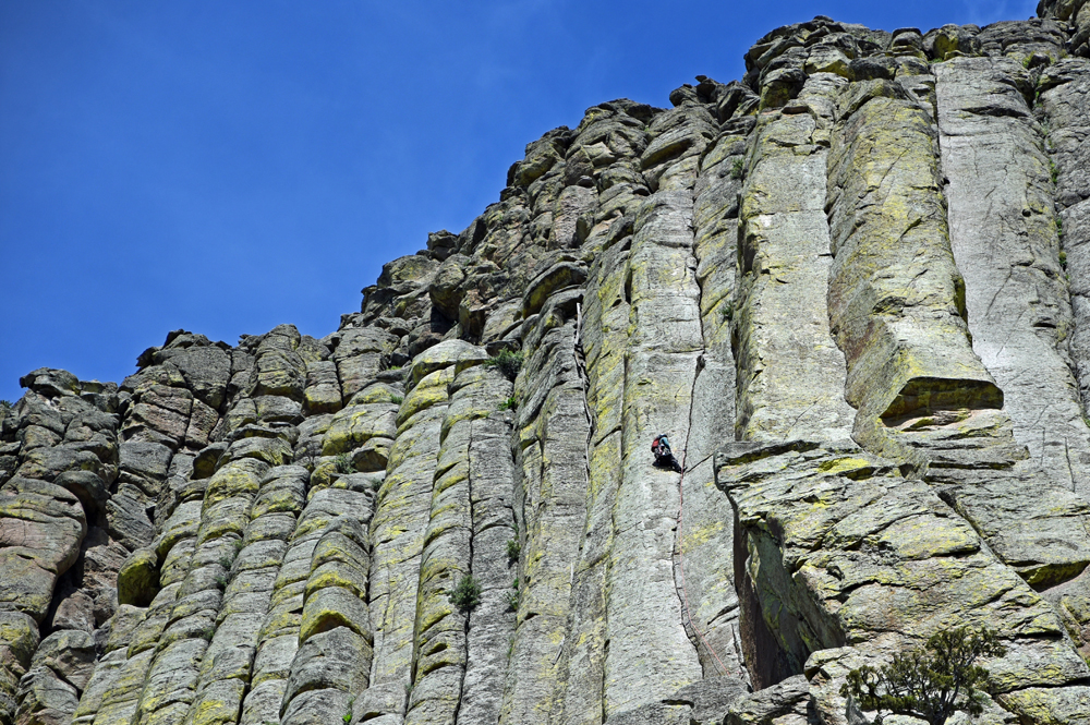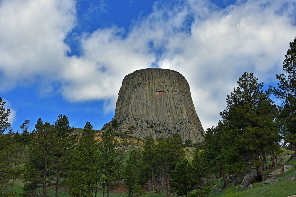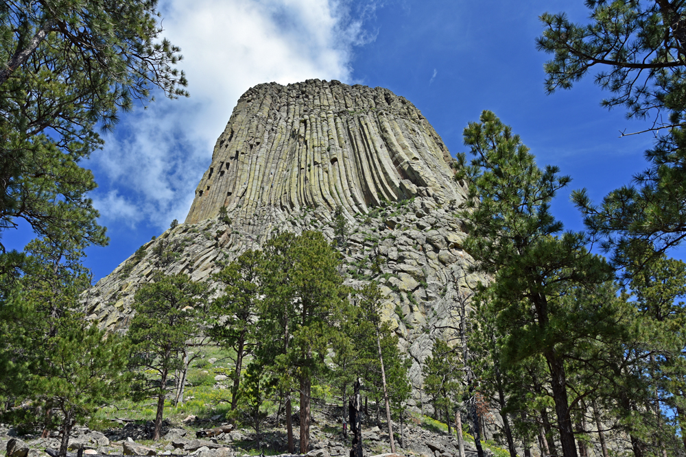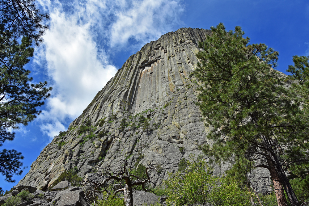 Diese aussergewöhnliche Landmarke ist den umgebenden Stämmen heilig. Was 1875 von einem Colonel Devil’s Tower / Teufelsturm genannt wurde, heisst bei den umgebenden Stämmen wegen der langen, als Kratzspuren interpretierten Rillen zwischen den Basaltsäulen unter anderem Mato Tipila (Bären-Tipi / bear lodge). Viele Bäume entlang des Pfades tragen farbige Gebets-Stofffetzen und im Juni wäre der Berg eigentlich den Indianern vorbehalten. Doch das ist freiwillig und wir entdecken mehrere Kletterer an der Westseite (die Ostseite ist wegen brütender Falken gesperrt. Auf nicht-freiwilliger Basis…).
