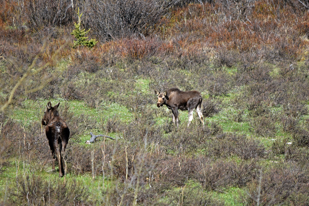 Kurz bevor wir abfahren wollen, erhalten wir Besuch: Eine Elchkuh geht mit ihrem Jungen direkt neben unserem Auto vorbei, um zu ihren Lieblingsbüschen weiter unten zu gelangen. Während sie mit Knabbern beschäftigt ist, erkundet das Junge selbständig die Umgebung. Das passt der Mutter gar nicht und sie geht es unter drängenden uuuuh-, uuuuh-Rufen suchen, sobald sie sein Fehlen bemerkt. So schön!!!