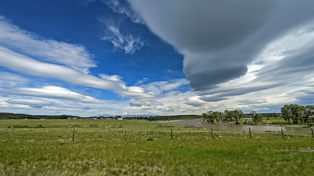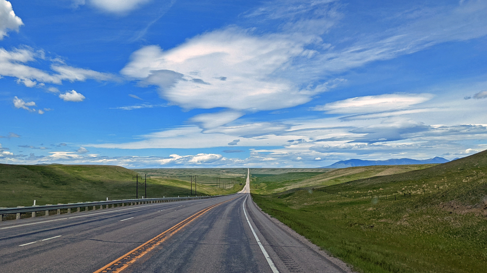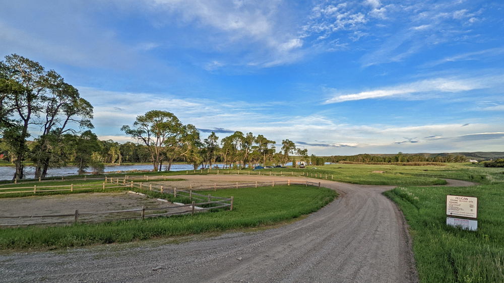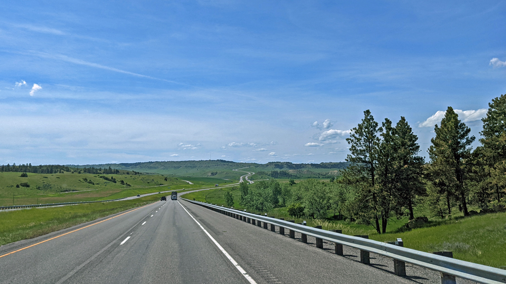 Bald gelangen wir nach Montana, wo sich die sanften Hügel und die Prärielandschaft Ost-Wyomings fortsetzen. Die Interstate windet sich zwischen den Hügeln hindurch, der Himmel scheint sich endlos über uns zu wölben und wir können immer wieder einmal Pronghorns entlang der Strasse sehen. In der Ferne erheben sich die Schneeberge, während es hier unten in der Ebene 27 Grad warm ist. Am Abend übernachten wir doch immerhin auf einem hübschen Platz am Yellowstone River, wenn wir schon nicht in den Nationalpark fahren…