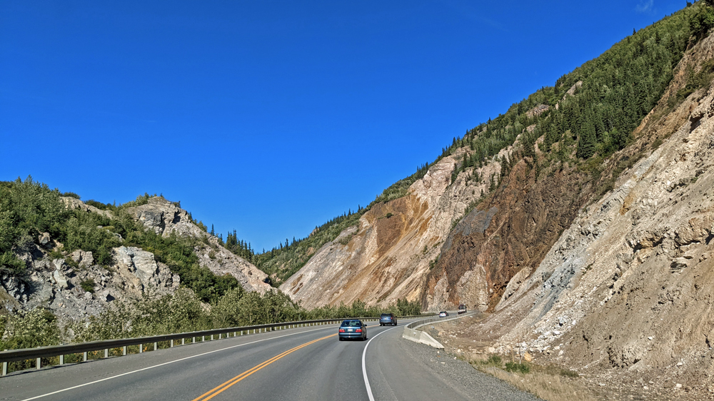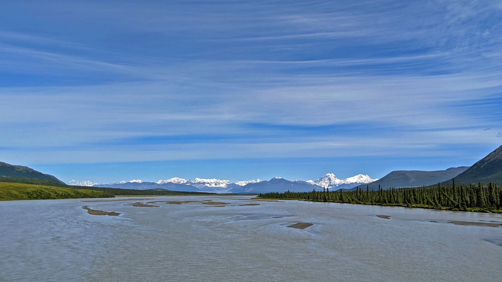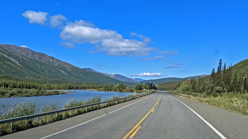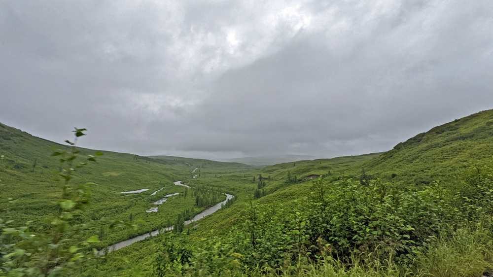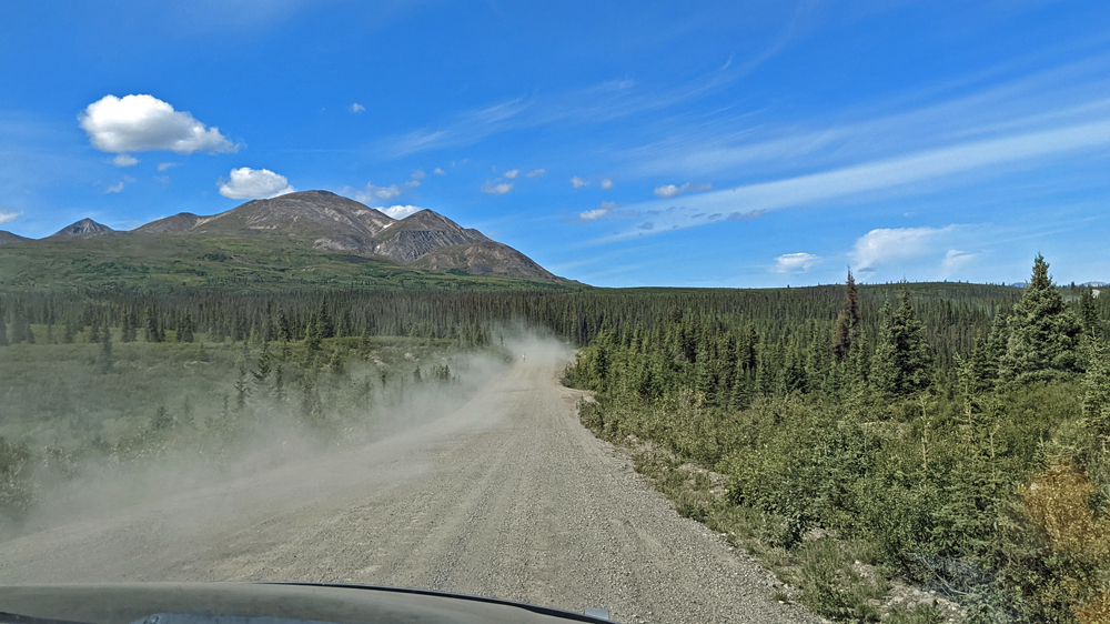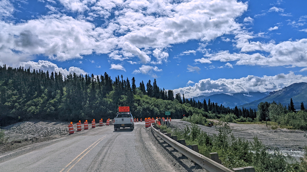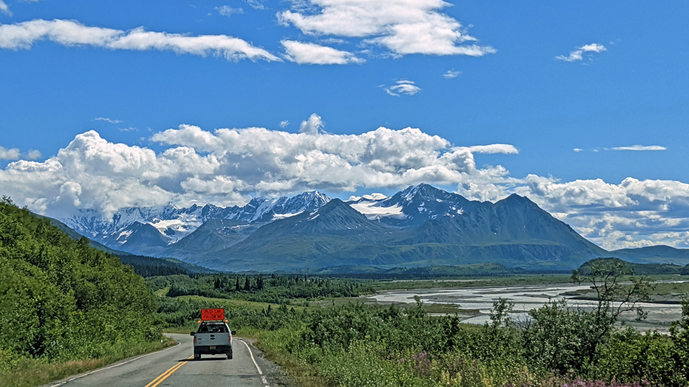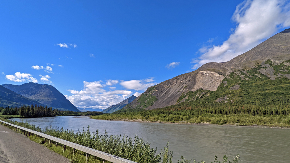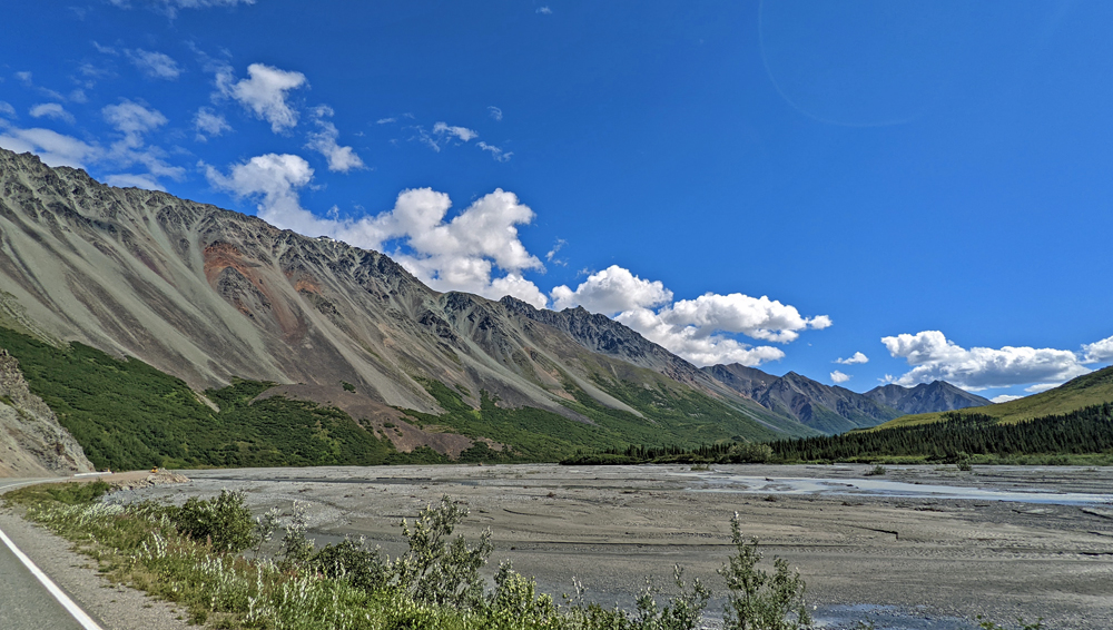 In Delta Junction werden unsere Dieseltanks wieder komplett gefüllt (mal schnell 440.- USD weg…), bevor wir dem Richardson Highway nun nach Süden folgen. Das Wetter ist zunächst noch sehr düster, klart dann aber zunehmend auf, je näher wir der Nordflanke der Alaska Range kommen (die Temperatur beträgt aber trotzdem nur frische 12 °C). Am 11. Juli hatten Überschwemmungen auf einer Länge von 25 km / 16 mi sieben Brücken des Highways weggerissen bzw. beschädigt und eine (nur!) einwöchige Sperrung dieser wichtigen Verbindung nach Valdez verursacht. Es wird noch lange dauern, bis die Schäden komplett behoben sind, doch ist die Strasse immerhin schon wieder einspurig befahrbar (mit Pilot Car). Dank des gemächlichen Tempos kann auch Ozy die immer schöner werdende Landschaft ausgiebig bewundern.