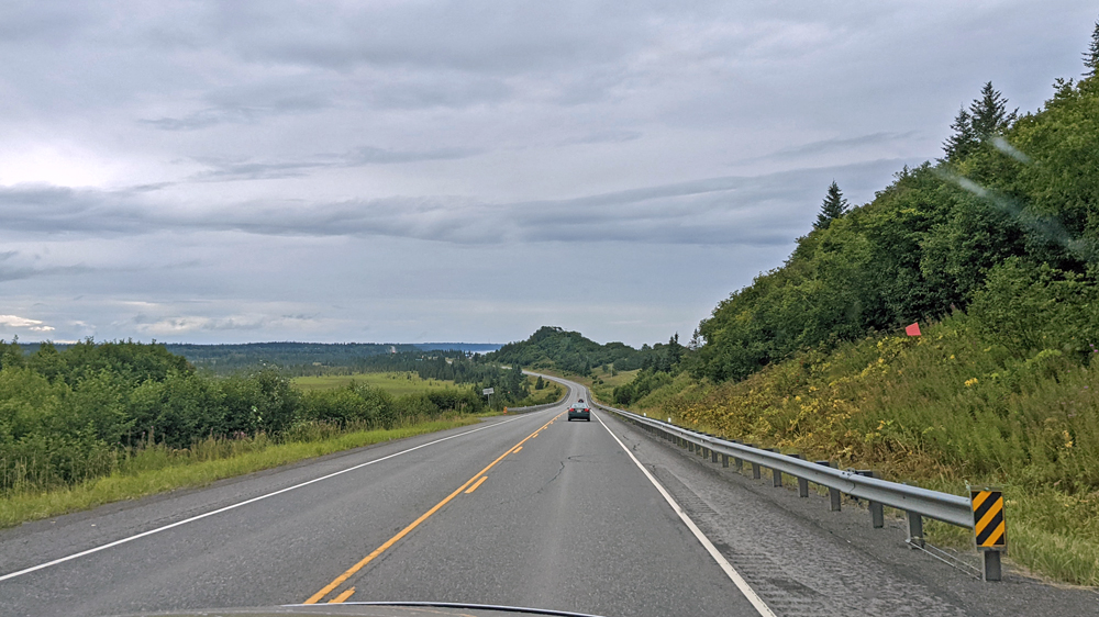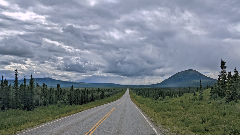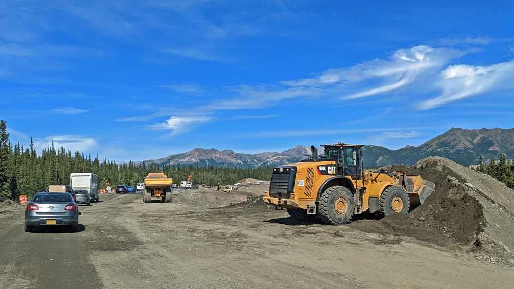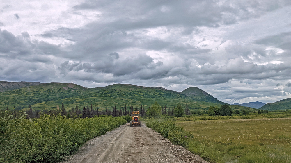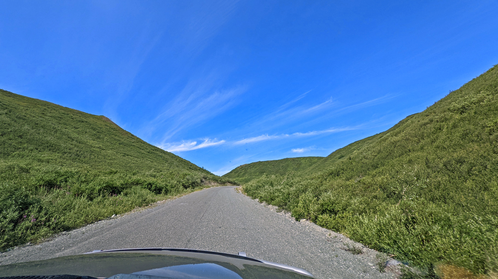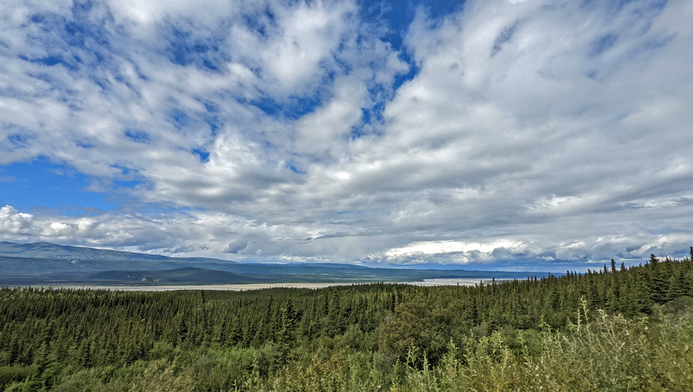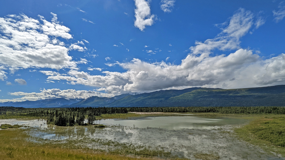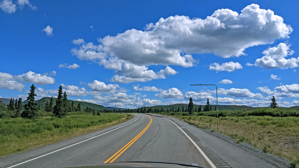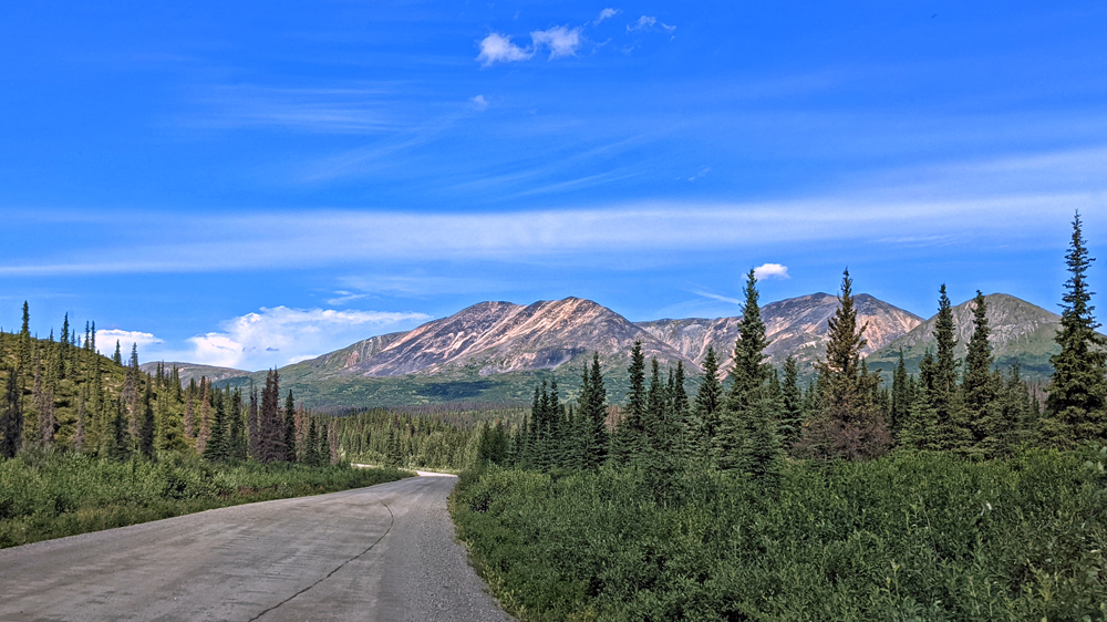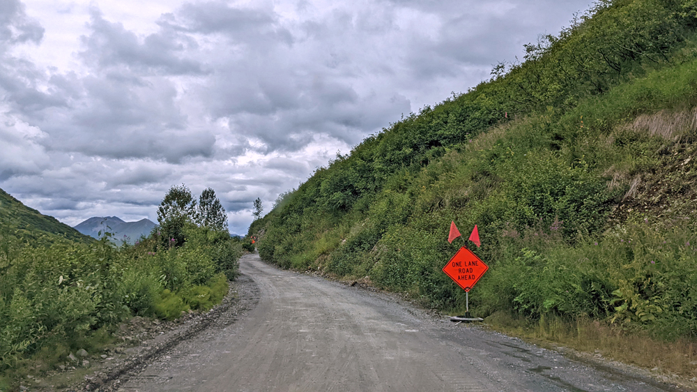 In Delta Junction werden unsere Dieseltanks wieder komplett gefüllt (mal schnell 440.- USD weg…), bevor wir dem Richardson Highway nun nach Süden folgen. Das Wetter ist zunächst noch sehr düster, klart dann aber zunehmend auf, je näher wir der Nordflanke der Alaska Range kommen (die Temperatur beträgt aber trotzdem nur frische 12 °C). Am 11. Juli hatten Überschwemmungen auf einer Länge von 25 km / 16 mi sieben Brücken des Highways weggerissen bzw. beschädigt und eine (nur!) einwöchige Sperrung dieser wichtigen Verbindung nach Valdez verursacht. Es wird noch lange dauern, bis die Schäden komplett behoben sind, doch ist die Strasse immerhin schon wieder einspurig befahrbar (mit Pilot Car). Dank des gemächlichen Tempos kann auch Ozy die immer schöner werdende Landschaft ausgiebig bewundern.