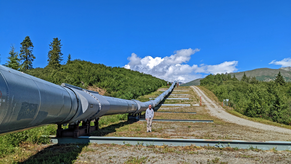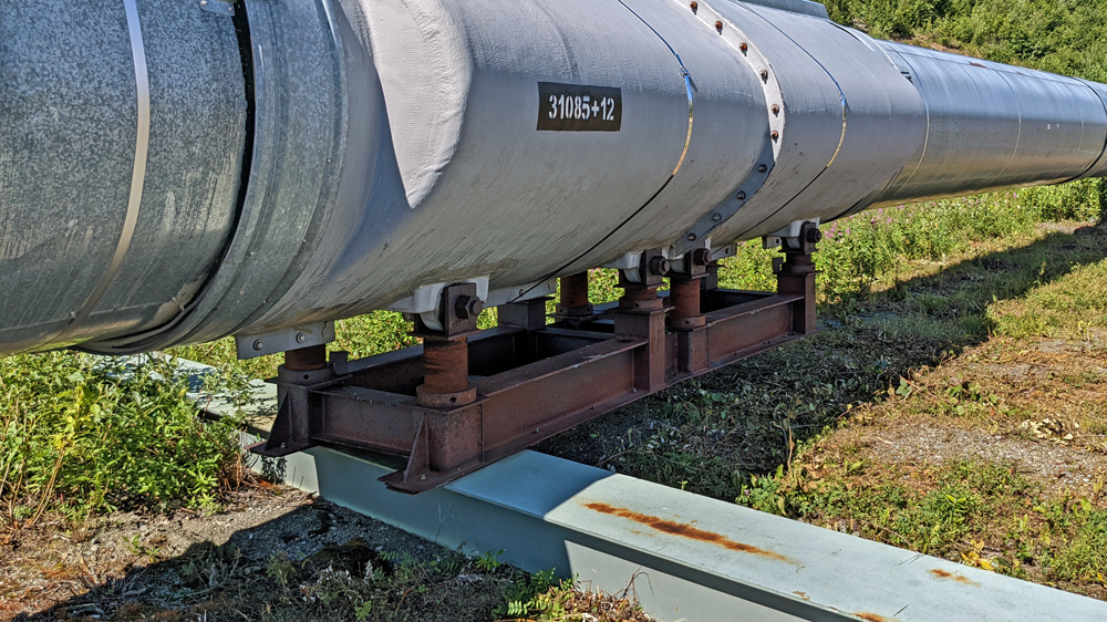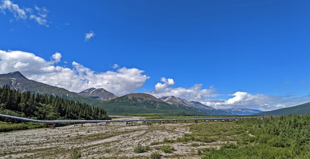 Bald stossen wir wieder auf die Alyeska-Pipeline, die das Öl von der Prudhoe Bay bis zum Terminal in Valdez bringt. Sie überquert auf dieser Strecke die besonders erdbebengefährdeten Denali-Verwerfung, die durch das Abtauchen der Pazifischen unter die Nordamerikanische Platte verursacht wird (auch «Schuld» an der Existenz der Alaska Range). Hier ist die Leitung auf speziellen Gleitschienen gelagert, was einen Bruch auch bei grossen seitlichen Verschiebungen verhindern soll.