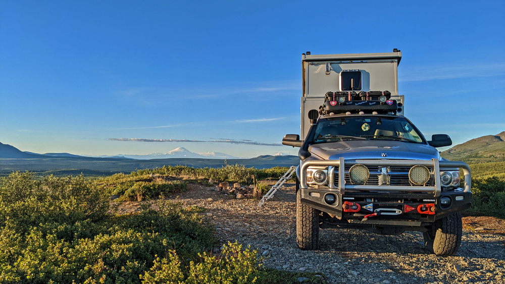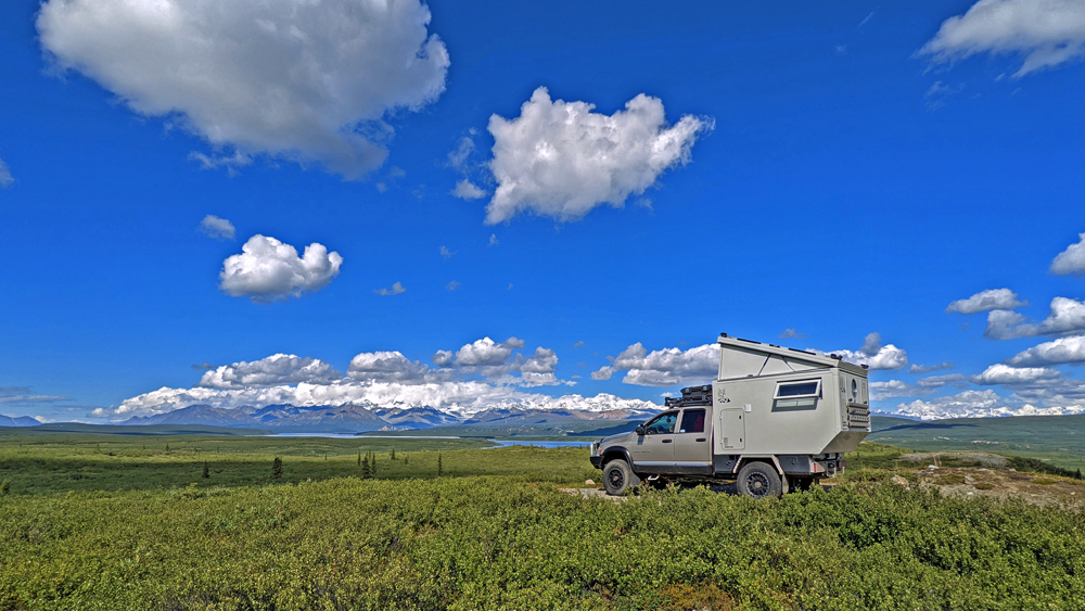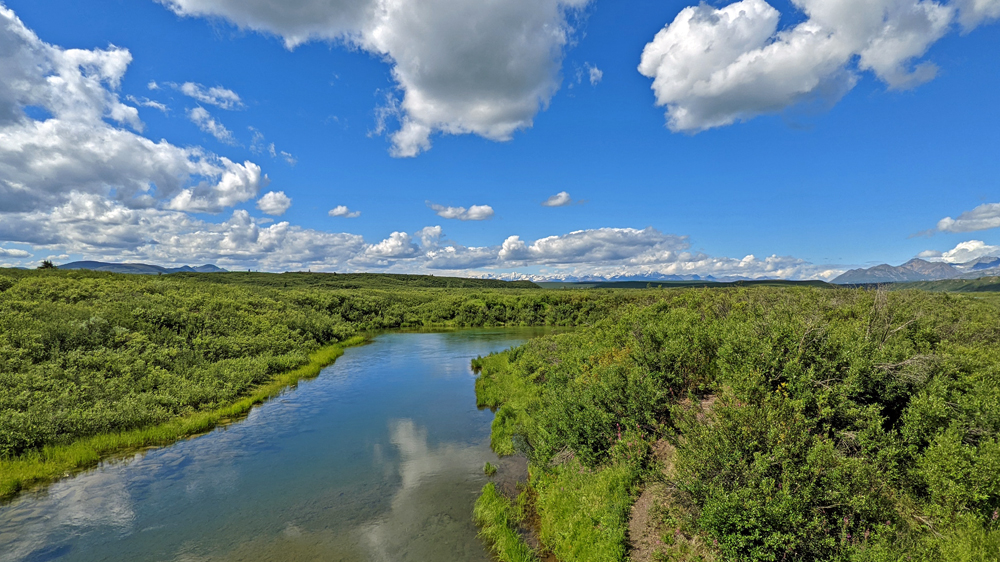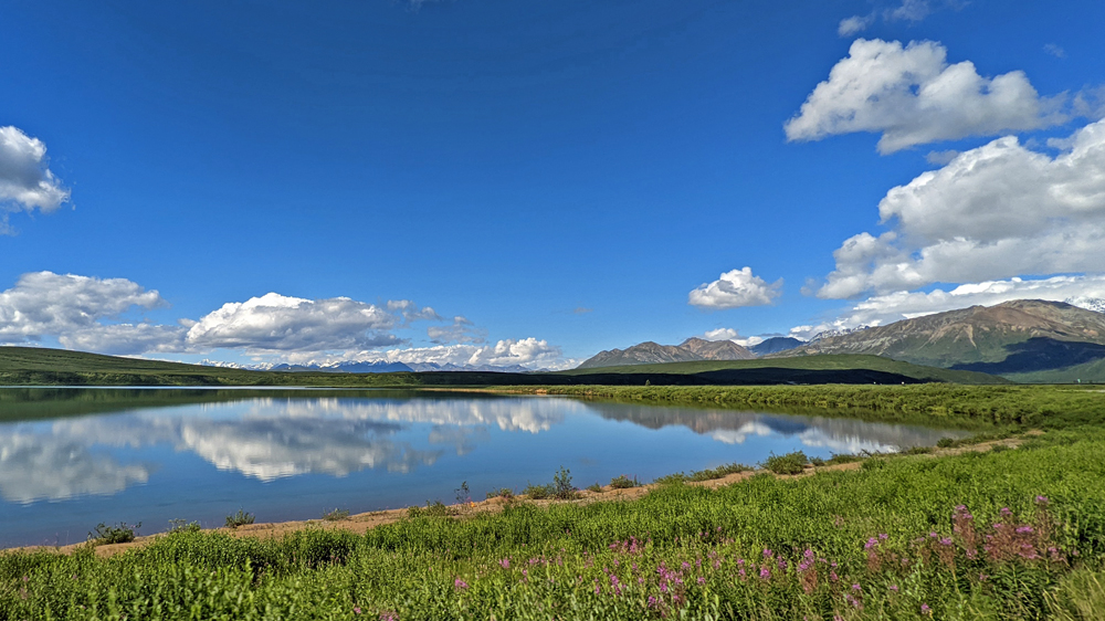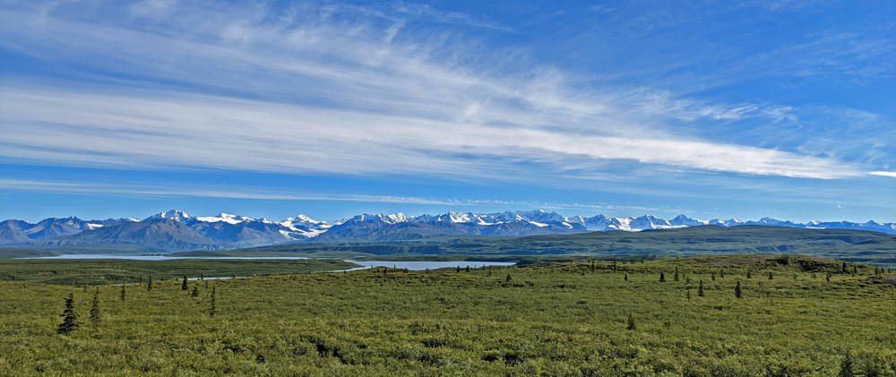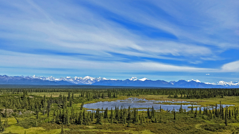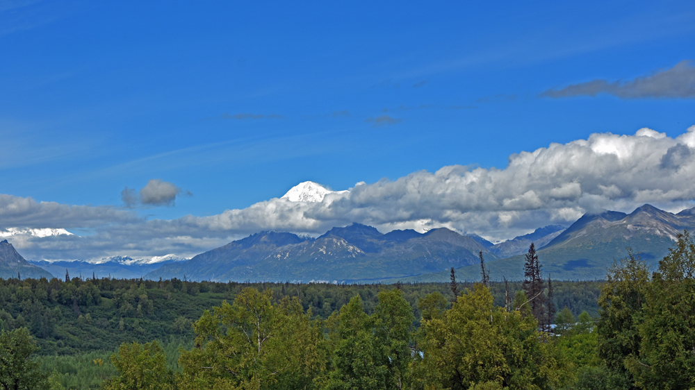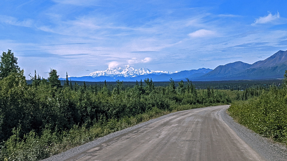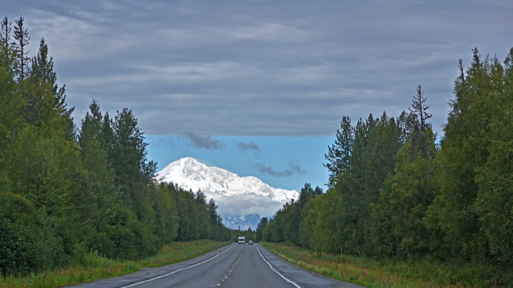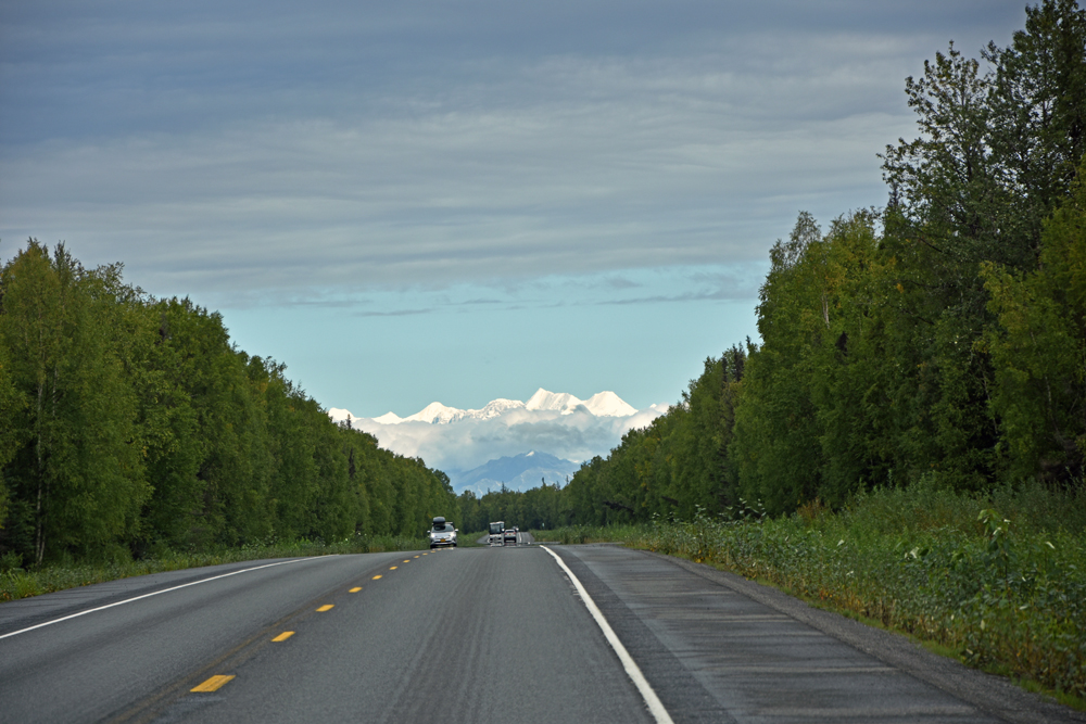 Es gibt keine Umfahrung und so kehren wir unverrichteter Dinge wieder zu unserem Übernachtungsplatz zurück, wo wir es uns gemütlich machen. Am nächsten Morgen starten wir einen neuen Versuch und zumindest für uns war die Verzögerung gut: weiter vorne sehen wir ein Stück blauen Himmel und als die Strasse eine Kurve macht, gibt der Grüne Kanal zuerst kurz einen Blick auf die Alaska Range und später sogar auf Denali frei! Wir haben noch ein paar Mal kurz das Vergnügen – jedes Mal, wenn die Strasse einen Moment in die richtige Richtung führt. Jetzt verstehen wir erst, warum alle so ein Theater machen! Der Berg ragt sozusagen aus dem Nichts rund 6’000 m in die Höhe (Talkeetna liegt auf 109 m ü. M., der Denali ist – mit Schnee – 6’190 m hoch).