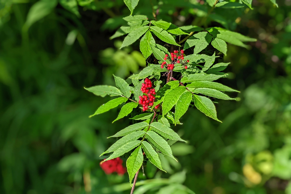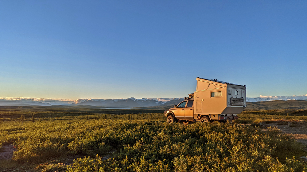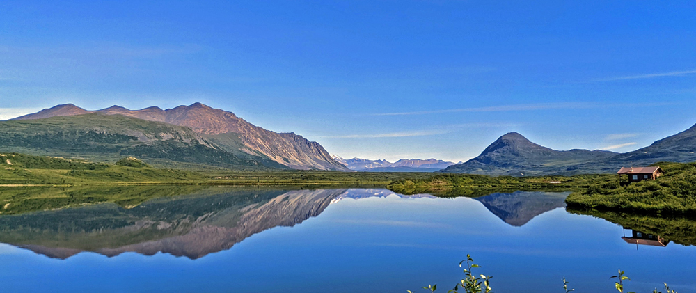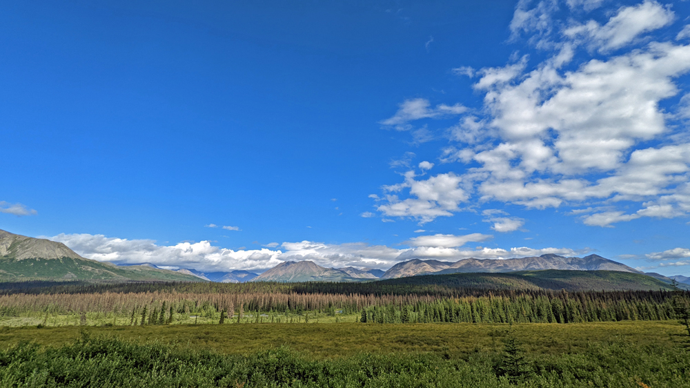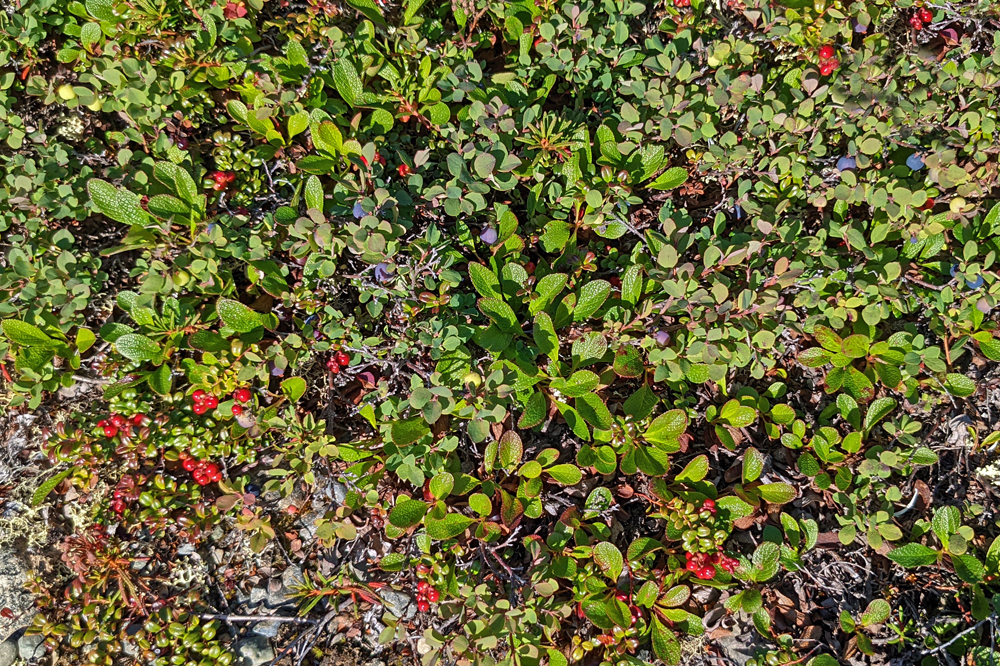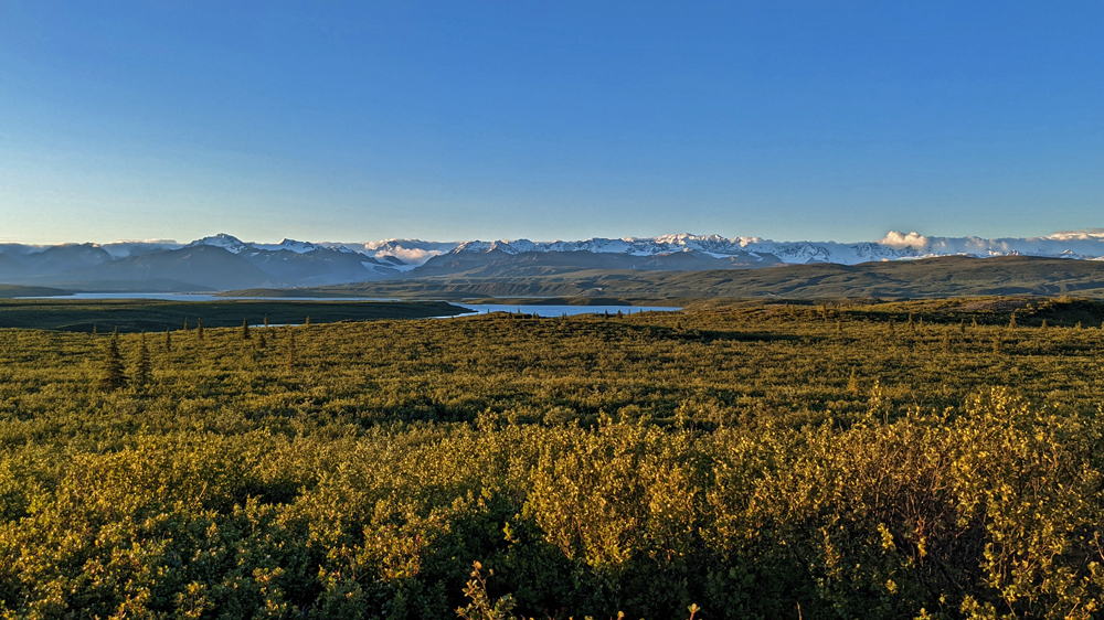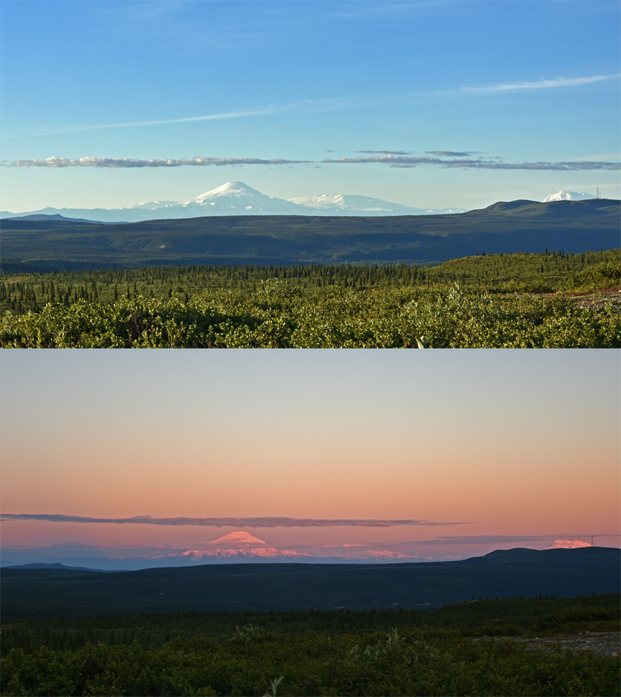 Wir stehen auf einem Hügel oberhalb des Summit Lake mit 360°-Blick auf die Alaska Range, den Gulkana Gletscher und den überaus beeindruckenden Mount Sanford, einen fast 5’000 m / 8’000 ft hohen Schildvulkan. Der Platz ist so toll (und das Wetter auch), dass wir gleich zwei Nächte bleiben. Ich kann mich an den sich während des Tages immer wieder verändernden Licht und Wolkenstimmungen über den Bergen nicht sattsehen und -fotografieren. Dazu wachsen um unser Auto rote Bearberries und Blueberries. Exzessives Beerenpflücken gebe ich jedoch bald auf, denn einerseits bläst ein eisiger Wind, andererseits dienen die Beeren offenbar nur als Köder – sobald ich mich hinunterbeuge und einen der Büsche störe, steigen Wolken von Moskitos und No-see-ums auf…