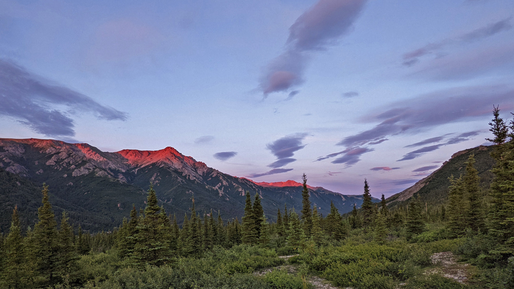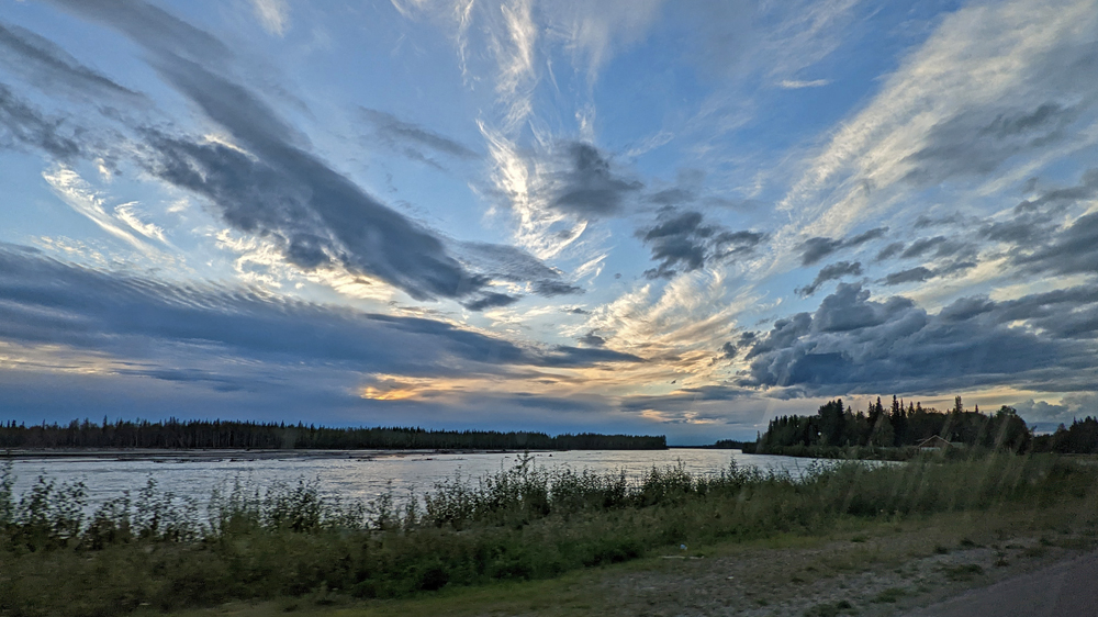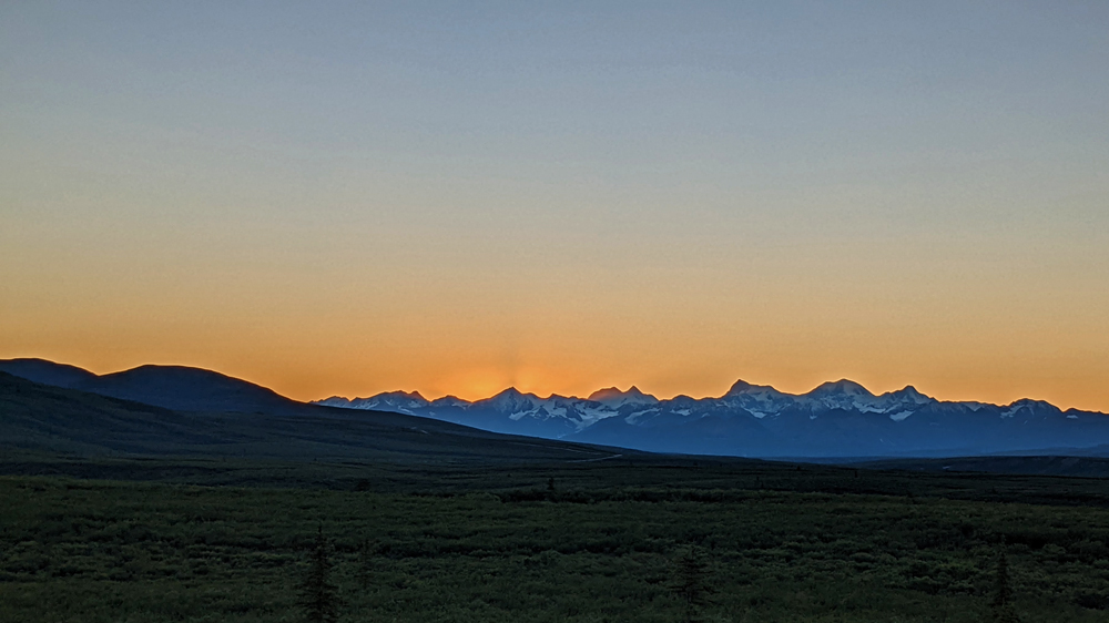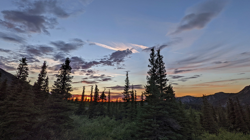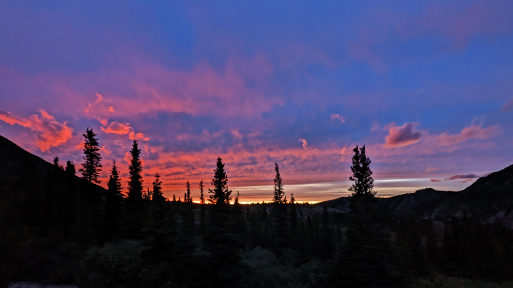 Kaum sind wir wieder nördlich der höchsten Gipfel sind die Wolken weg und wir sehen einen wolkenlosen strahlendblauen Himmel und Sonnenschein! Das erste Mal seit 15 Tagen (mit Ausnahme von 1 Tag), d.h. seit wir in das Gebiet südlich der Alaska Range gekommen sind! Was für eine Freude!!! Wir übernachten wieder auf «unserem» Hügel nördlich des Eingangs zum Denali Nationalpark, wo wir am Abend nochmals ein farbiges Wolken- und Licht-Schauspiel geniessen dürfen.