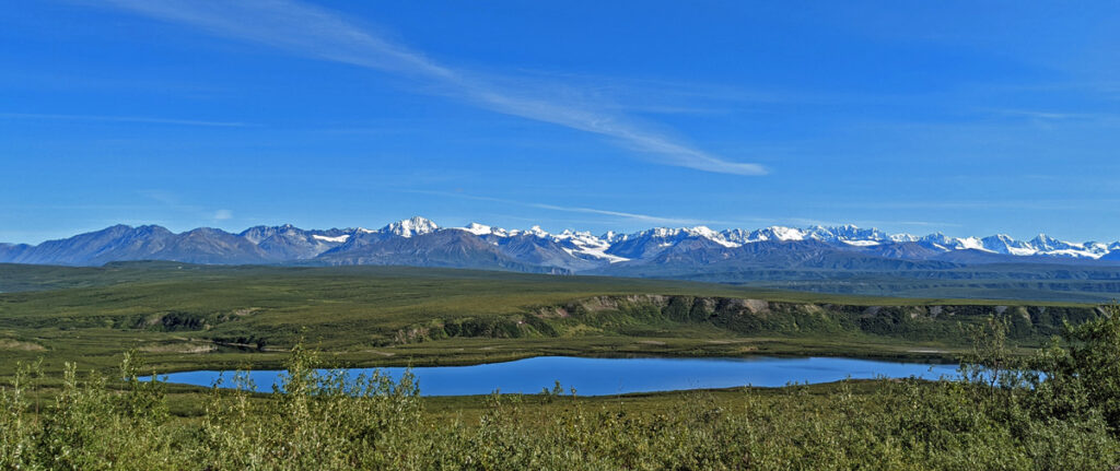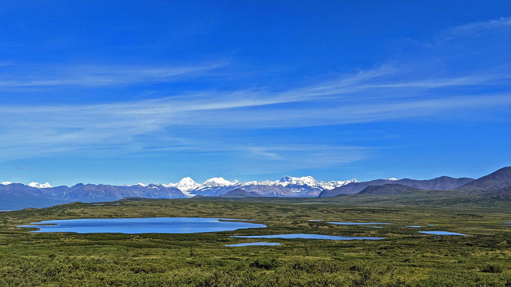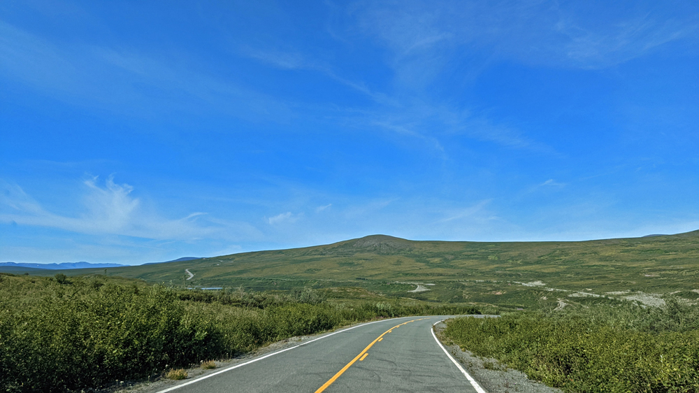 Als absolutes Highlight (auch wettermässig…) entpuppt sich die Fahrt auf dem Denali Highway. Na ja, zumindest der erste Teil davon. Der asphaltierte westliche Abschnitt führt oberhalb der Baumgrenze durch eine alpine Tundralandschaft voller blau leuchtender Seen und grüner Hügel, durch Täler und auf Eskers und bietet immer wieder atemberaubende Ausblicke auf die diversen schneebedeckten Berge der Alaska Range. Absolut traumhaft! Der östliche Abschnitt ist dann einserseits von der Strasse (Kiessstrasse mit vielen, fiesen Schlaglöchern) andererseits vom Ausblick her (unterhalb der Baumgrenze und daher wieder sichtmässig sehr beschränkt) wesentlich weniger reizvoll. Wir treffen dort auch immer wieder auf Radfahrer, die bei jedem vorbeifahrenden Auto im Staub versinken und fragen uns erstens, wo die überhaupt herkommen und zweitens, weshalb sie sich sowas antun (eine Frage, die sich vermutlich nur Nicht-Radfahrer stellen…).