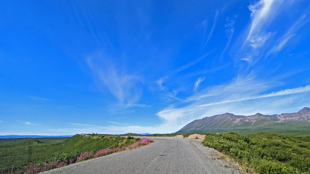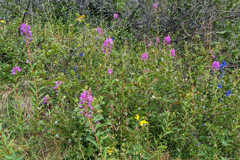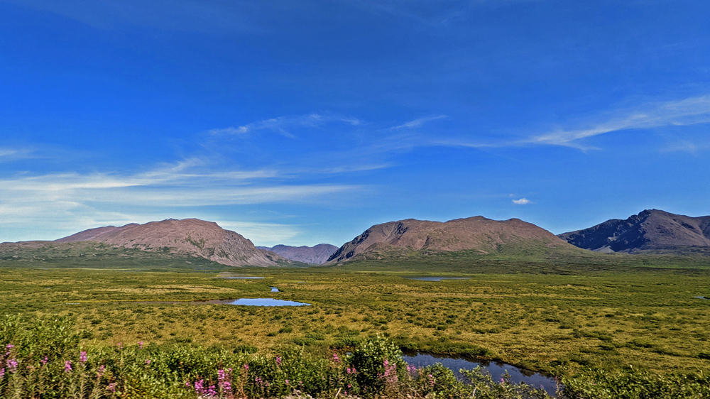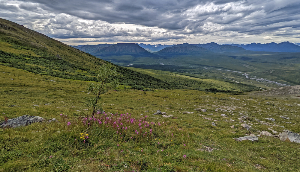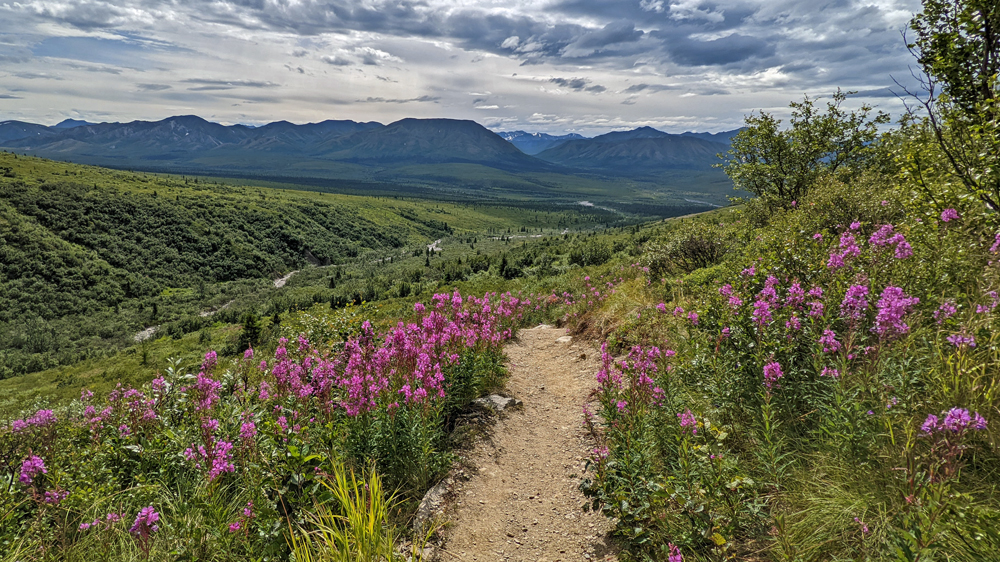 Wir fahren also so weit wie es auf eigenen Rädern geht, wobei wir ein einsames Karibu sichten. Vom Savage River starte ich auf den Alpine Trail, während sich Ozy an dessen Ende einen Parkplatz sucht und netterweise gut zweieinhalb Stunden auf mich wartet, während ich den ordentlich steilen, aber mit wunderschönen Blumen bestückten Weg wandere. Die Ausblicke sind auch ganz hübsch, wenn auch nicht so spektakulär wie erwartet. Obwohl der Park den gleichen Namen hat wie der Berg – ehemals Mount McKinley, seit 2015 offiziell Denali, was in der Sprache der Athabaska «Der Hohe (Berg)» heisst – und dieser auch auf dem Gebiet des Denali National Park and Preserve liegt, wurde das Schutzgebiet in erster Linie zur Erhaltung der Dall Sheep und ihres Lebensraums geschaffen. Das führt unter Umständen zu leichten Enttäuschungen… Ich weiss nicht einmal, ob ich den Berg von hier aus sehen könnte, denn dicke Wolken verhindern heute jegliche Sicht auf höhrere Berge.