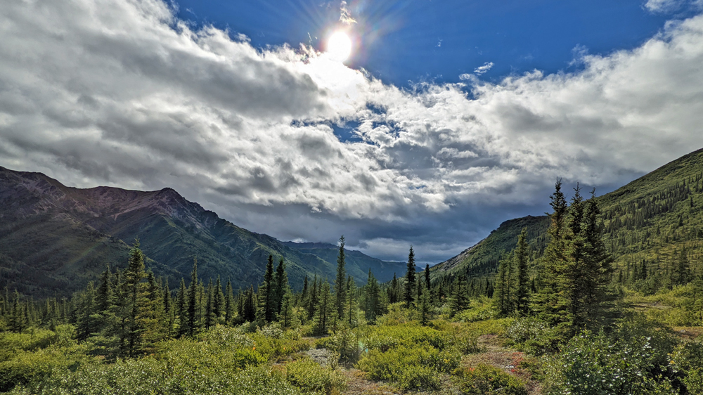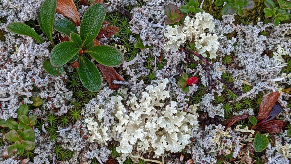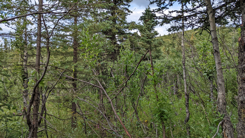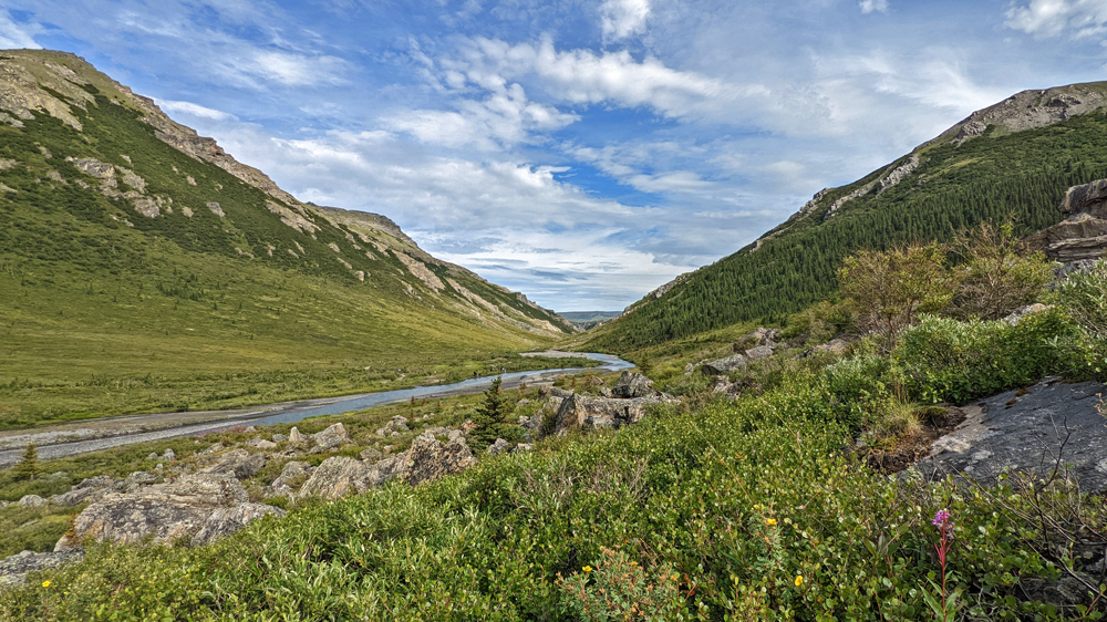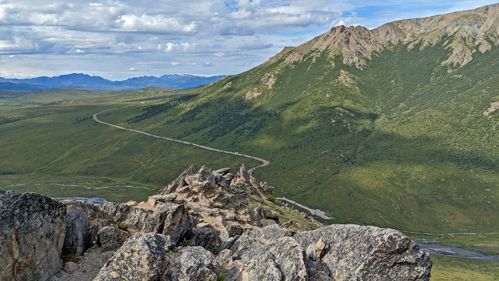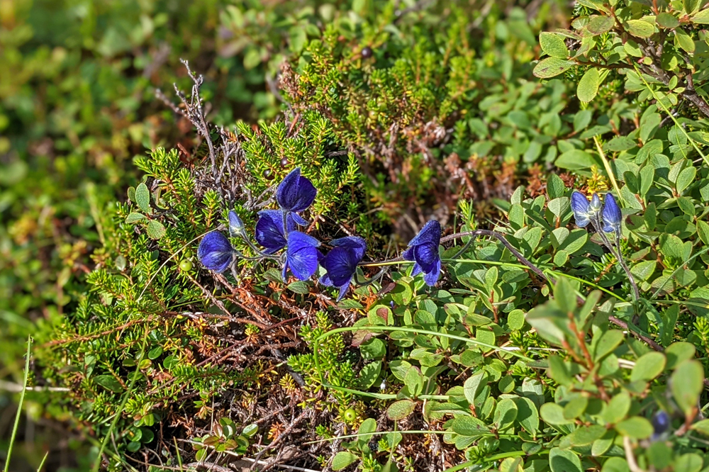 Wir fahren also so weit wie es auf eigenen Rädern geht, wobei wir ein einsames Karibu sichten. Vom Savage River starte ich auf den Alpine Trail, während sich Ozy an dessen Ende einen Parkplatz sucht und netterweise gut zweieinhalb Stunden auf mich wartet, während ich den ordentlich steilen, aber mit wunderschönen Blumen bestückten Weg wandere. Die Ausblicke sind auch ganz hübsch, wenn auch nicht so spektakulär wie erwartet. Obwohl der Park den gleichen Namen hat wie der Berg – ehemals Mount McKinley, seit 2015 offiziell Denali, was in der Sprache der Athabaska «Der Hohe (Berg)» heisst – und dieser auch auf dem Gebiet des Denali National Park and Preserve liegt, wurde das Schutzgebiet in erster Linie zur Erhaltung der Dall Sheep und ihres Lebensraums geschaffen. Das führt unter Umständen zu leichten Enttäuschungen… Ich weiss nicht einmal, ob ich den Berg von hier aus sehen könnte, denn dicke Wolken verhindern heute jegliche Sicht auf höhrere Berge.