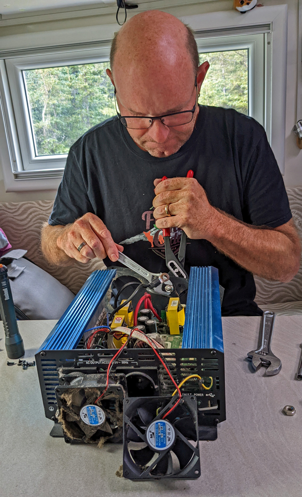Wir bleiben derweil auf «unserem» Hügel und Ozy untersucht, weshalb es uns in letzter Zeit häufiger die «Sicherung raushaut». Schliesslich findet er den Fehler: beim Inverter ist eine Schraube locker und die schlecht sitzende Verbindung hat immer wieder eine Überlastungs-Abschaltung ausgelöst. Nachdem die Schraube wieder sitzt, läuft der Inverter tiptop und unterstützt sogar unser mobiles Induktionsfeld auf höchster Stufe (1500 W), was vorher nie geklappt hat.