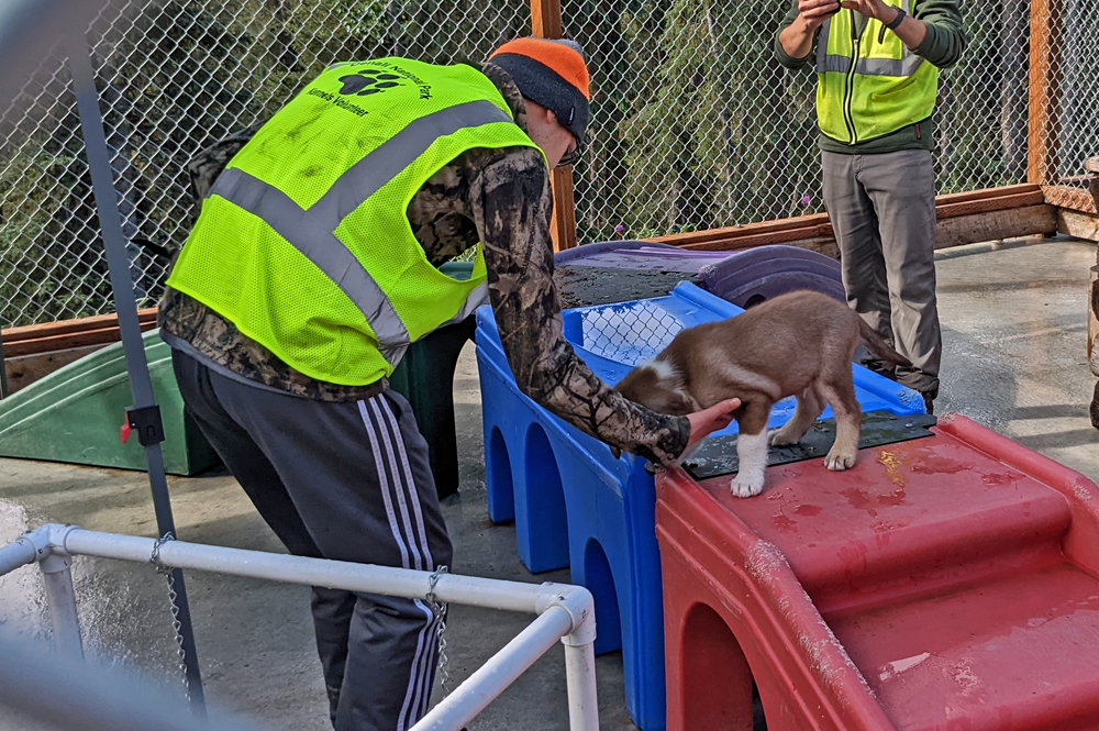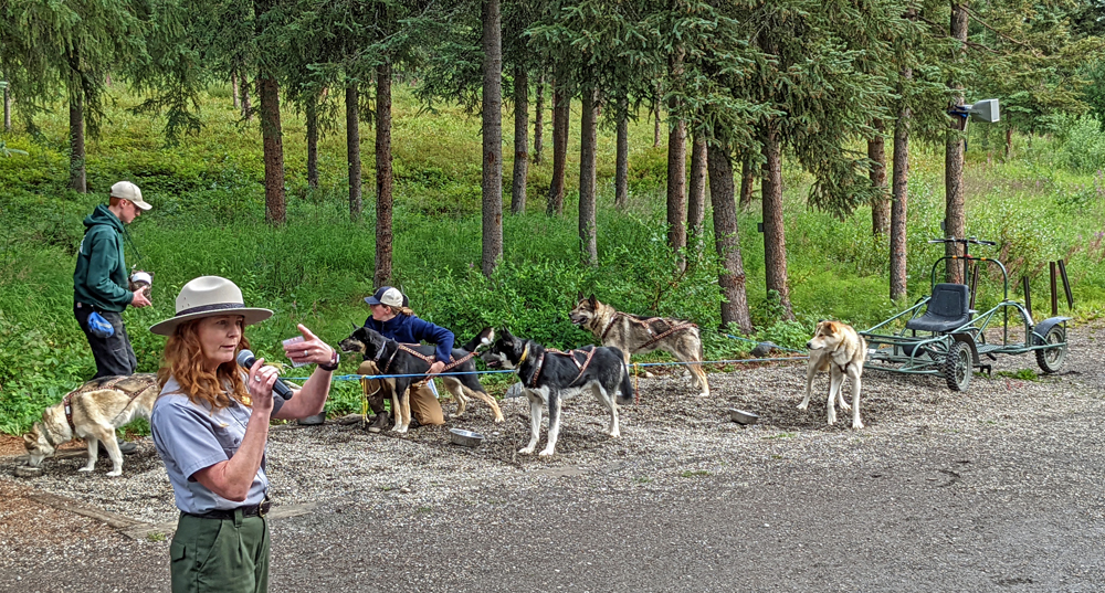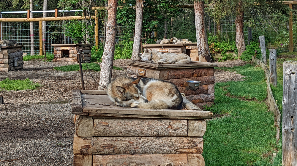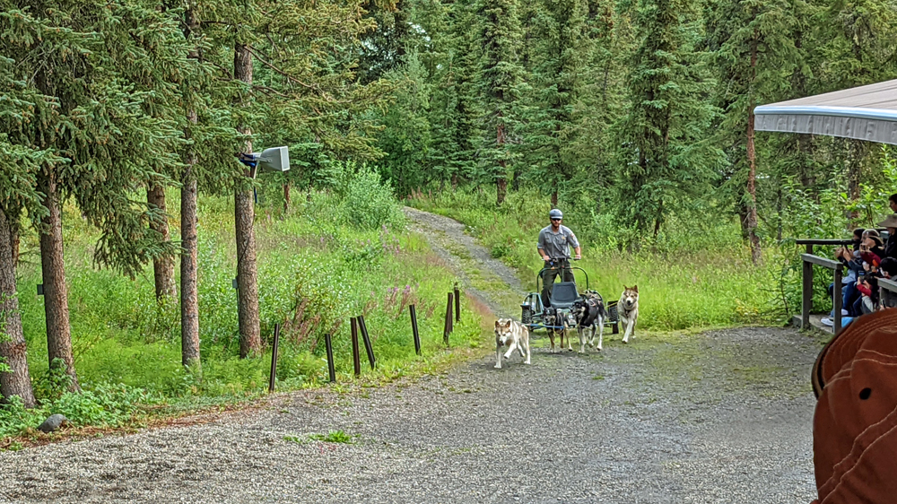 Die nächsten zwei Tage machen wir einfach mal Pause. Am 3. August raffen wir uns auf und gehen die Schlittenhunde-Demonstration im Nationalpark anschauen. Der Denali NP ist der einzige in den USA, der seine eigenen Schlittenhunde hat, um im Winter diverse Aufgaben zu erfüllen: Kontrolle des Nationalparks, Transport von Baumaterial in den Park und von im Sommer gesammeltem Abfall aus dem Park und nicht zuletzt Transportmittel für Forscher und deren Materialien. Im Park werden die Alaskan Huskies nicht nur gehalten, sondern auch gezüchtet, wobei besonderer Wert auf Stärke und Ausdauer gelegt wird (sie sind grösser und kompakter als die üblichen «Renn-Schlittenhunde» und haben ein besonders dichtes Fell). Wir haben vorher den sehr interessanten Film über die canine rangers im Visitor Center geschaut und hören jetzt anlässlich der Demo weitere spannende Geschichten und Informationen (Infos und Film unter: https://www.nps.gov/dena/planyourvisit/kennels.htm). Nachdem die Hunde angespannt wurden, das Gespann eine Runde gedreht hat, alles erklärt wurde und die Hunde selbst wieder zu ihren Plätzen im Zwinger gerannt sind, können wir die Tiere (neben den Erwachsenen hat es auch Welpen – sooo süss!) dann noch selbständig anschauen und die anwesenden Ranger mit Fragen löchern. Ein Ausflug, der sich wirklich gelohnt hat!