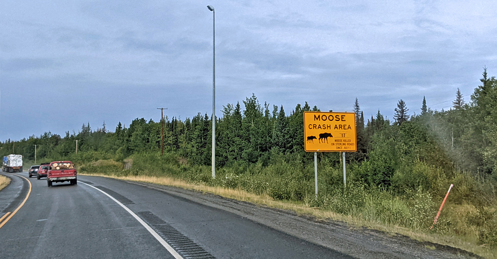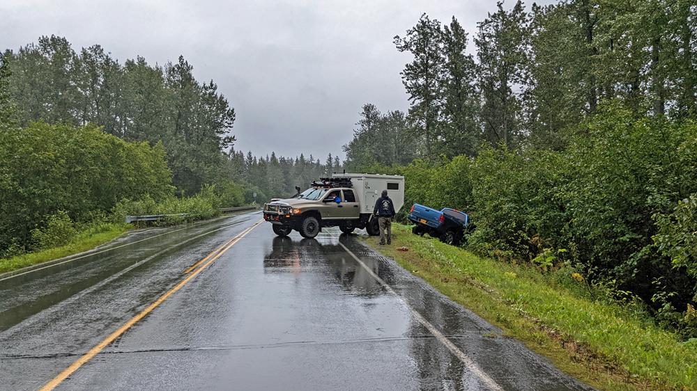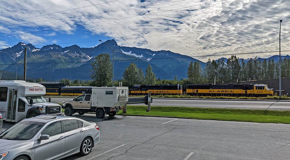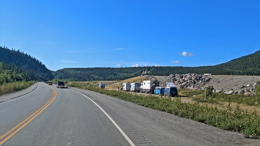 Am nächsten Morgen fahren wir durch Downtown Anchorage, damit wir wenigsten ein kleines bisschen von der Stadt gesehen haben, und folgen wieder dem Parks Highway, der uns nach Fairbanks bringen soll. Im Vitus in Chugiak erledigen wir Dusche und Wäsche und stellen uns dann auf «unseren» Platz an der Caswell Creek Fishing Site (kurzer Fisch-Versuch, aber ohne Erfolg). Am nächsten Morgen, nicht allzu früh, machen wir uns weiter auf den Weg nach Norden – nur um nach wenigen Kilometern am Ende einer langen Schlange anzukommen. Freundliche Mitmenschen informieren uns, dass es weiter vorne einen gröberen Unfall gegeben habe. Wenig später ist die Strassensperrung auch auf der Website des Verkehrsdienstes drauf. Mit voraussichtlicher Endzeit um 10.48 PM!