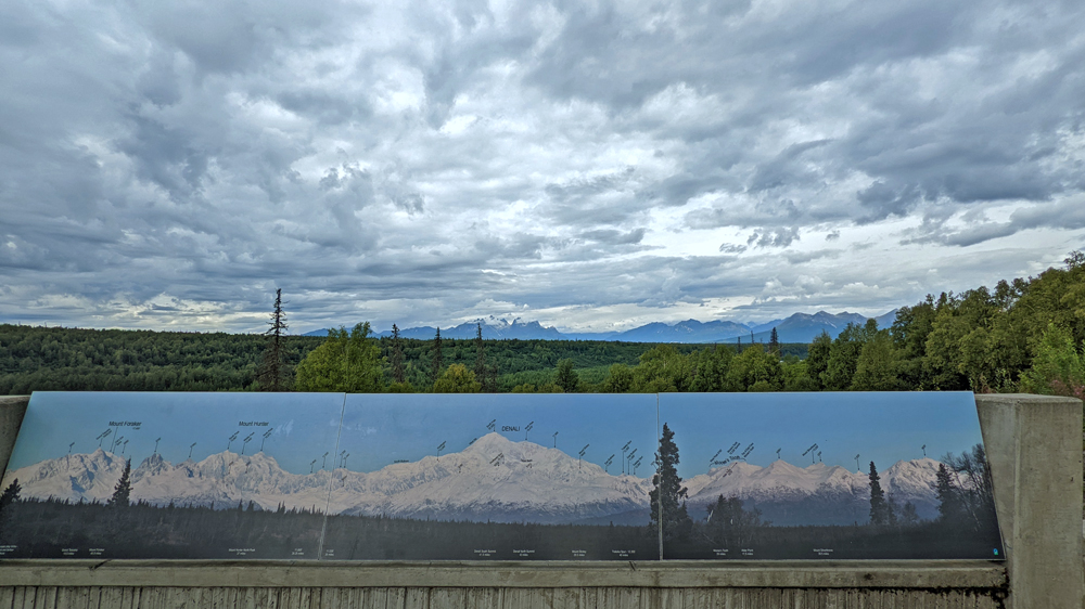 Wir verabschieden uns vorläufig von unseren Freunden (da auch sie auf dem Weg zur Kenai-Halbinsel sind, werden wir uns vermutlich irgendwo wieder treffen) und machen uns voller Vorfreude und bei strahlendem Sonnenschein auf den Weg – nur um festzustellen, dass sich die Wolken südseitig an der Alaska Range stauen: Vom südlichen Aussichtspunkt im Denali State Park sehen wir vom berühmten Berg sowie der ganzen, ebenfalls imposanten Bergkette nur das Foto auf der Übersichtstafel… Oh well.