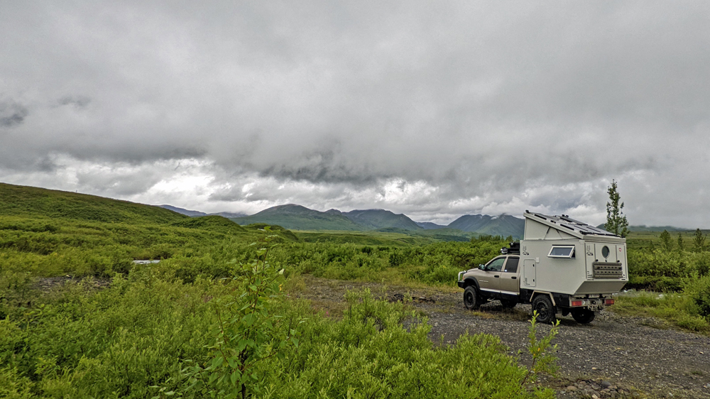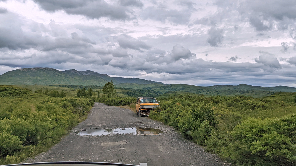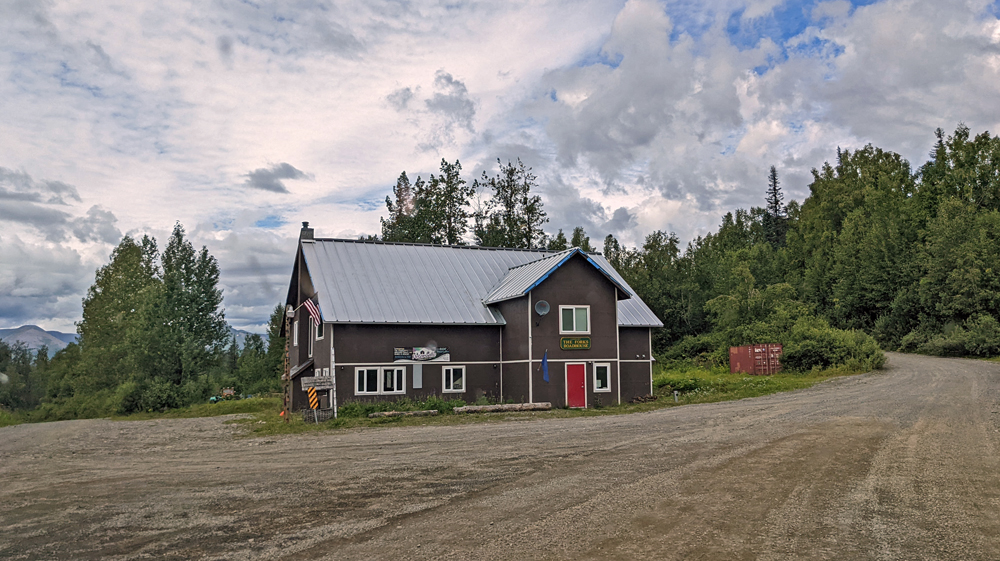 In Trapper Creek kaufen wir in Cubby’s Market ein (riesige Tomaten aus Alaska), bevor wir uns auf der Petersville Road in die Wildnis begeben. Durch Sümpfe (mit Elchen) und Wälder (mit Schneehühnern) geht es zum Forks Roadhouse. Danach wird die Strasse, die zur ehemaligen Goldgräberstadt Petersville führt, ziemlich schlecht. Aber es wird daran gearbeitet. Es hat fast keine Bäume mehr (vermutlich alle fürs Mining gebraucht…), was wir ausblickstechnisch sehr schätzen. Hoch über dem Peters Creek geht es weiter, bis wir nach der Überquerung eines Bachlaufs auf einer Insel einen hübschen Übernachtungsplatz finden, auf dem wir uns ein bisschen wie im Film «Into the Wild» vorkommen (der Bus stand sozusagen in der Gegend, einfach nördlich vom Denali NP). Es ist sehr wildromantisch hier und man könnte sogar legal Gold waschen (Petersville Recreational Mining Area). Da das Wetter für unseren Geschmack jedoch nicht sehr einladend ist (und wir zufällig unsere Goldpfanne nicht dabei haben 😉 ), machen wir es uns in unserem Häuschen gemütlich.