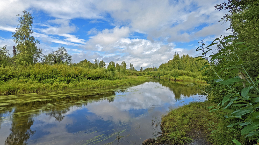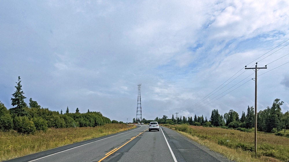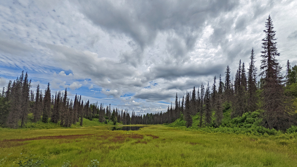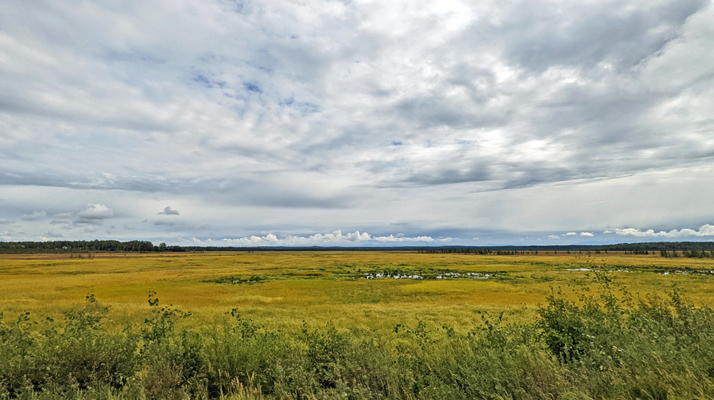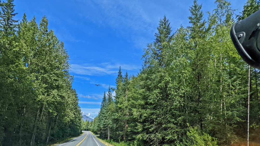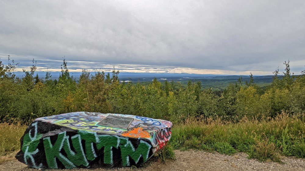 Wir bleiben noch einen Tag, um uns einfach an der Sonne und dem (fast) wolkenlosen Himmel zu erfreuen, bevor wir am nächsten Tag den Abschnitt nach Fairbanks unter die Räder nehmen. Dieser passiert Healy und Nenana (inkl. Alaska Railroad Museum, das wir aber auslassen) und verläuft ansonsten vorwiegend im grünen Kanal, mit einigen wenigen Blicken auf den gelegentlichen Sumpf. Ich kann Ozy überreden, zu einem im Milepost beschriebenen Aussichtspunkt abzufahren, von dem aus man einen Blick auf das Tal des Tanana River und – an einem klaren Tag (den wir heute nicht haben…) – sogar auf die Alaska Range haben soll.  Aber auch hier sind die Bäume schon so weit nachgewachsen, dass der Blick aufs Tal fast vollständig versperrt ist… (eine weitere «Sehenswürdigkeit» ist die auf einem grossen – stark versprayten – Stein montierte Gedenktafel für George A. Parks, den Namengeber dieses Highways).