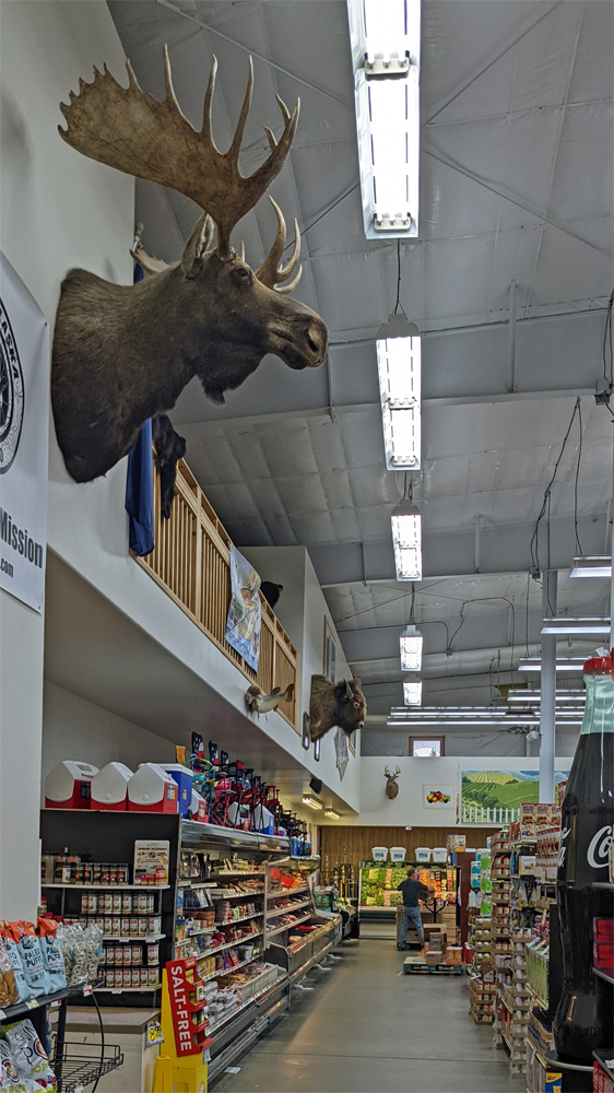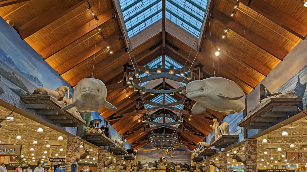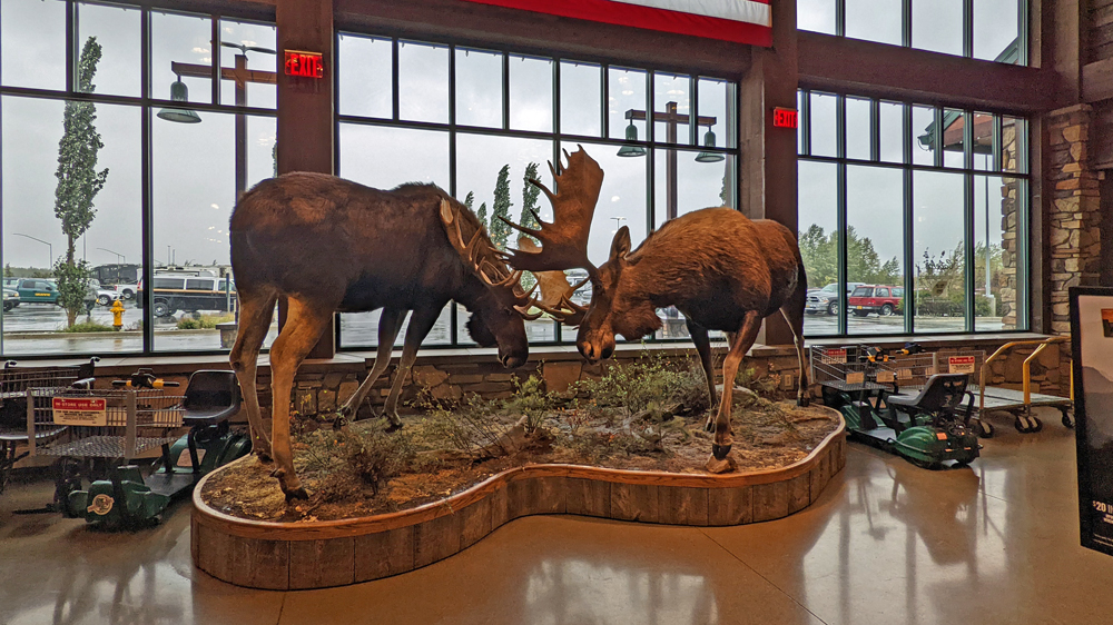 Wir gehen noch in den Cabela’s, wo wir die ausgestellten Tiere bewundern (hier sogar Wale – und ein Wasserflugzeug) und ich mich mit Blinkern und Haken etc., einem Filettiermesser und einer neuen Angelrute eindecke. Der nächste Lachs kann kommen!