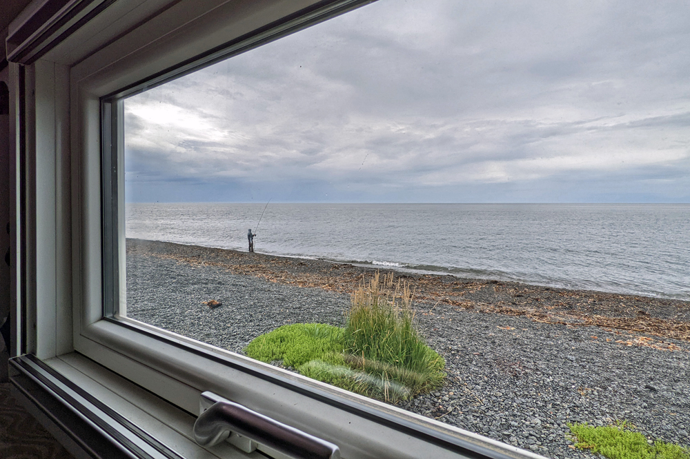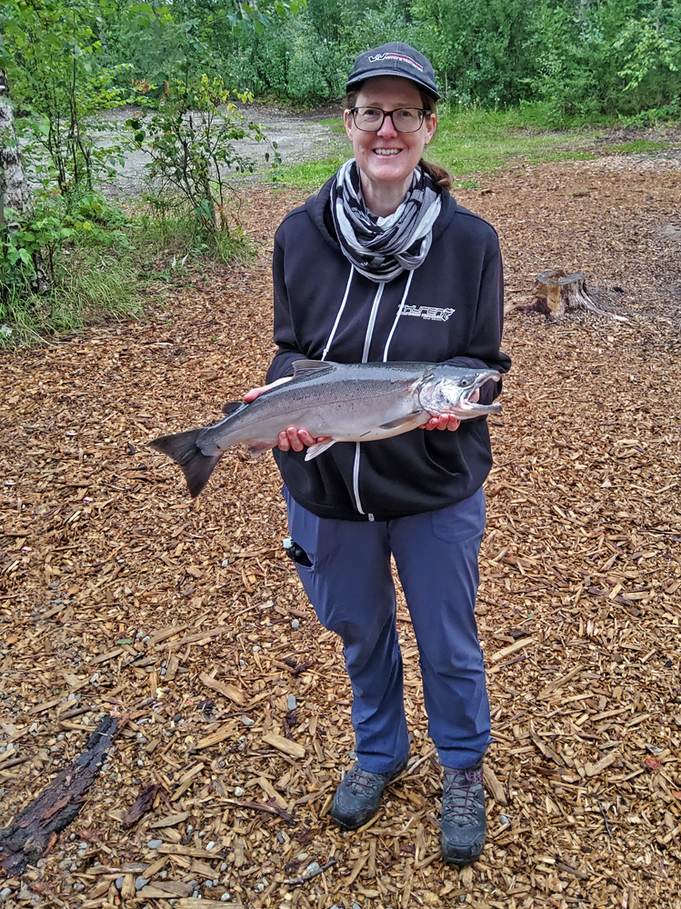 Die Einheimischen haben schliesslich Mitleid mit uns Greenhorns. Ein Fischer nimmt Jürgen unter seine Fittiche, lässt ihn ein paar Mal einen Lachs einholen und stattet ihn dann sogar mit einer Fliegenfischrute und Wathosen aus. Ich baue meine eigene Angelrute (bzw. vor allem den Haken-Teil) entsprechend um und probiere es mit nackten Beinen. Nun spüre ich auch tatsächlich ab und zu ein kurzes Vibrieren, aber irgendwie habe ich nicht das Herz, so richtig an der Schnur zu reissen, um einen Fisch «aufzuspiessen». Eine Anglerin schenkt mir schliesslich einen Humpie, anstatt ihn wieder hineinzuwerfen. Damit habe ich mein Ziel erreicht (wenn auch nicht ganz so, wie gedacht), und wir geniessen ganz dekadent Lachsspaghetti zum Abendessen.