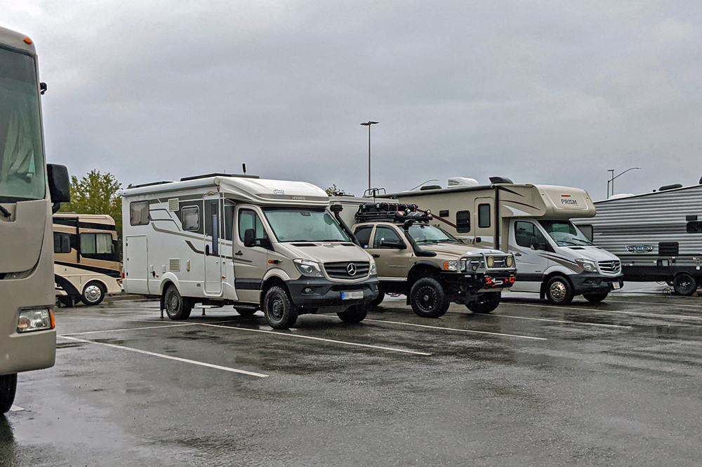 Anchorage selbst lassen wir dann aufgrund des schlechten Wetters aus und fahren direkt zu Cabela’s im Süden der Stadt, wo man gratis stehenbleiben darf. Als wir auf den – von zahlreichen Campern, Mietmobilen und Reisenden bevölkerten – Parkplatz kommen, entdecken wir zu unserer Überraschung «Kurma» von Gabi und Jürgen! Neben ihnen hat es noch Platz und es gibt ein freudiges Wiedersehen! – Das letzte Mal hatten wir uns im Oktober ’21 in Cancún getroffen. Wir waren die ganze Zeit über in Kontakt und wussten, dass sie auch auf dem Weg Richtung Alaska waren, hatten aber irgendwie nicht damit gerechnet, sie in Anchorage anzutreffen!