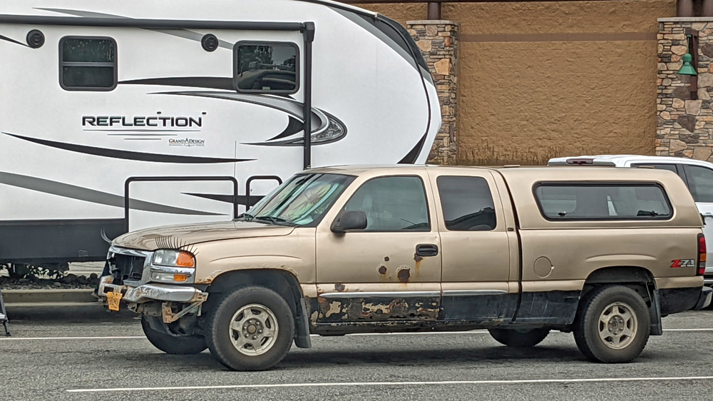 Als wir erneut die steile Strasse zum Whiskey Gulch Beach hinunterfahren, wo wir wieder übernachten wollen, sehen wir einen von der Strasse abgekommen Wohnanhänger mit einem Pickup, der sich vergeblich bemüht, den Anhänger aus dem Graben zu bekommen, da er zu leicht ist. Wir bieten unsere Hilfe an, die gerne angenommen wird. Zum Glück kommt unser Gefährt an der Havarie vorbei, so dass es am Strand gewendet werden kann und kurze Zeit darauf zieht Ozy gleich das ganze Gespann bis zur Strasse hinauf. Der Besitzer ist überglücklich und bietet als Dank ein Säckchen Marihuana an, das Ozy dankend ablehnt.